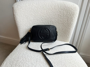 Gucci Soho Disco in Black Leather with pale gold hardware. This practical, cross body, camera style bag is compact in size but still fits a reasonable amount. Can be worn over shoulder or cross body. Gucci's most popular style and goes with any outfit, dressed up or down.