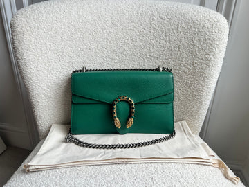 Gucci Small Dionysus GG Shoulder Bag in Green Grained Leather with silver hardware. The small Dionysus shoulder bag features the tiger head closure with Swarovski crystals. This iconic style is perfect for day or evening use. The sliding chain strap can be worn lengthened or doubled up over the shoulder or in the crook of the arm. Note the strap is not long enough to be worn cross body.