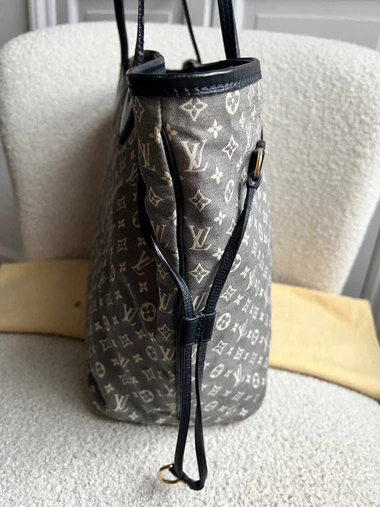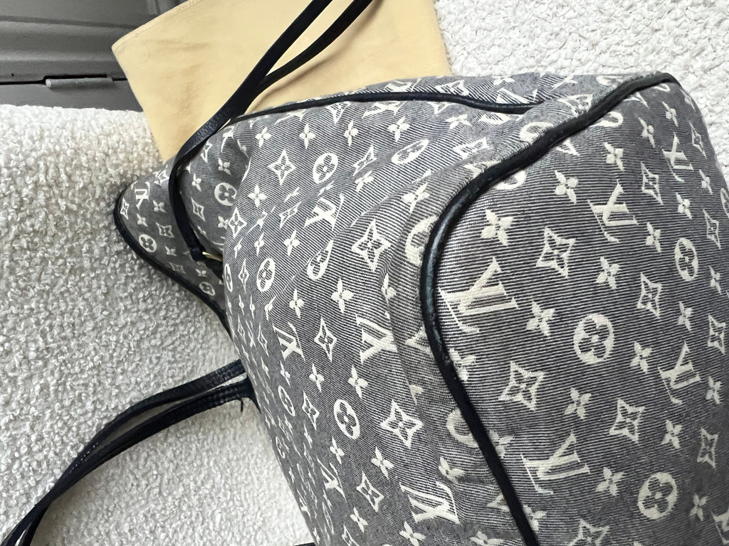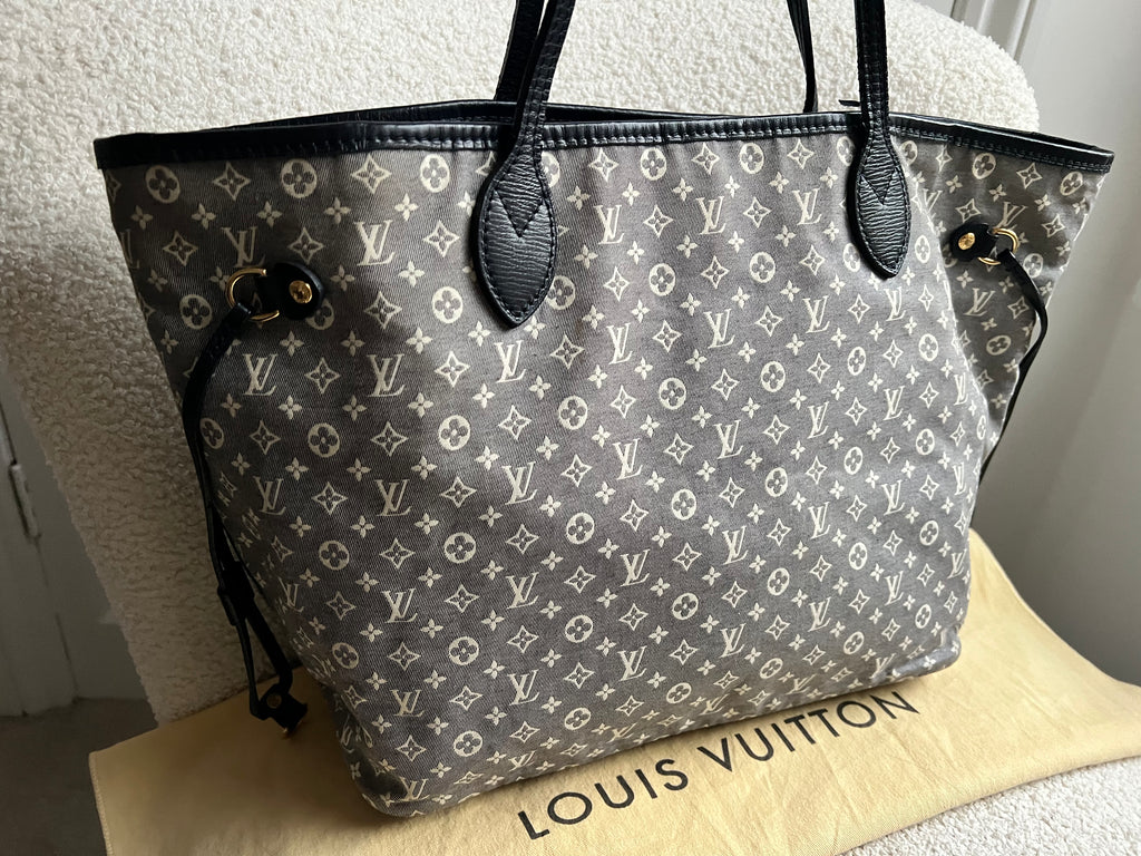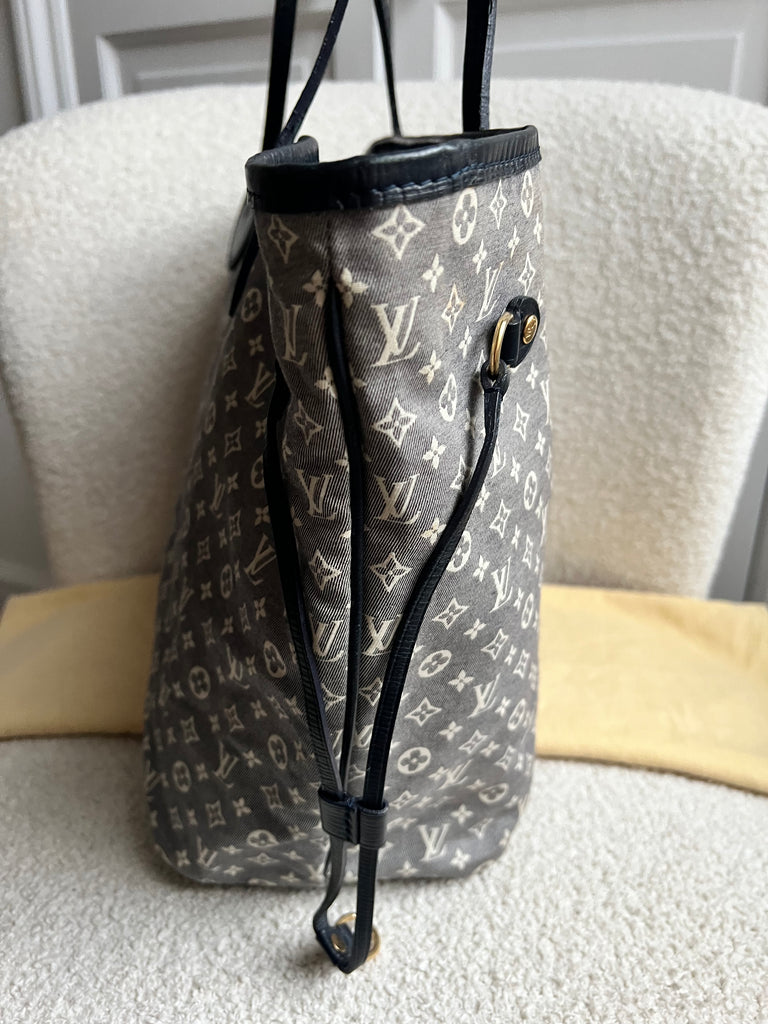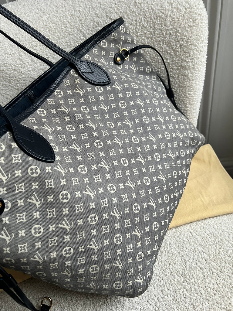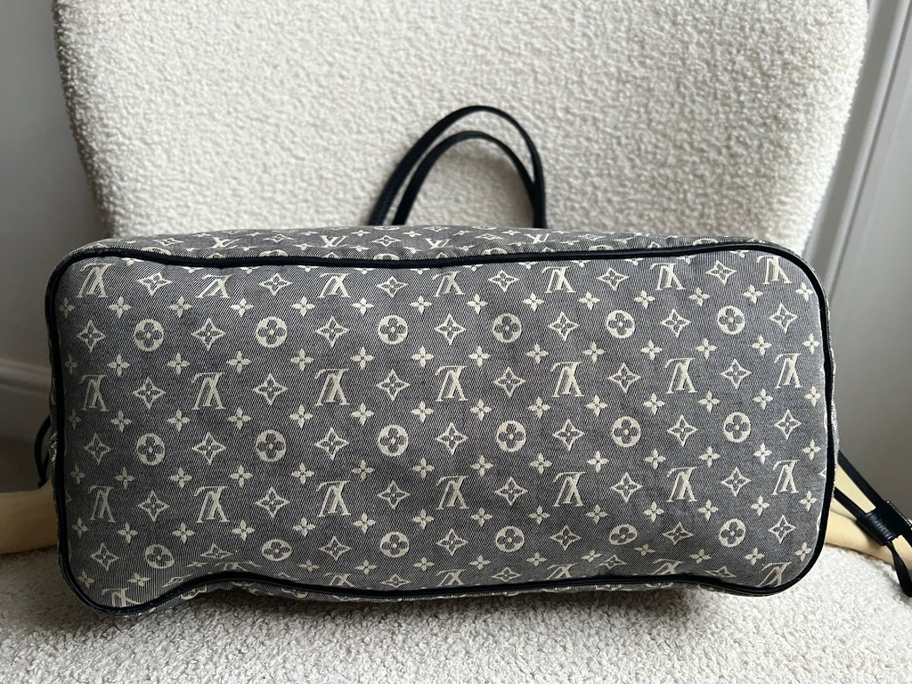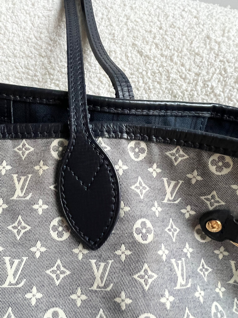Louis Vuitton Neverfull MM Mini Lin in Monogram Idylle canvas with dark navy leather trim. The "middle" size of the Neverfull, this one of Louis Vuitton's most popular style. Both trendy and chic, ideal for day to day or work use. Slightly slouchy in shape, this bag can be carried in the crook of the arm or comfortably over shoulder. This canvas print is softer than the coated canvas and does not up preloved very often.