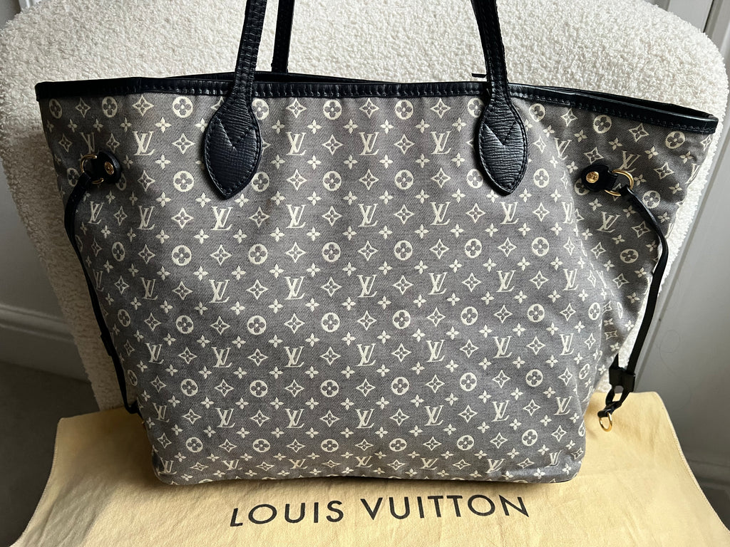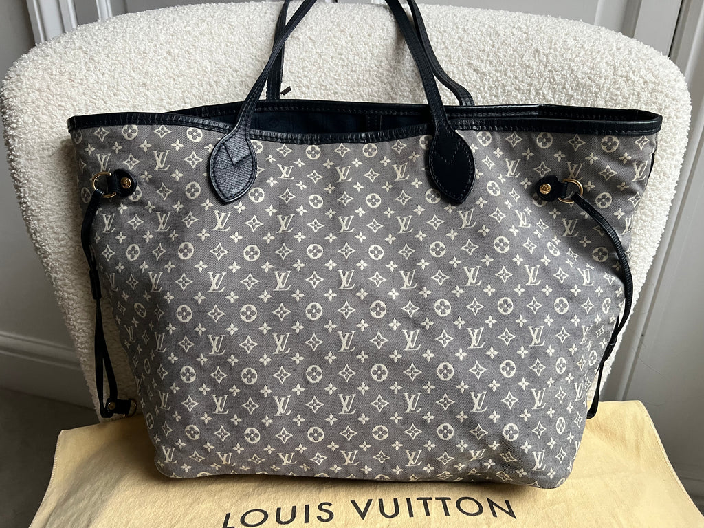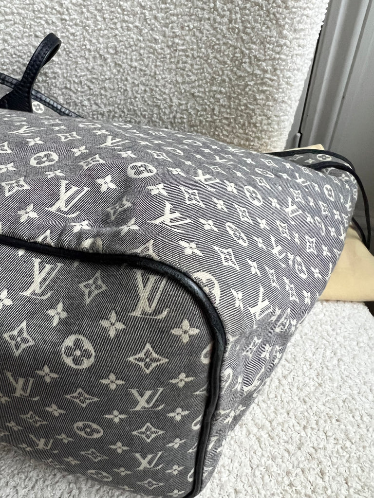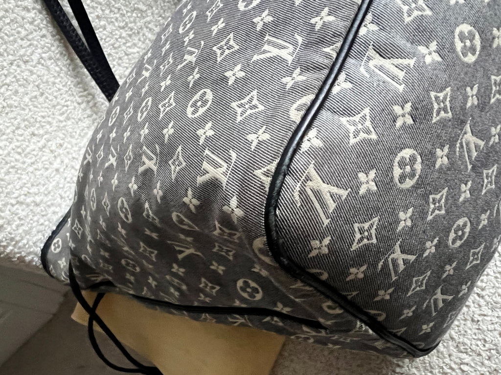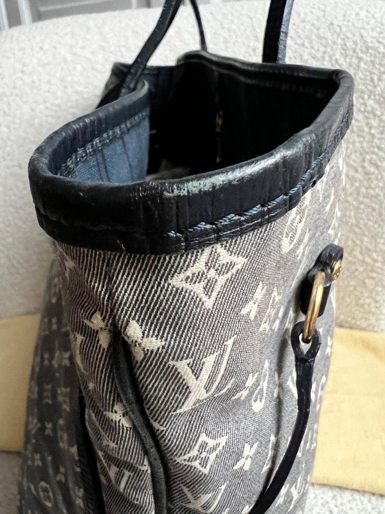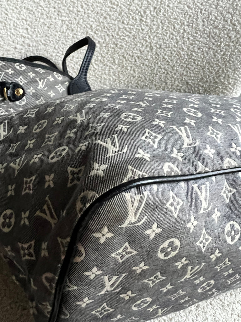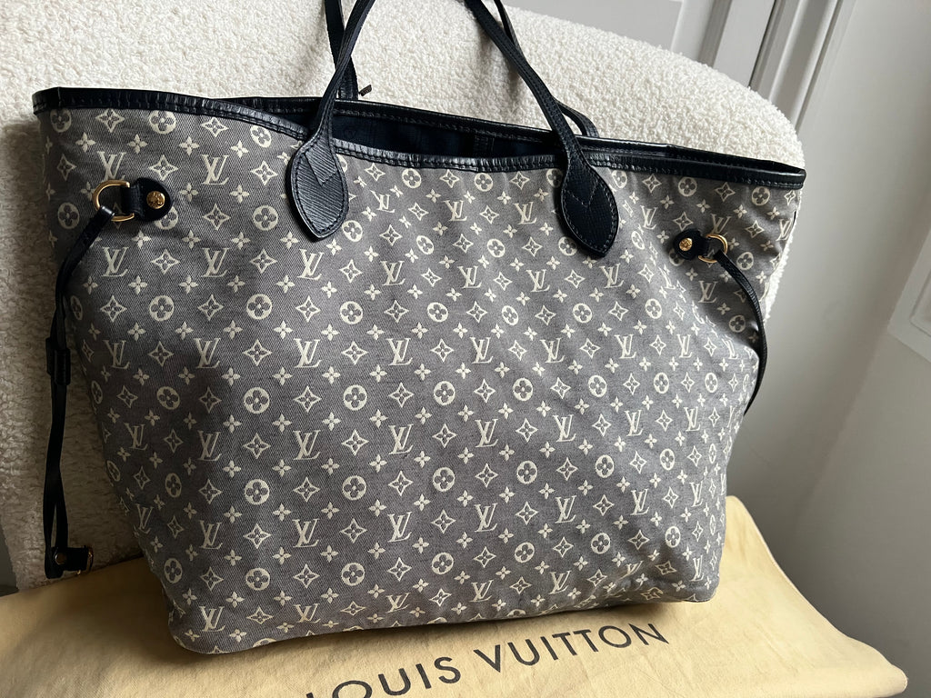 Louis Vuitton Neverfull MM Mini Lin in Monogram Idylle canvas with dark navy leather trim. The "middle" size of the Neverfull, this one of Louis Vuitton's most popular style. Both trendy and chic, ideal for day to day or work use. Slightly slouchy in shape, this bag can be carried in the crook of the arm or comfortably over shoulder. This canvas print is softer than the coated canvas and does not up preloved very often.
