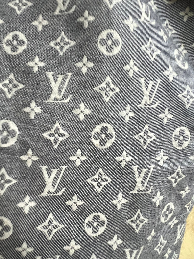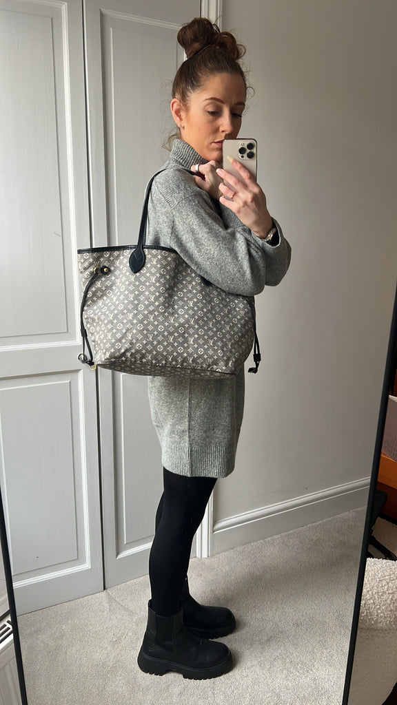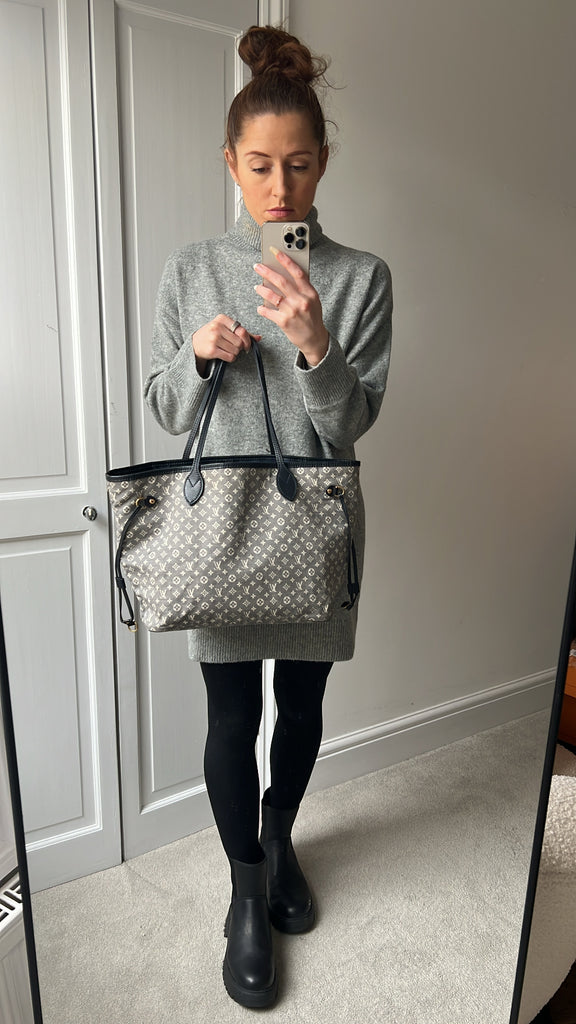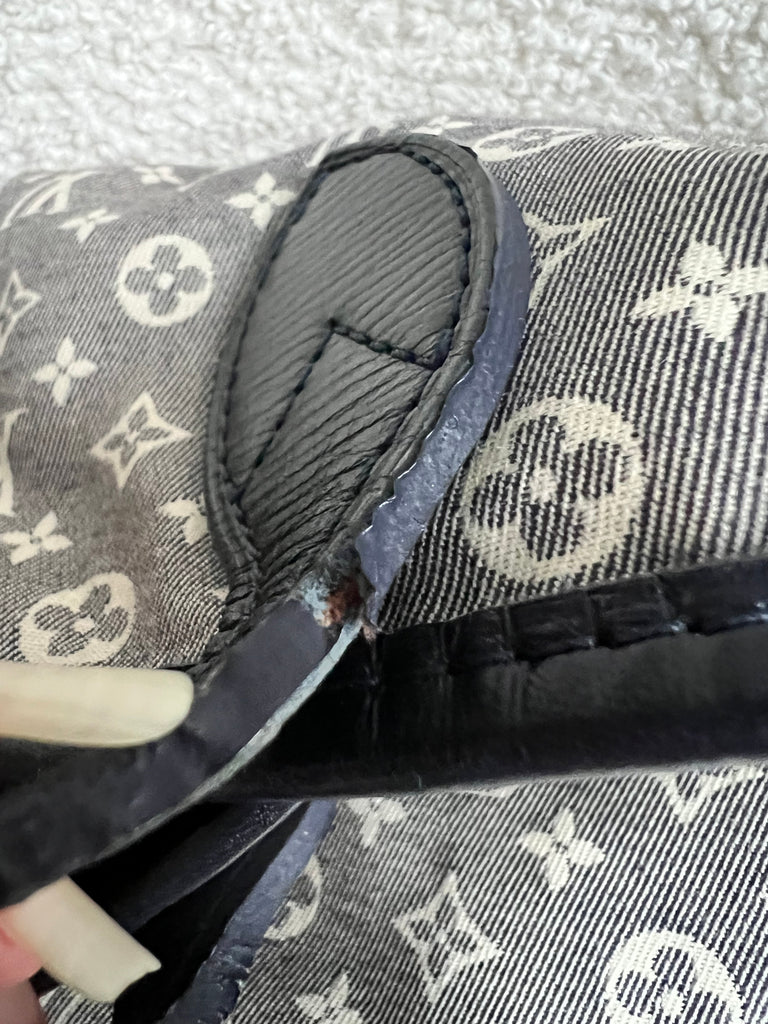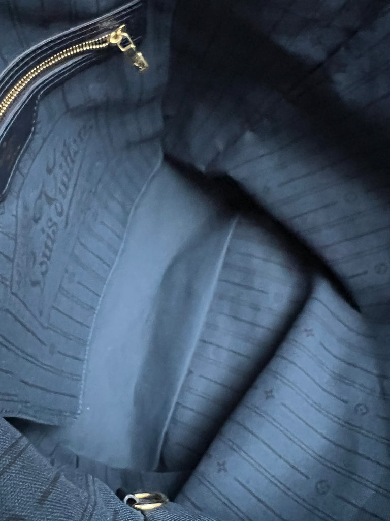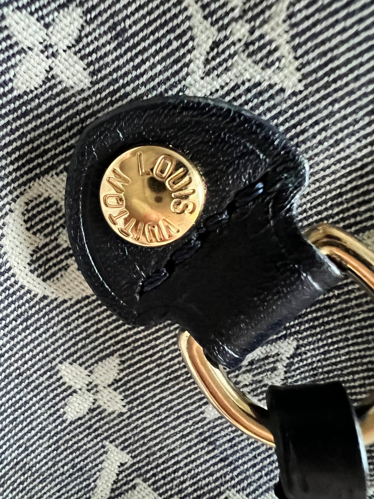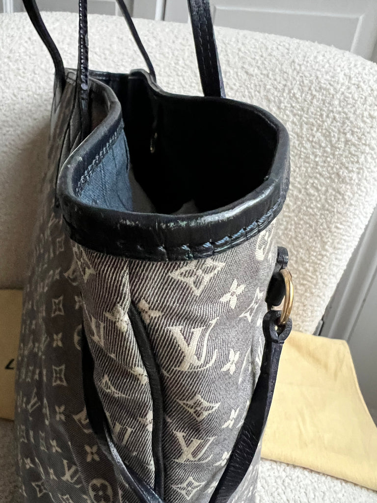Louis Vuitton Neverfull MM Mini Lin in Monogram Idylle canvas with dark navy leather trim. The "middle" size of the Neverfull, this one of Louis Vuitton's most popular style. Both trendy and chic, ideal for day to day or work use. Slightly slouchy in shape, this bag can be carried in the crook of the arm or comfortably over shoulder. This canvas print is softer than the coated canvas and does not up preloved very often.