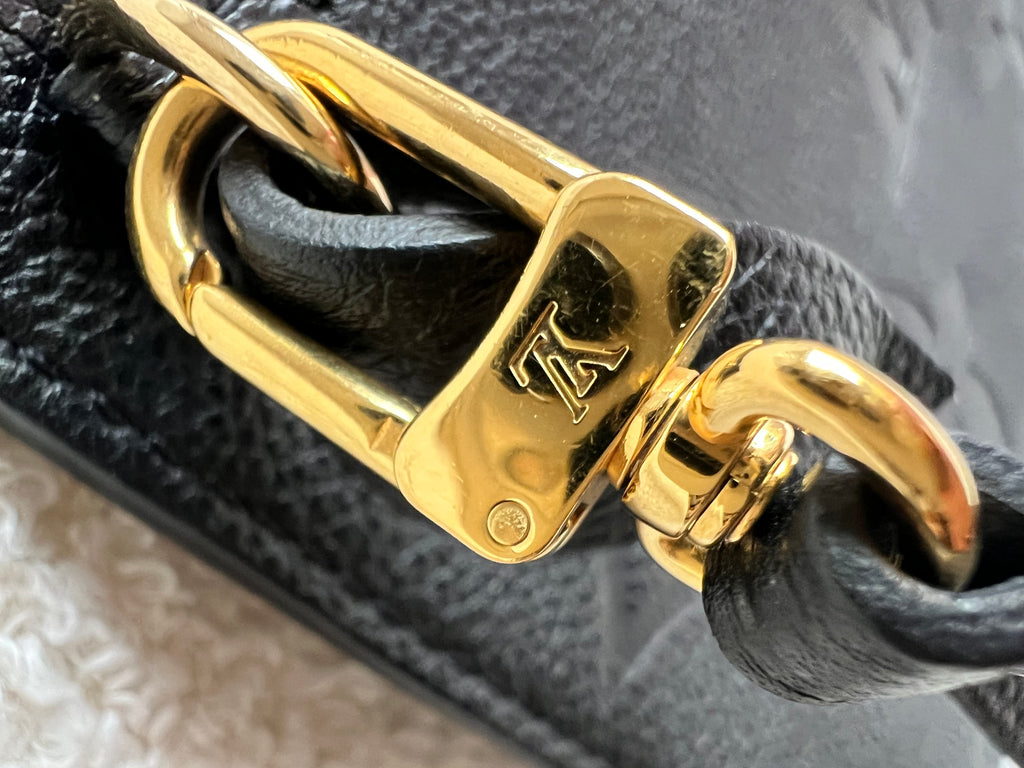 Louis Vuitton Pouch in Black Monogram Embossed Empreinte leather. This handy pouch comes with the Neverfull MM. Zip top closure, can be used as a clutch, or attached to the inside of a bag using the short strap.