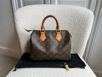 Louis Vuitton Speedy 25 in Monogram canvas with gold hardware. The classic speedy style is one of Louis Vuitton's most popular styles and is often sold out online and in store. This style is timeless and elegant and is perfect for day to day use. Slightly slouchy in shape, the Speedy features rolled leather handles and signature padlock and can be carried by hand or in the crook of the arm. 2000 year.