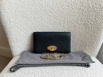 Mulberry Bayswater Clutch in Black Glossy Goat Leather with pale gold hardware. This wallet on chain style is ideal for evening or event wear. Flap and postman's lock closure, the chain strap is detachable. Therefore can be worn as a cross body clutch or carried in hand as a handheld clutch.