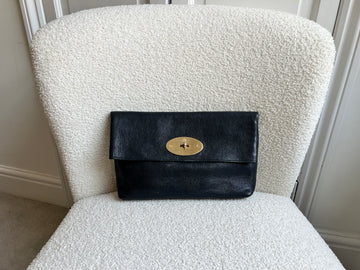 Mulberry Clemmie Clutch in Black Glossy Goat leather with pale gold hardware. Soft and slightly slouchy in shape, this handheld clutch is both stylish and sophisticated. Perfect for evening or event wear for those who prefer handheld clutches. Holds a reasonable amount inside and features postmans lock closure and fold over top. now discontinued, this highly sought after style is only available preloved.