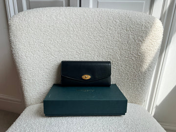 Mulberry Darley Wallet in Black Small Classic Grain Leather with gold hardware. The postman's lock is an iconic Mulberry signature, and this long wallet combines the popular hardware with practical space inside, featuring various pockets and compartments.