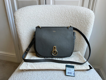 Mulberry Soft Amberley Satchel in Grey Heavy Grain leather with soft gold hardware. Inspired from traditional equestrian style, this satchel features the classic Rider's Lock. Slightly slouchy in style, this satchel can be used for day to day or work wear. Can be worn comfortably cross body using the long adjustable strap. This newer most recent version of the Amberley satchel. Slouchy when empty.