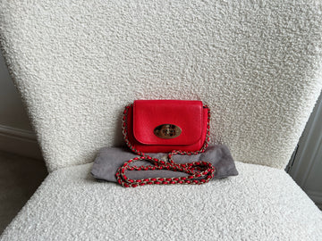 Mulberry Mini Lily in Hibiscus Red Small Classic Grain Leather with gold hardware. The Lily is an effortlessly elegant style with a compact shape. The ultimate evening bag, this style can also be used for day or event wear. The woven leather and chain strap can be only be worn long on this mini version. Can fit a small mobile phone but is snug. Note strap cannot be doubled up like larger sizes of the lily.