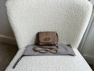 Mulberry Mini Lily in Metallic Mushroom Leather with gold hardware. The Lily is an effortlessly elegant style with a compact shape. The ultimate evening bag, this style can also be used for day or event wear. The woven leather and chain strap can be only be worn long on this mini version. Can fit a standard iPhone at an angle but is snug. The highly sought after Metallic Mushroom colour is difficult to get a hold of as is now discontinued.