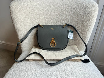 Mulberry Small Amberley Satchel in Charcoal Grey small classic grain with gold hardware. Inspired from traditional equestrian style, this satchel features the classic Rider's Lock. Structured in shape, this satchel can be used for day to day or work wear. Can be worn comfortably cross body using the long adjustable strap. Also comes with braided iris handle so can also be carried in hand using this top handle.