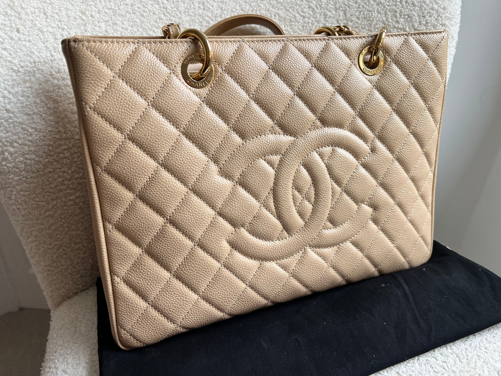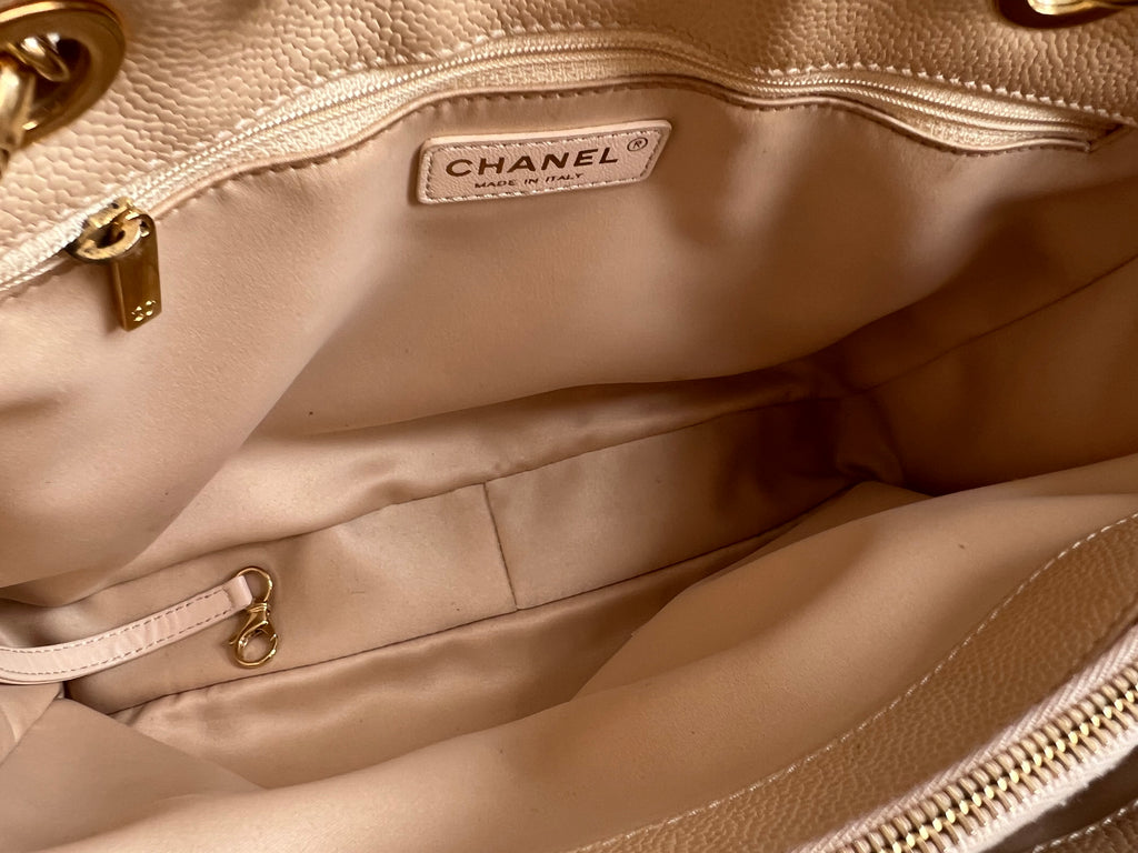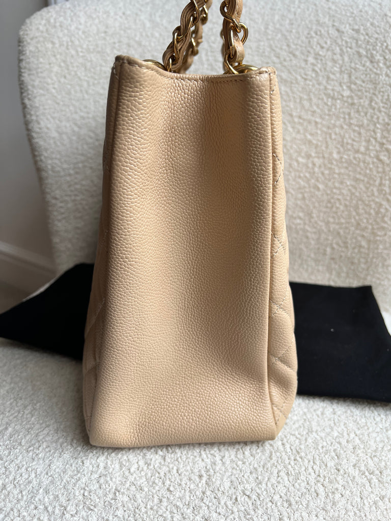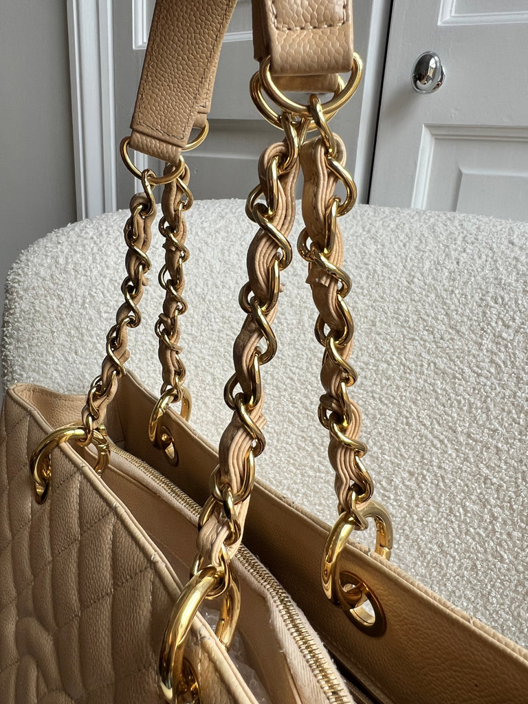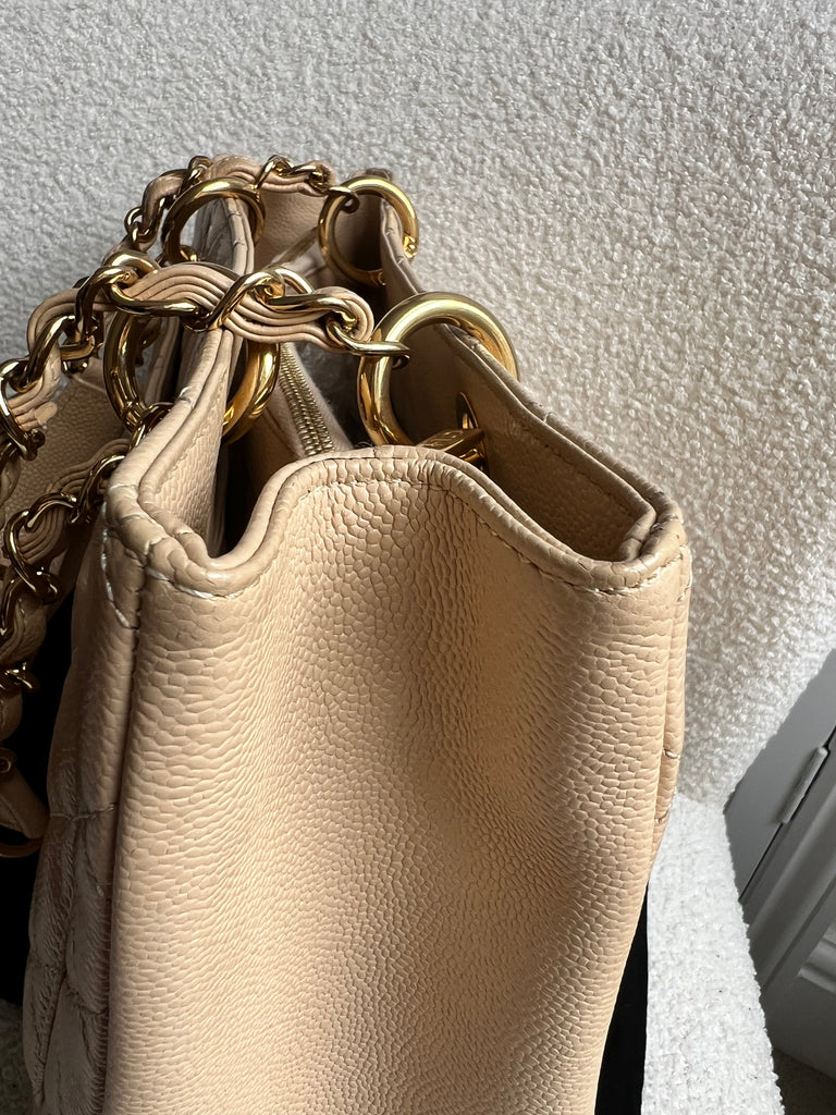 Chanel Grand Shopper Tote (GST) in Light Beige Caviar Leather with gold hardware. This very popular chain tote is sadly now discontinued and only available to buy preloved. Great opportunity to own a practical, iconic and sophisticated Chanel bag without the same price tag as the classic flap styles. Perfect for day or evening use and the caviar leather is very resilient and durable. Can be carried in the crook of the arm or over shoulder using the chain straps.