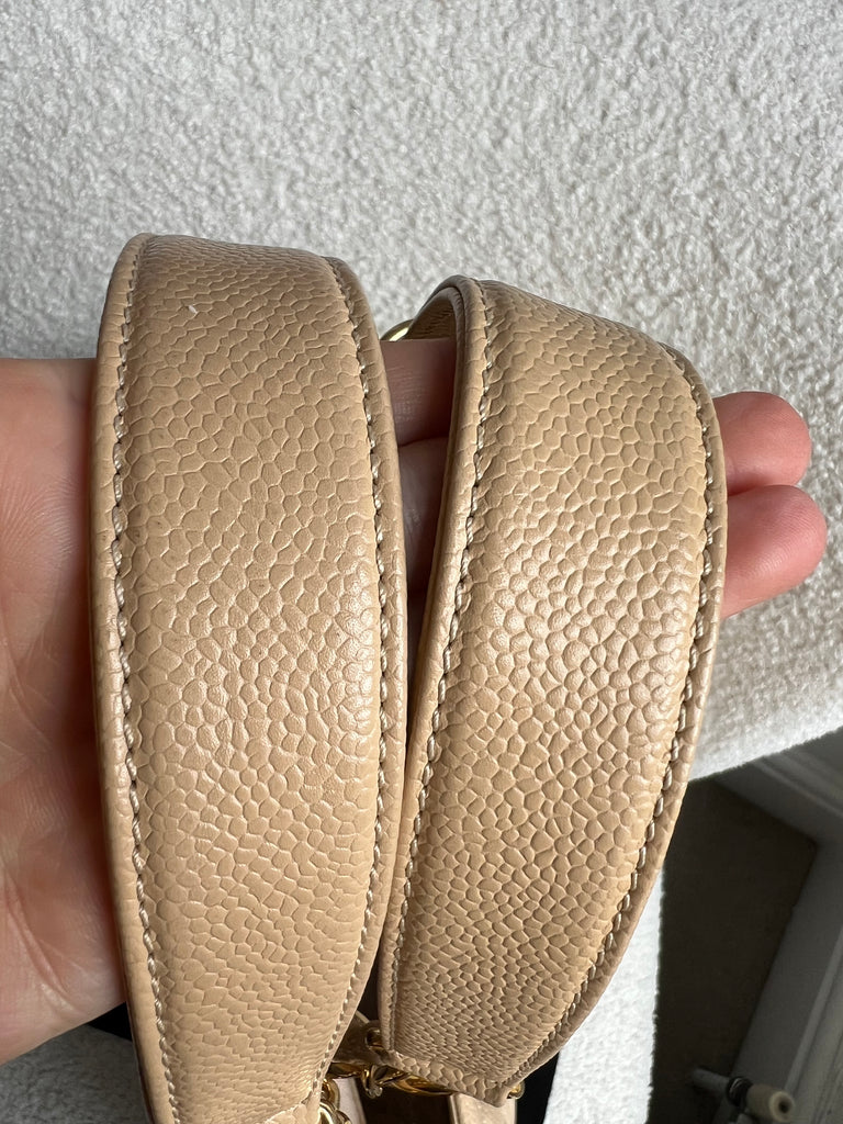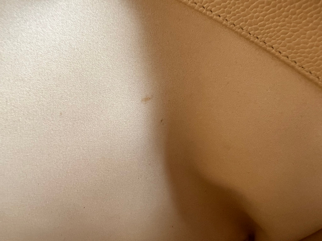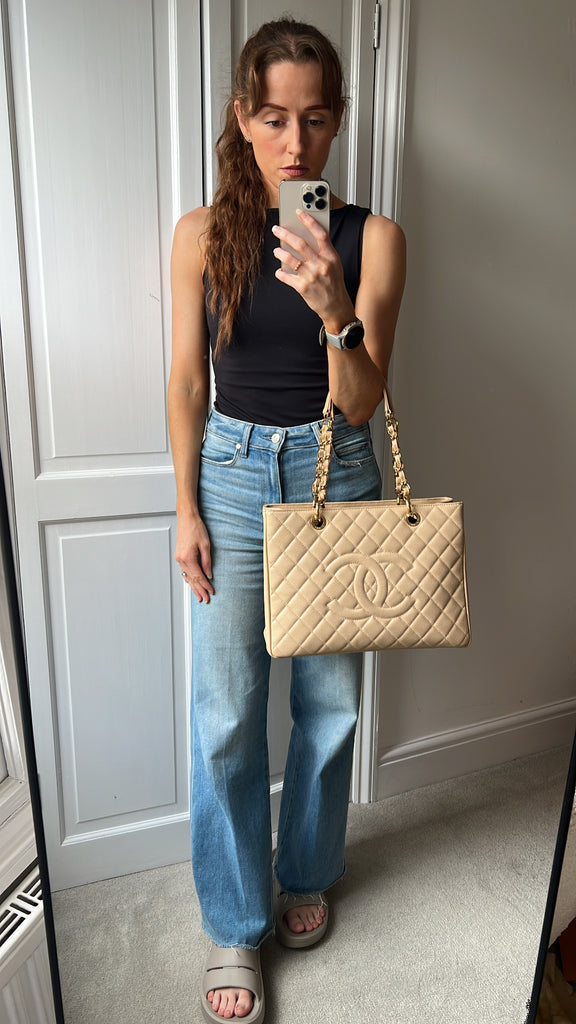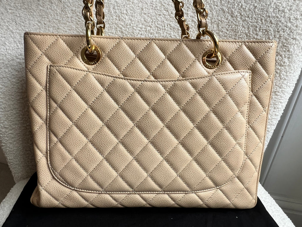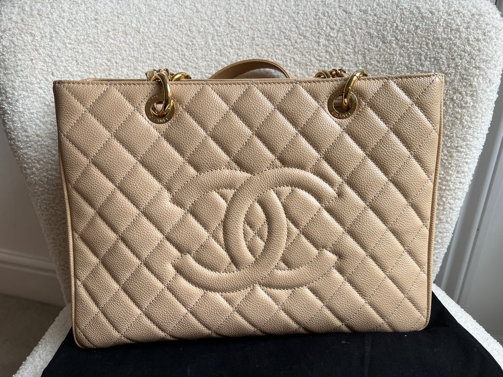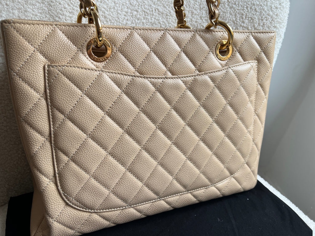 Chanel Grand Shopper Tote (GST) in Light Beige Caviar Leather with gold hardware. This very popular chain tote is sadly now discontinued and only available to buy preloved. Great opportunity to own a practical, iconic and sophisticated Chanel bag without the same price tag as the classic flap styles. Perfect for day or evening use and the caviar leather is very resilient and durable. Can be carried in the crook of the arm or over shoulder using the chain straps.