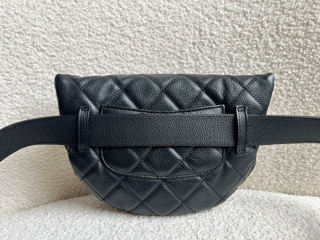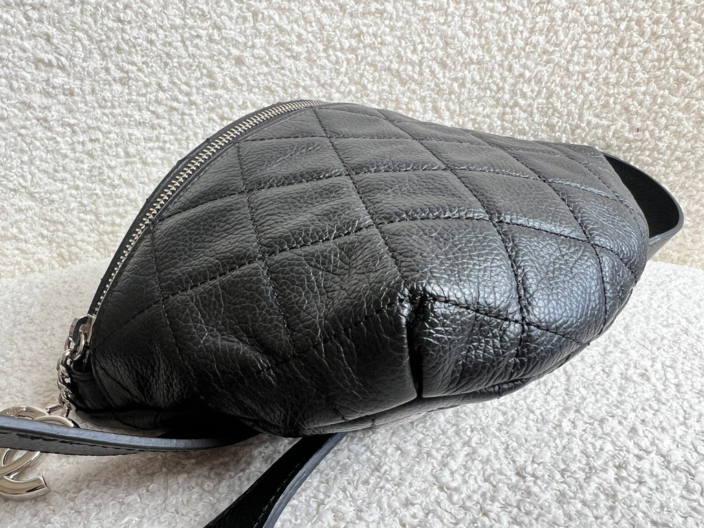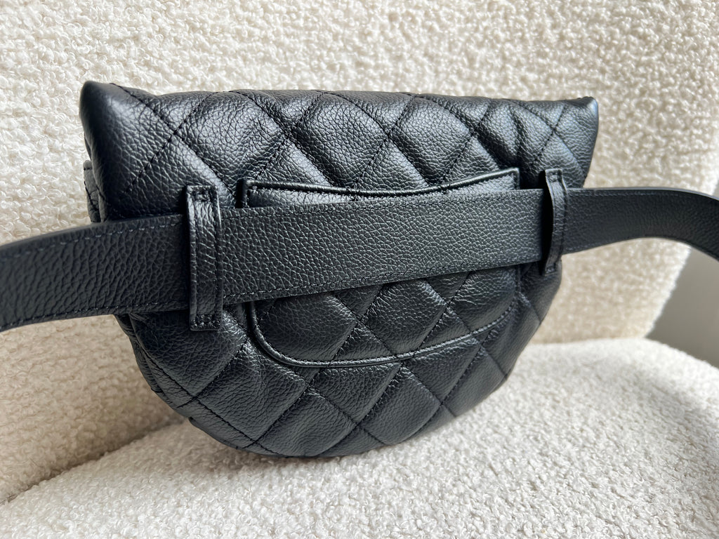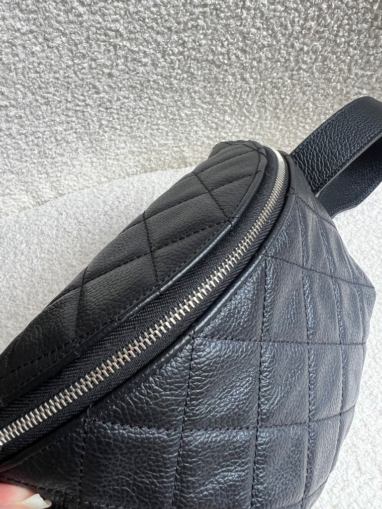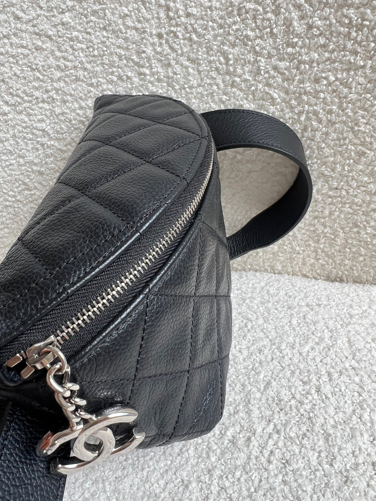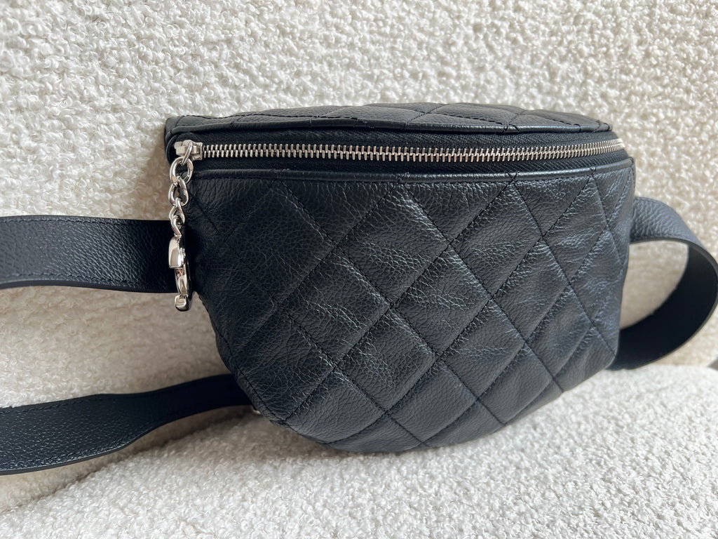Chanel Waist Belt bag Bumbag in Black Caviar with silver hardware. The Chanel Quilted Belt Bum Bag in Black is a stylish and functional accessory that combines the brand’s signature quilted leather design with the convenience of a belt bag. Crafted from black caviar, known for its robustness and durability. This is part of the Chanel uniform.