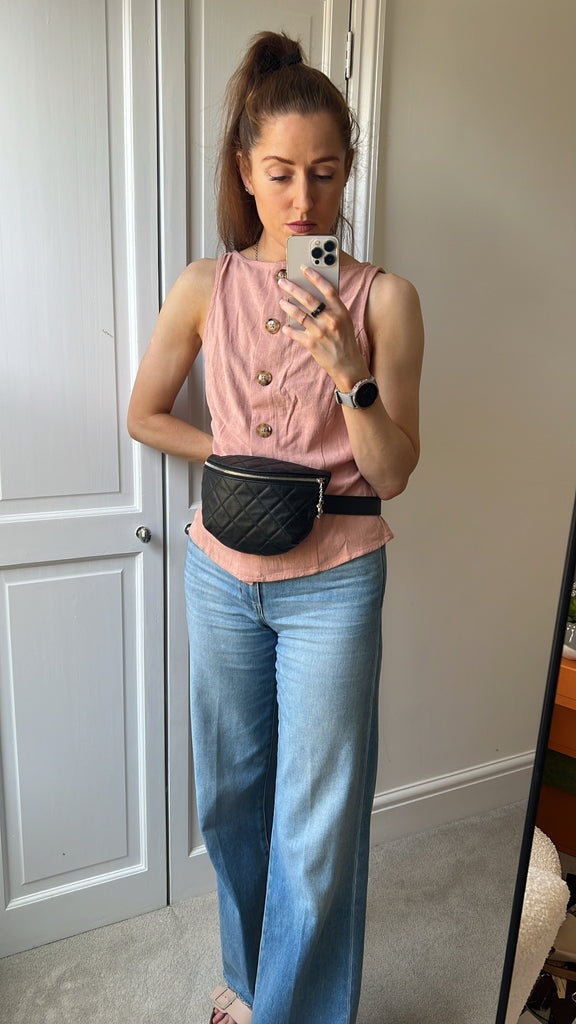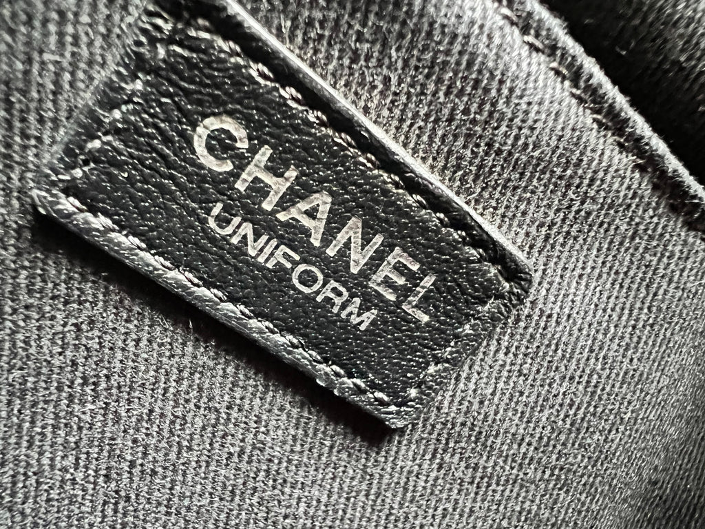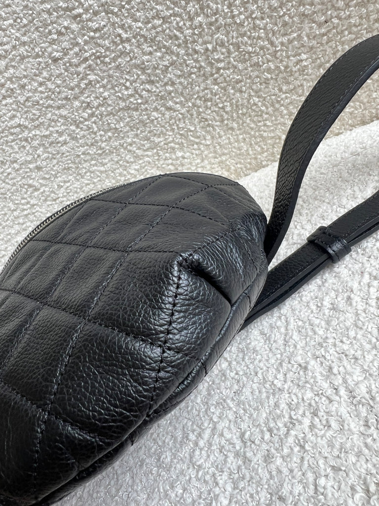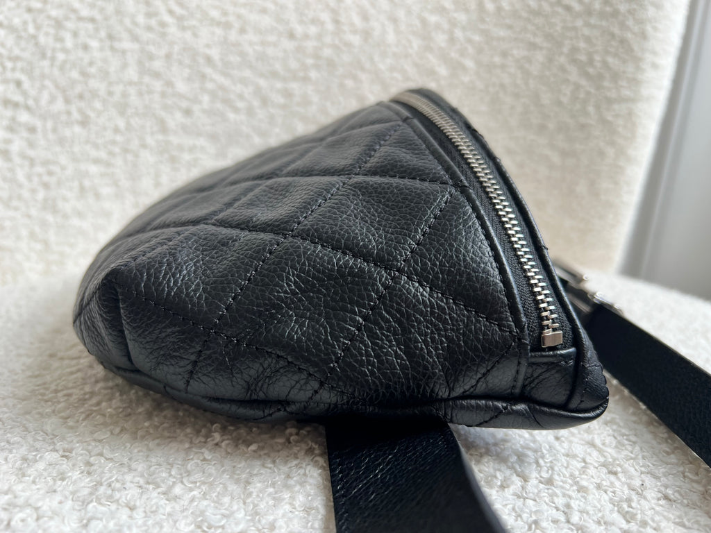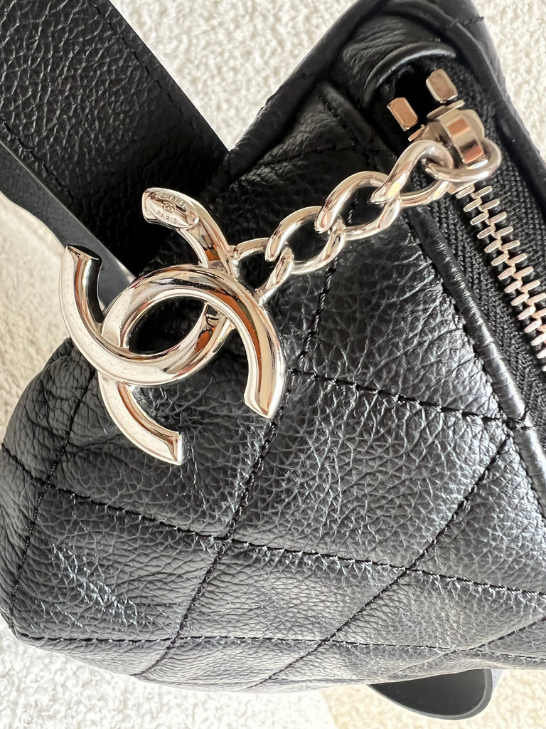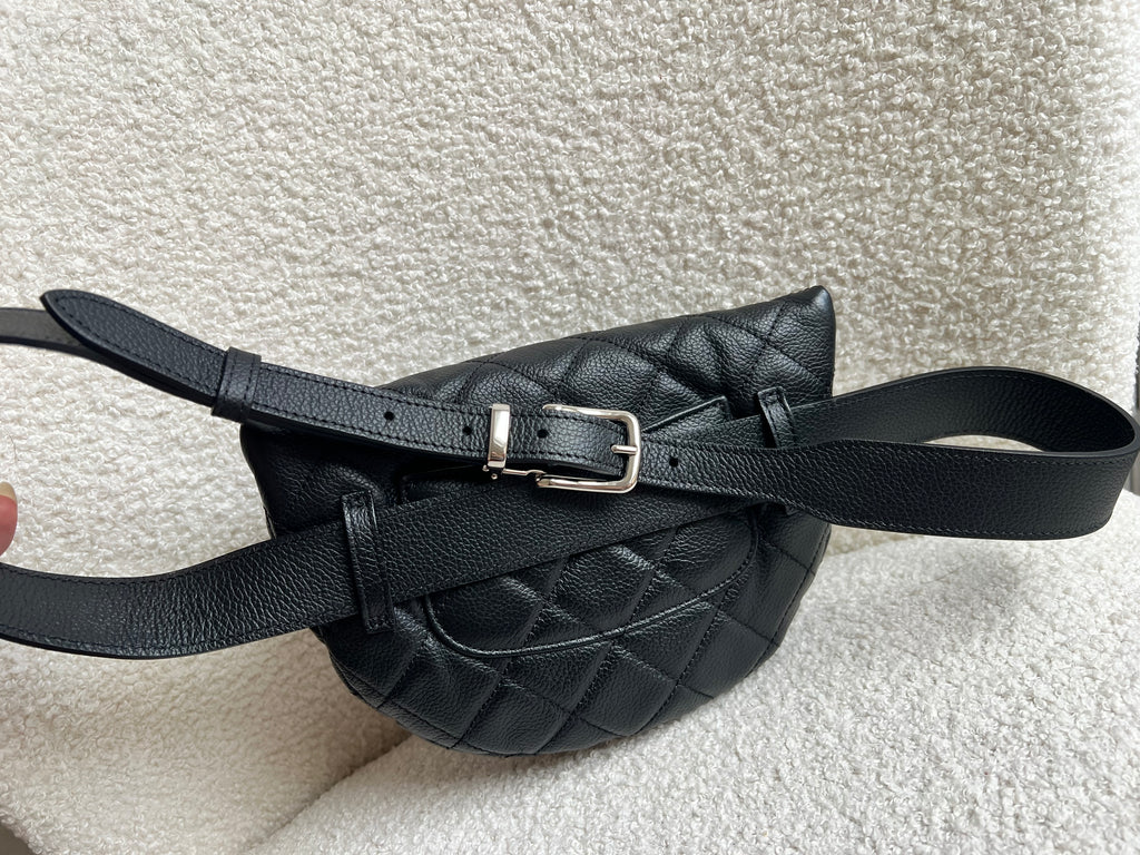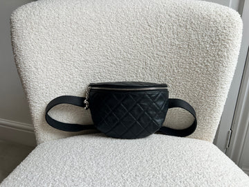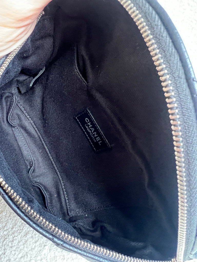 Chanel Waist Belt bag Bumbag in Black Caviar with silver hardware. The Chanel Quilted Belt Bum Bag in Black is a stylish and functional accessory that combines the brand’s signature quilted leather design with the convenience of a belt bag. Crafted from black caviar, known for its robustness and durability. This is part of the Chanel uniform.