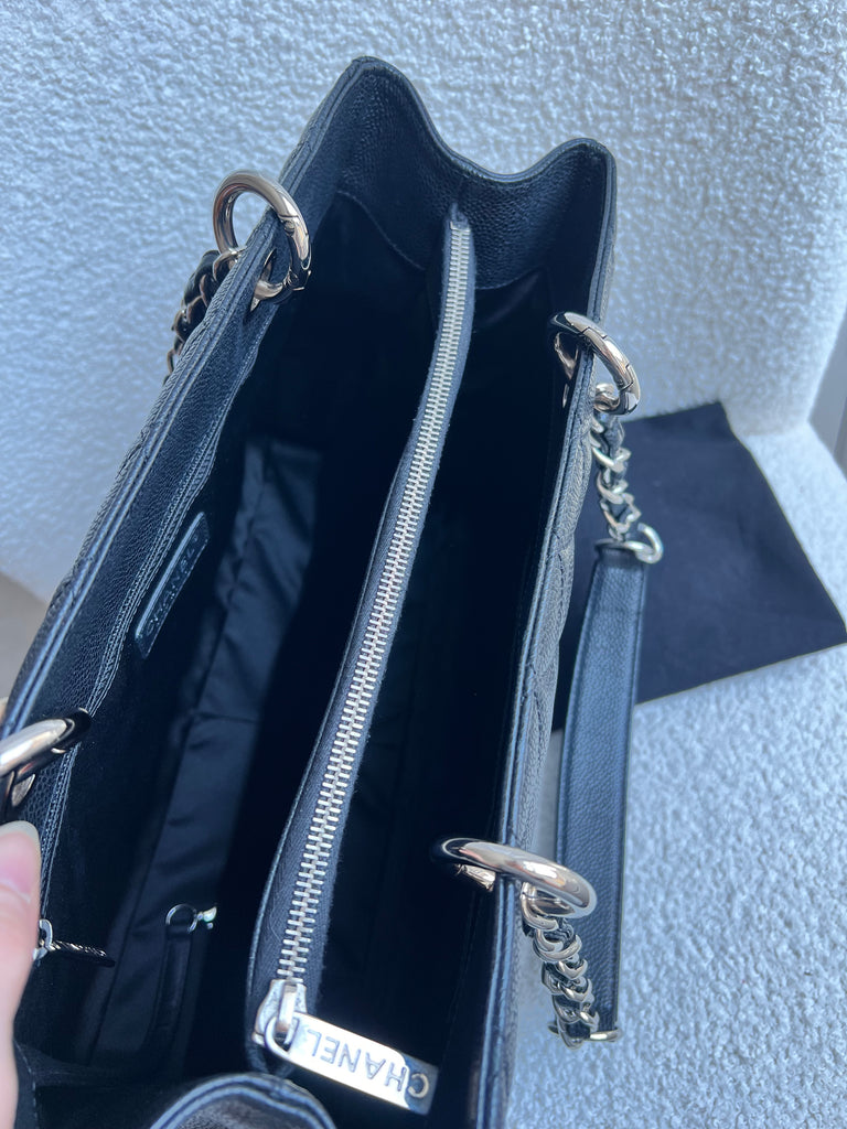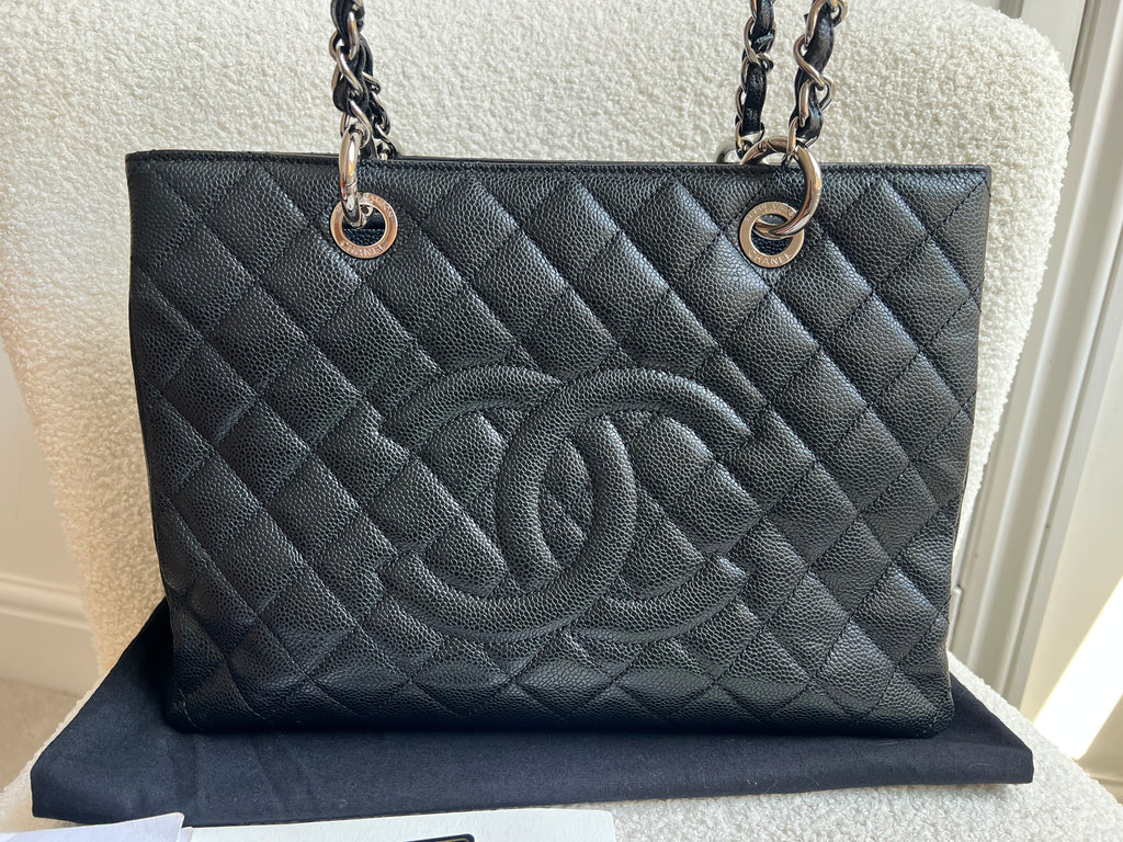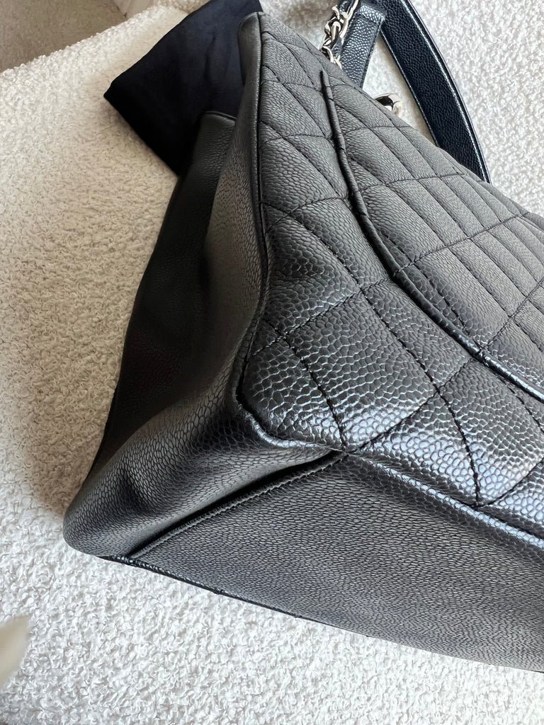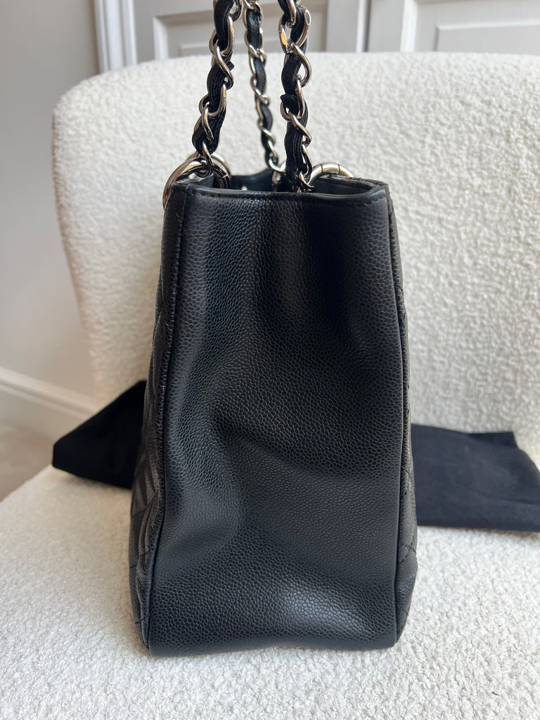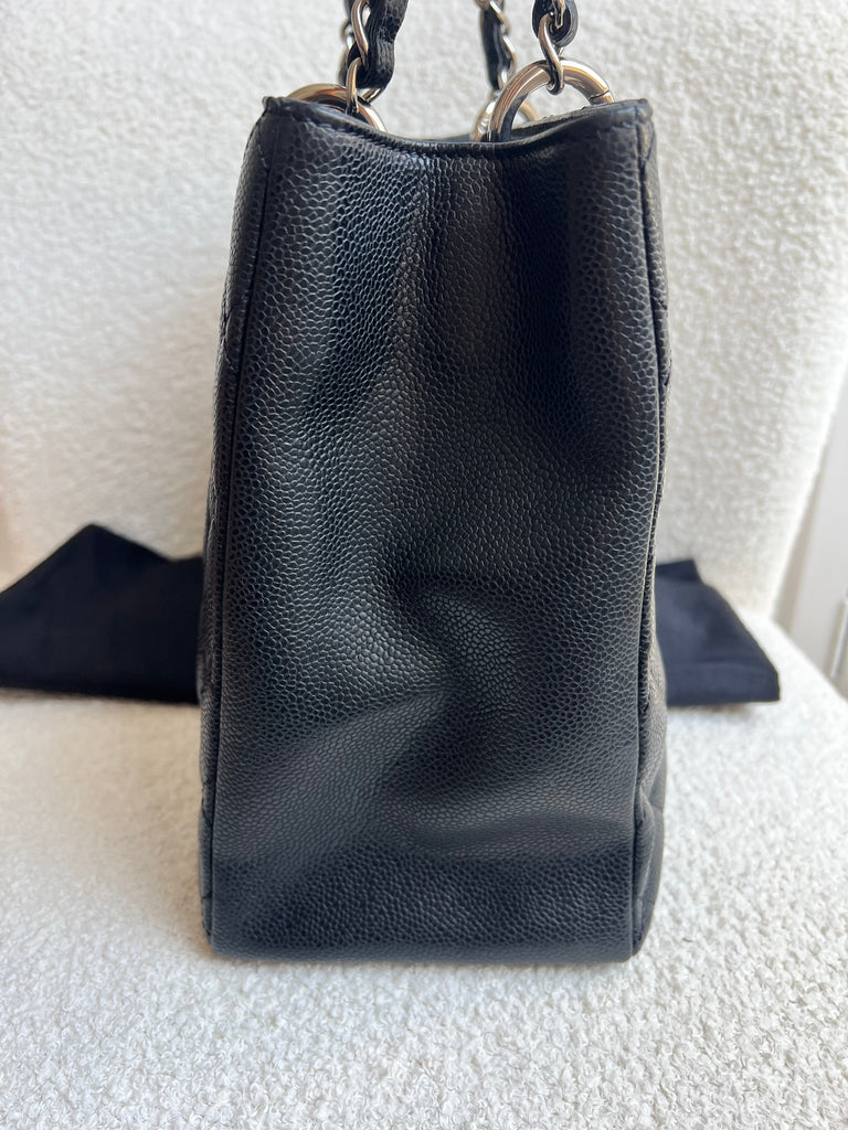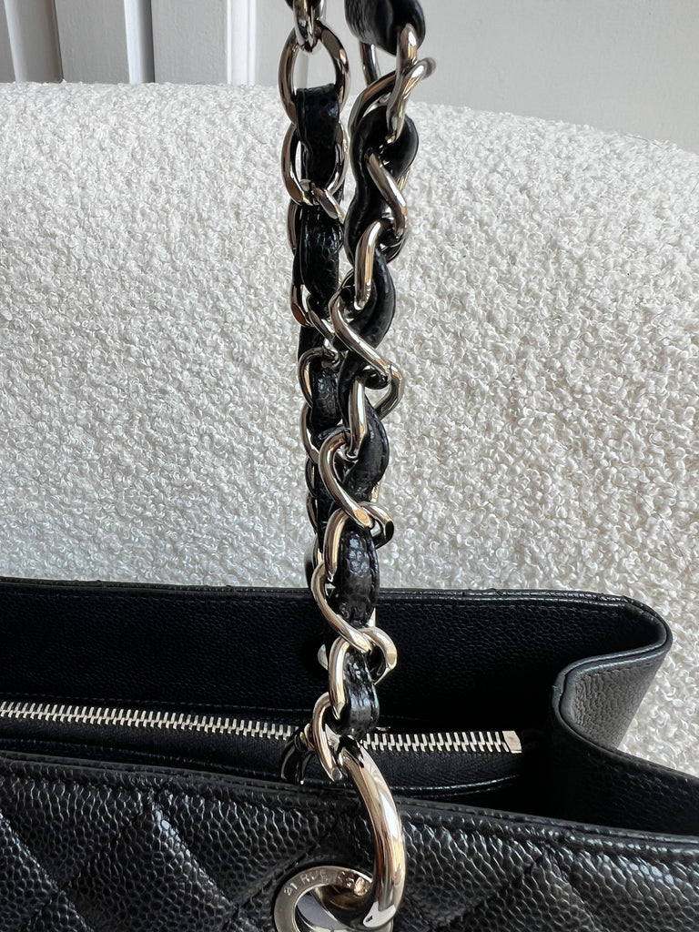 Chanel Grand Shopper Tote (GST) in Black Caviar Leather with silver hardware. This very popular chain tote is sadly now discontinued and only available to buy preloved. Great opportunity to own a practical, iconic and sophisticated Chanel bag without the same price tag as the classic flap styles. Perfect for day or evening use and the caviar leather is very resilient and durable. Can be carried in the crook of the arm or over shoulder using the chain straps.