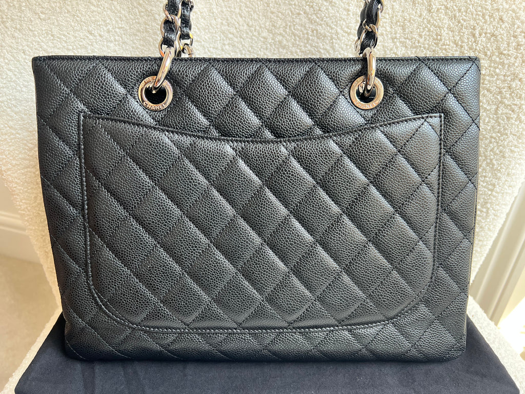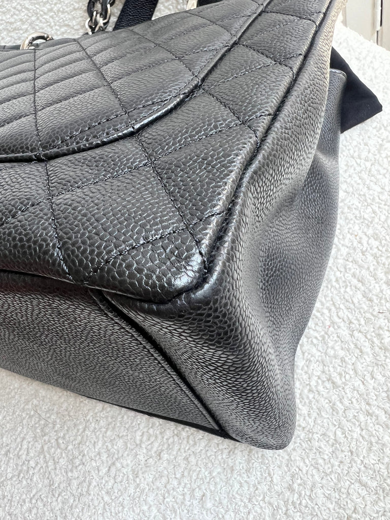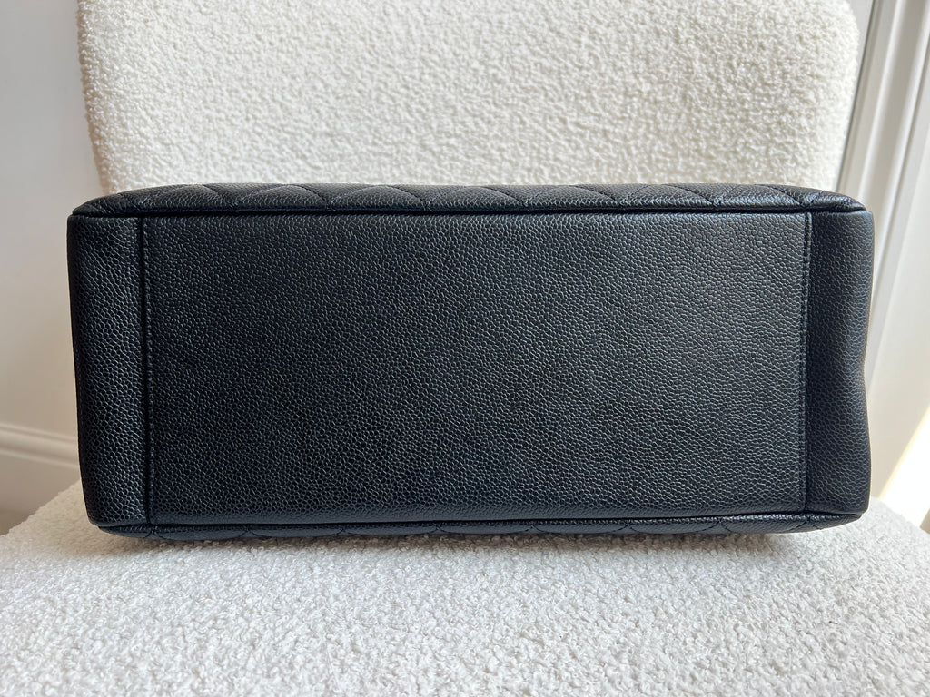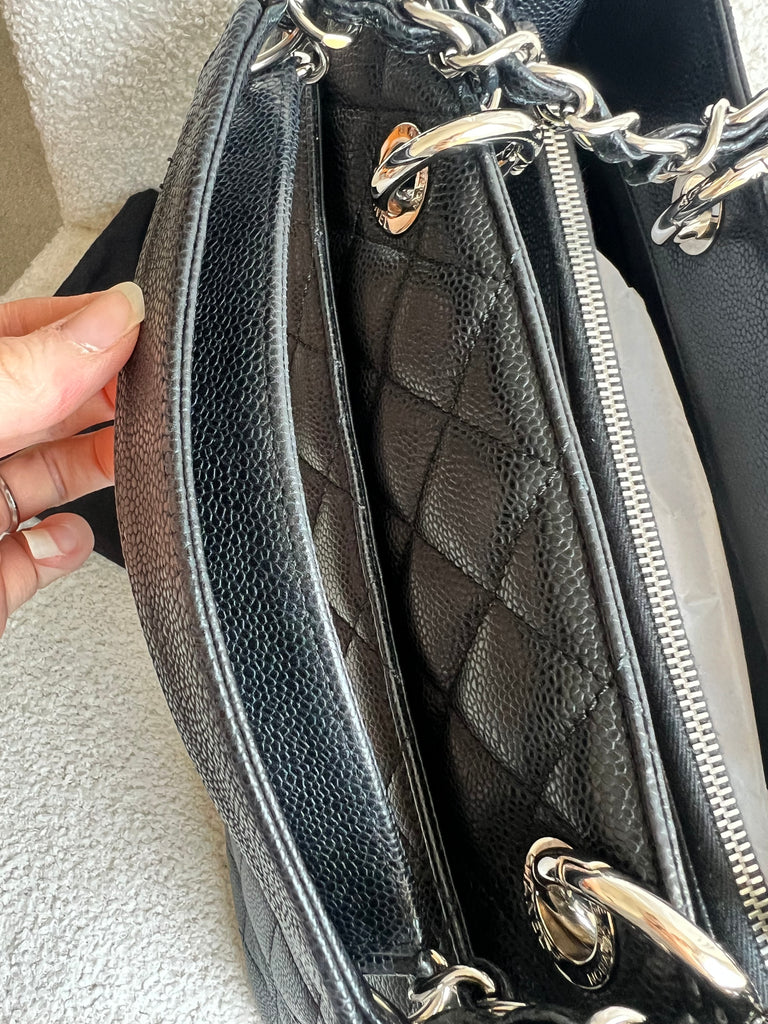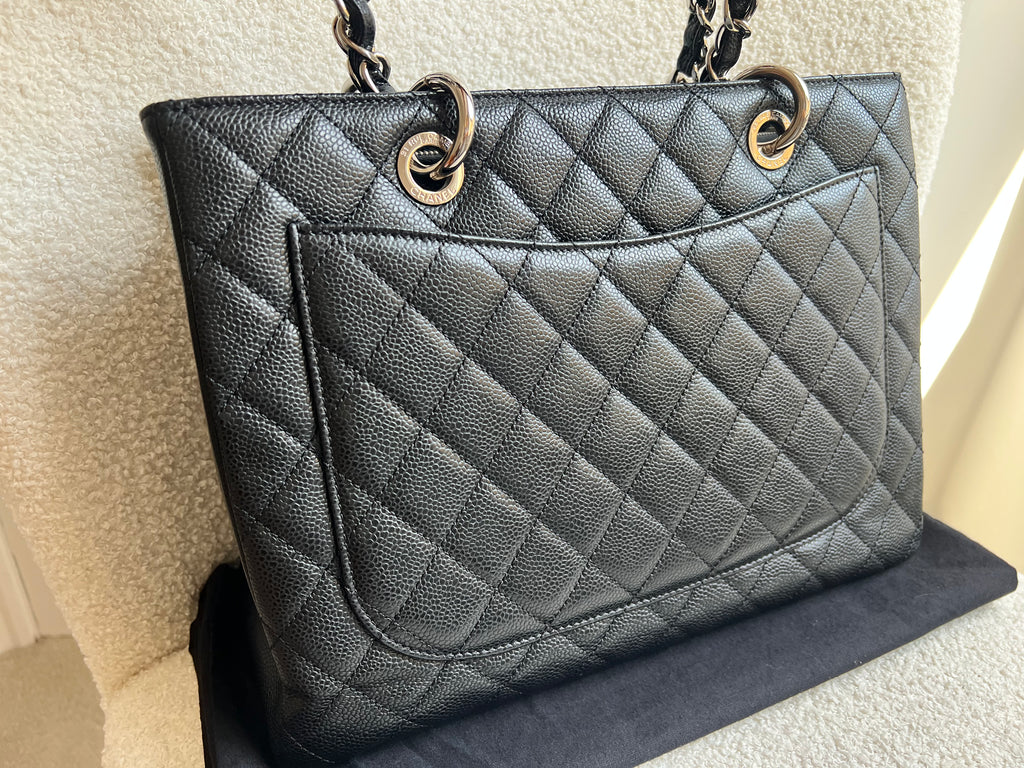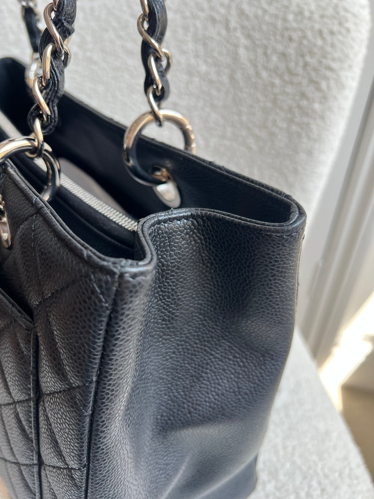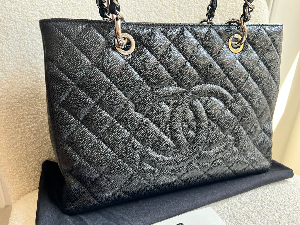 Chanel Grand Shopper Tote (GST) in Black Caviar Leather with silver hardware. This very popular chain tote is sadly now discontinued and only available to buy preloved. Great opportunity to own a practical, iconic and sophisticated Chanel bag without the same price tag as the classic flap styles. Perfect for day or evening use and the caviar leather is very resilient and durable. Can be carried in the crook of the arm or over shoulder using the chain straps.