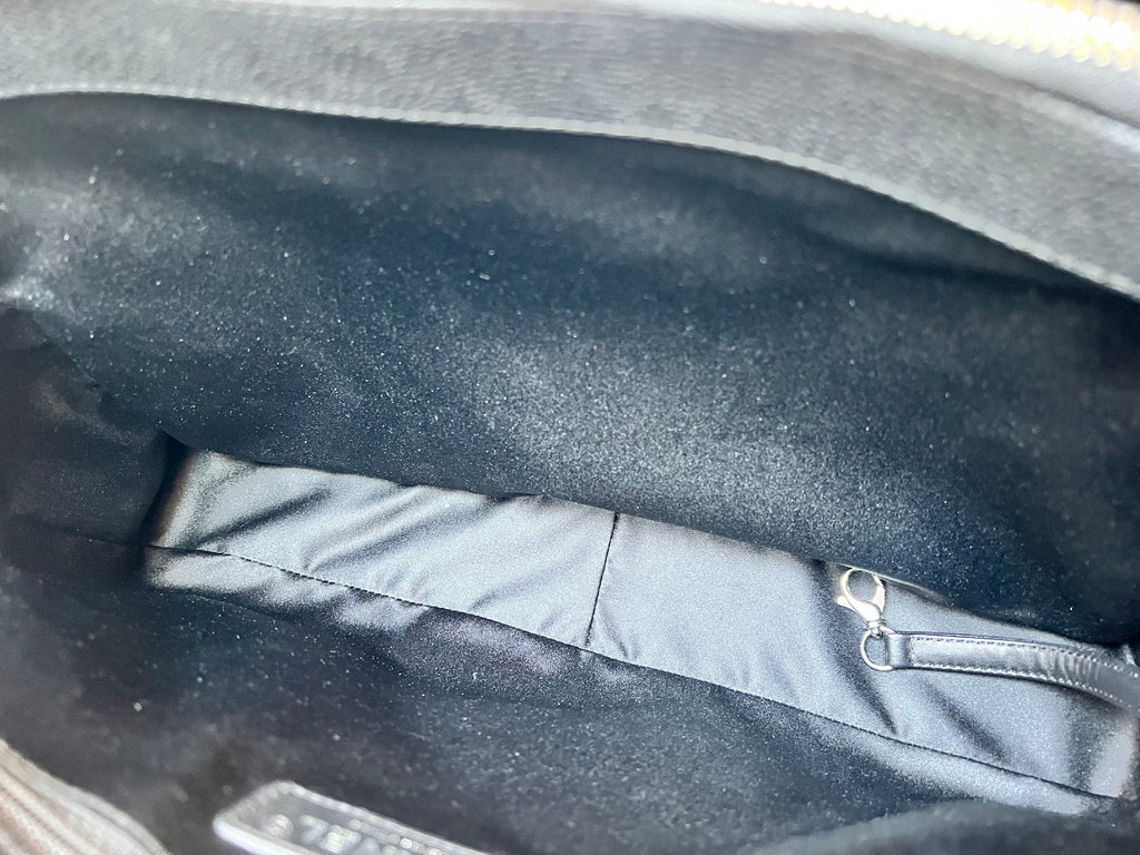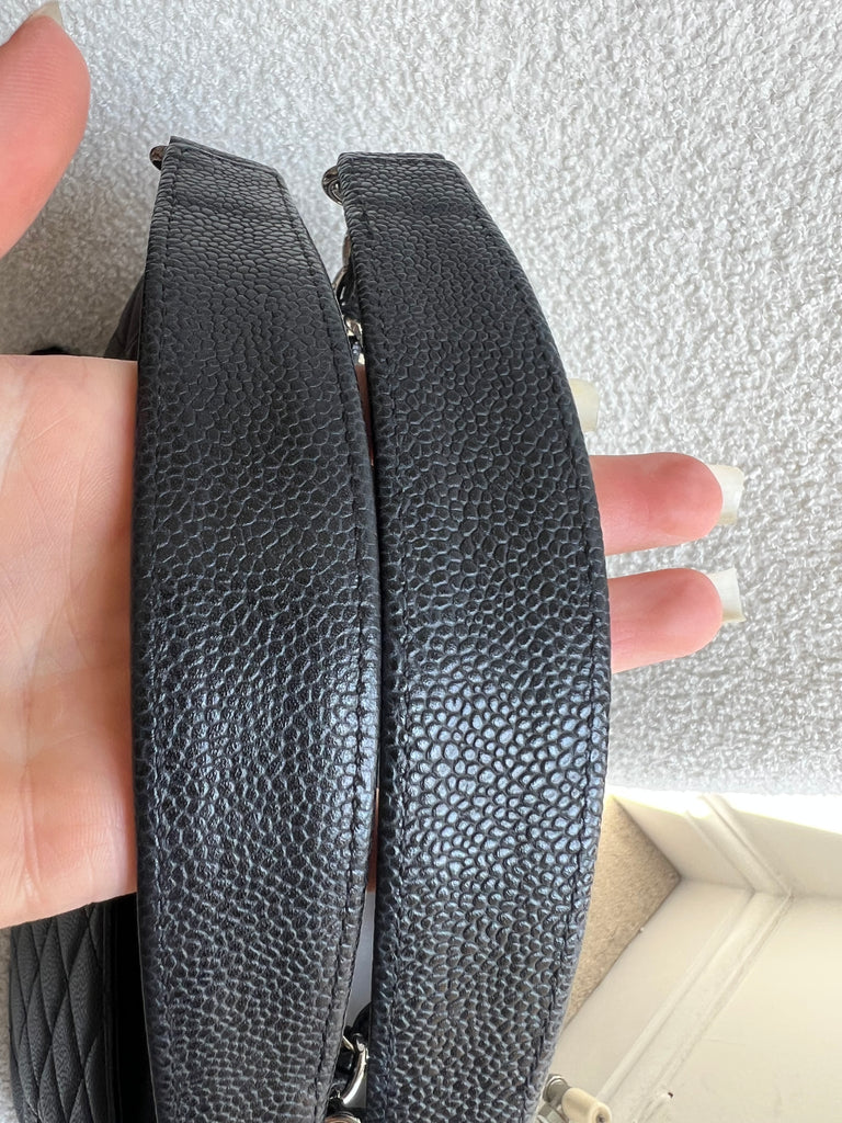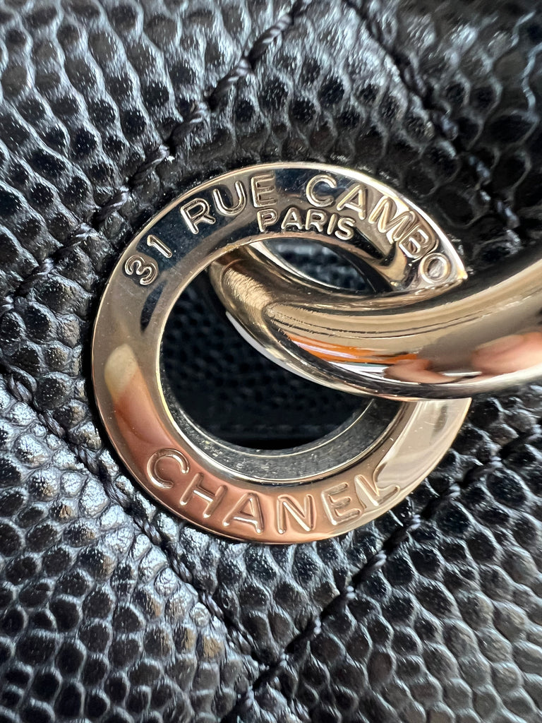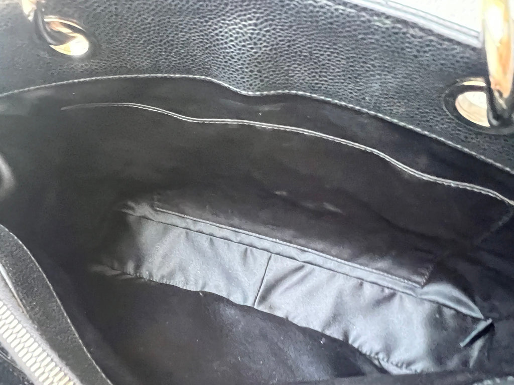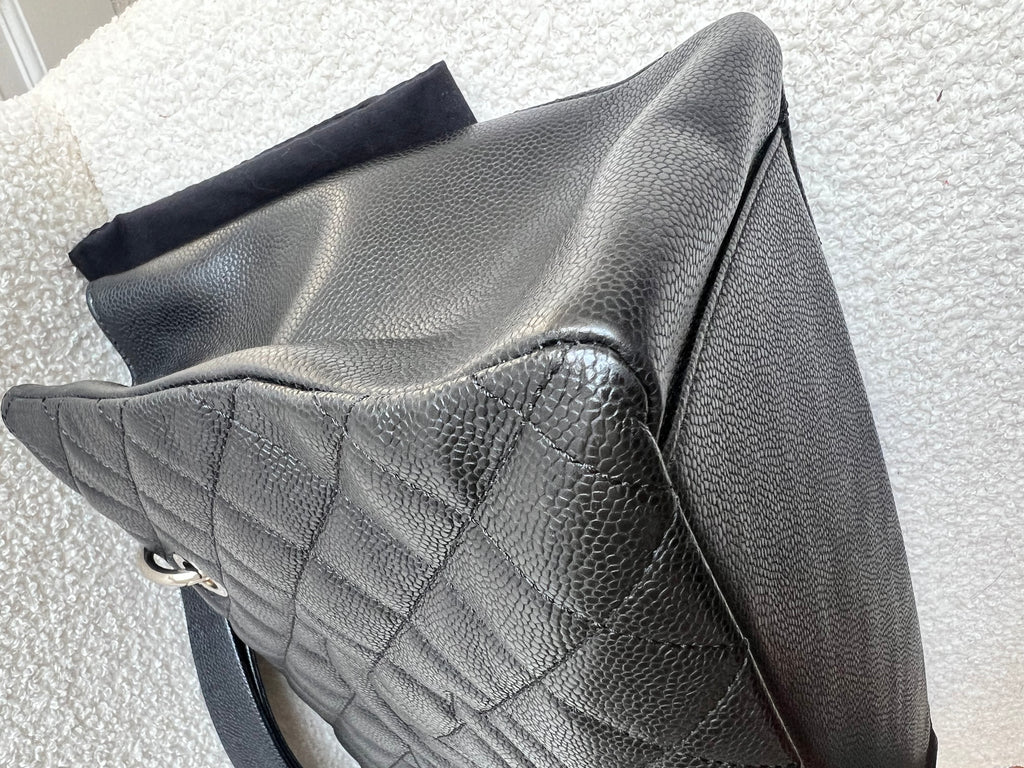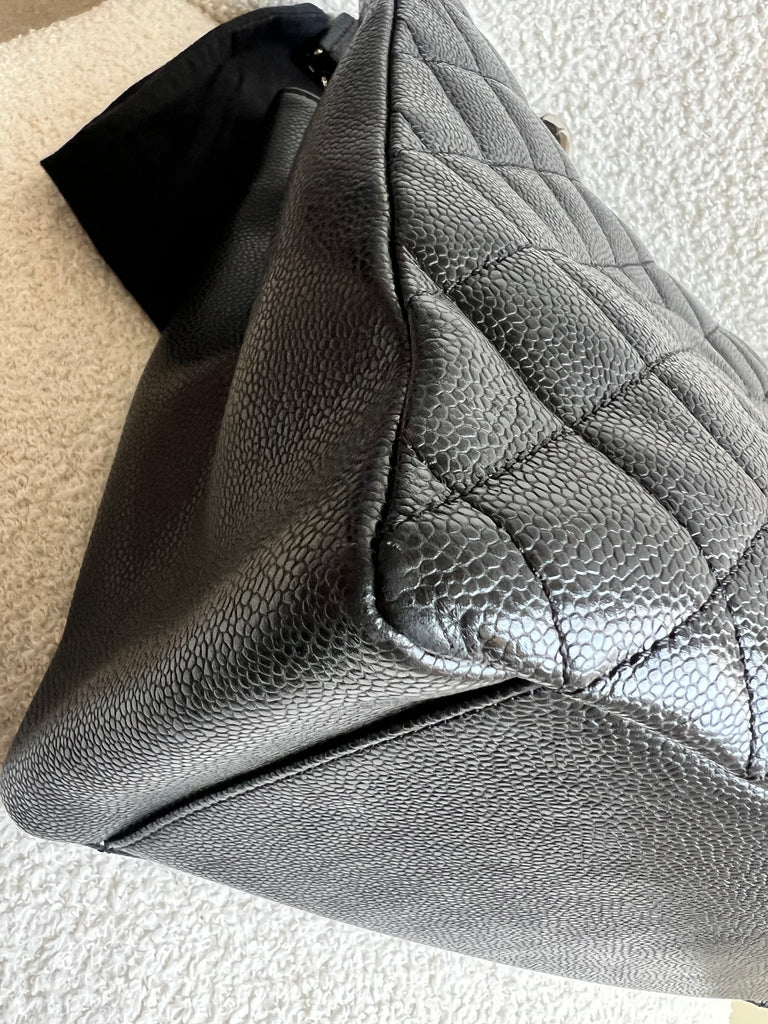 Chanel Grand Shopper Tote (GST) in Black Caviar Leather with silver hardware. This very popular chain tote is sadly now discontinued and only available to buy preloved. Great opportunity to own a practical, iconic and sophisticated Chanel bag without the same price tag as the classic flap styles. Perfect for day or evening use and the caviar leather is very resilient and durable. Can be carried in the crook of the arm or over shoulder using the chain straps.