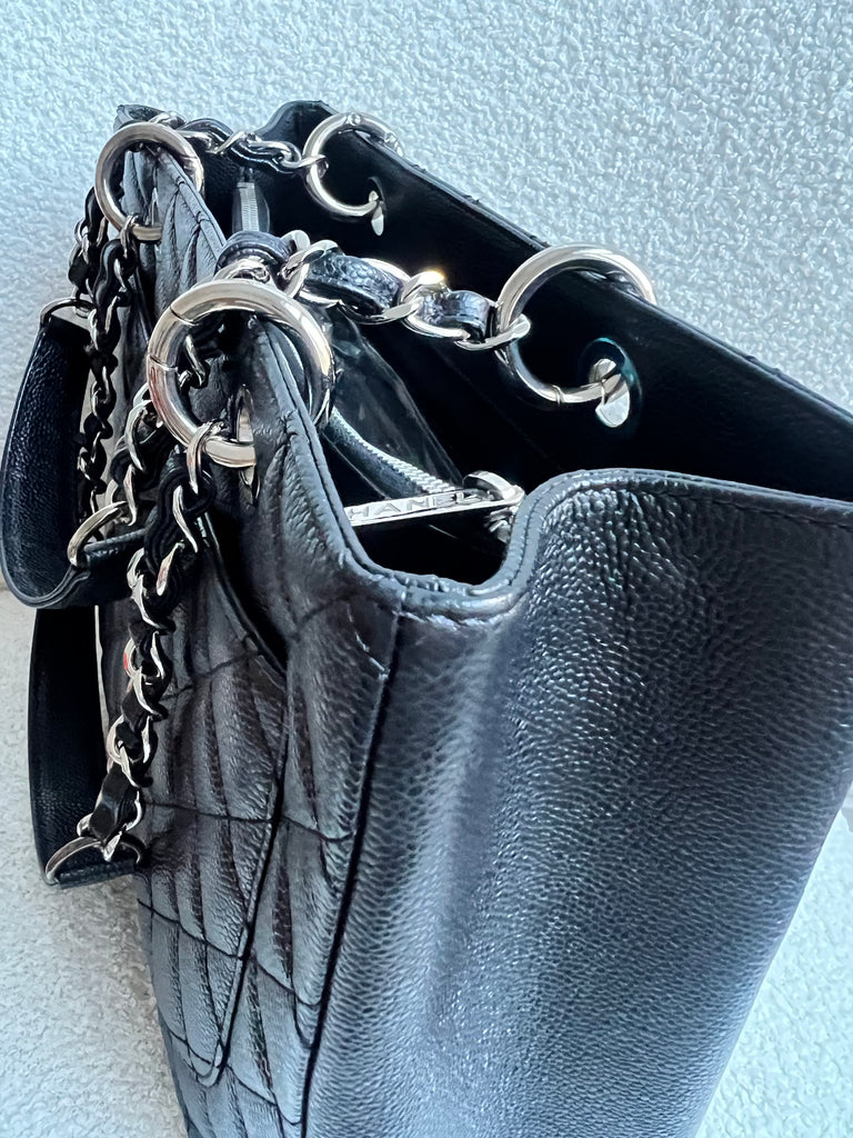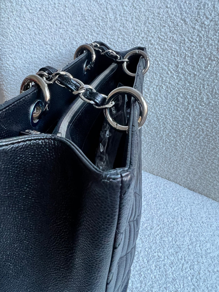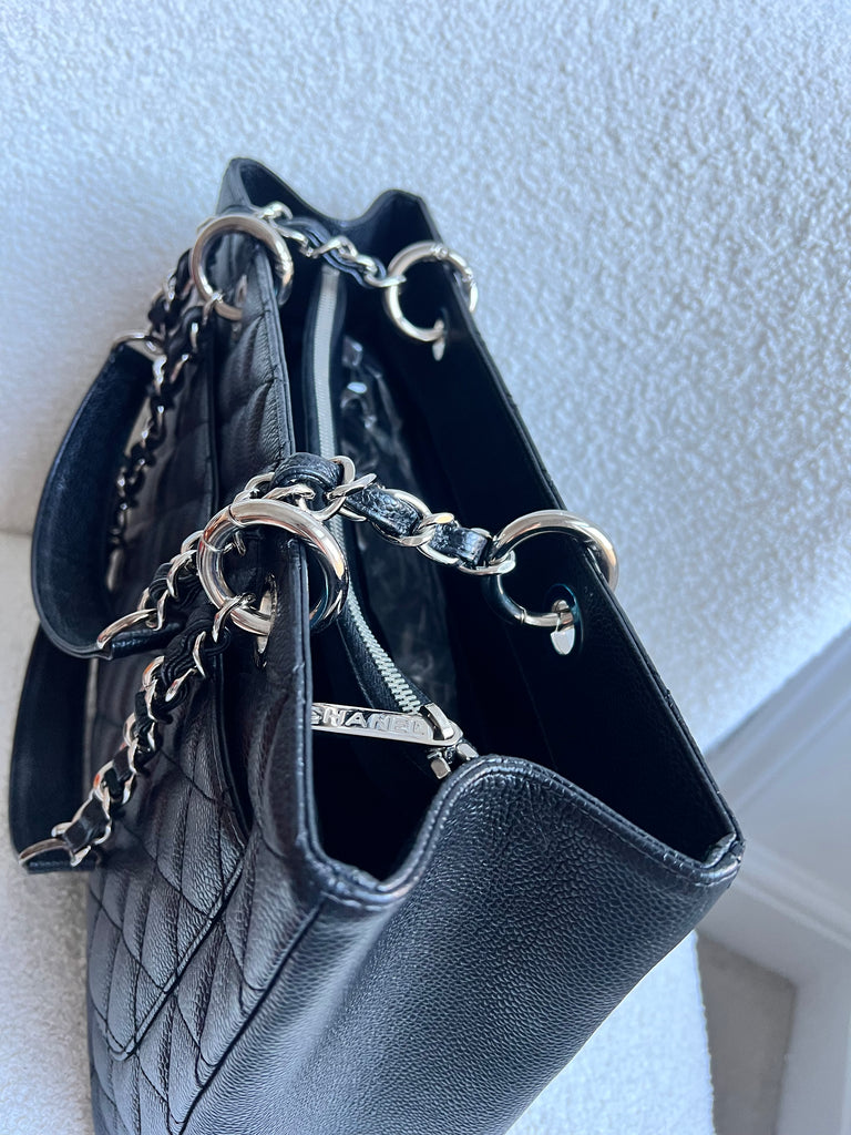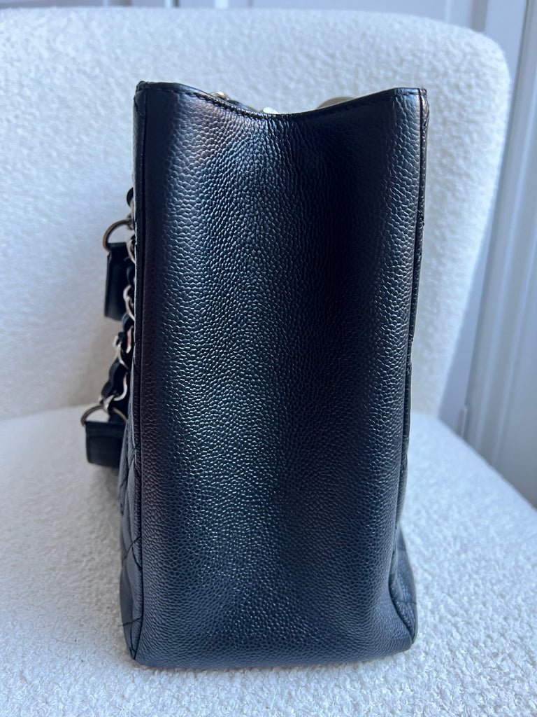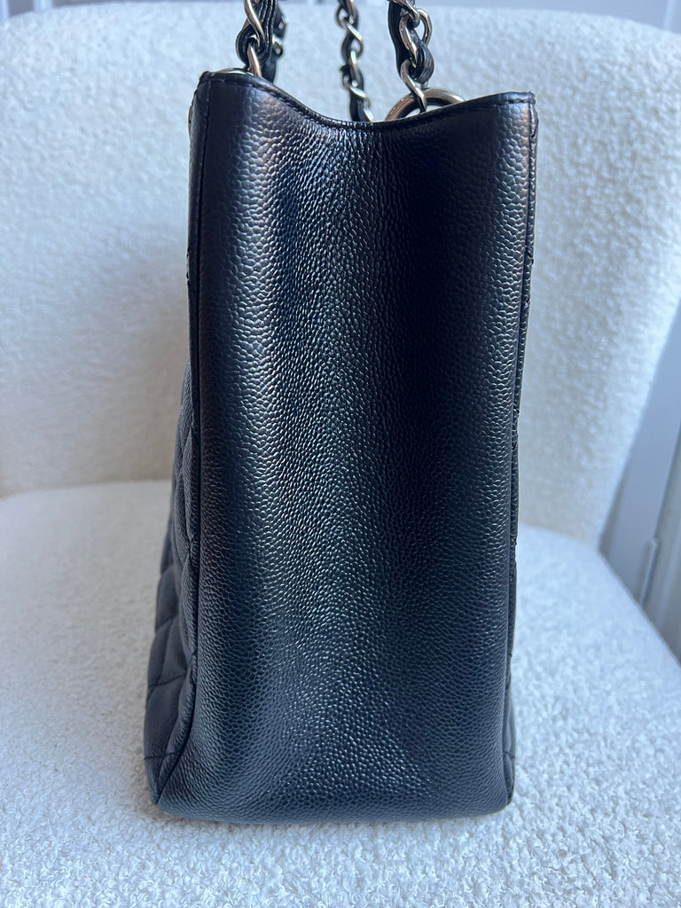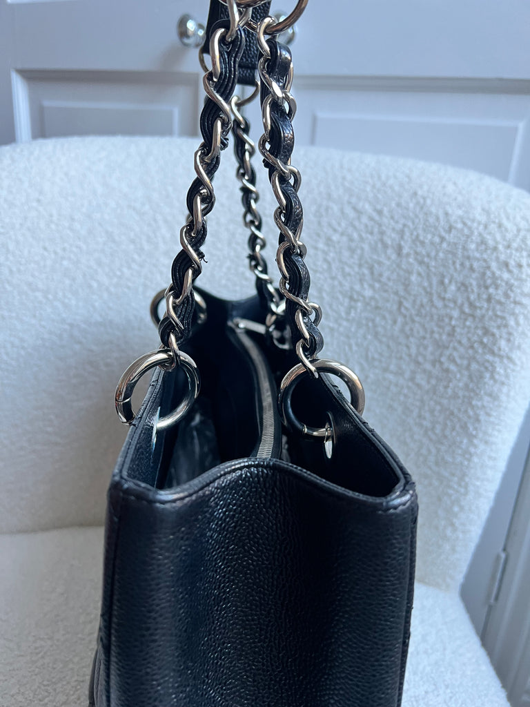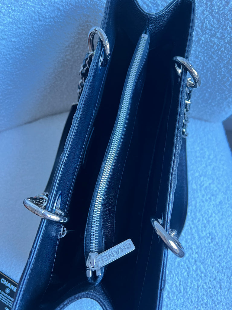 Chanel Grand Shopper Tote (GST) in Black Caviar Leather with silver hardware. This very popular chain tote is sadly now discontinued and only available to buy preloved. Great opportunity to own a practical, iconic and sophisticated Chanel bag without the same price tag as the classic flap styles. Perfect for day or evening use and the caviar leather is very resilient and durable. Can be carried in the crook of the arm or over shoulder using the chain straps.