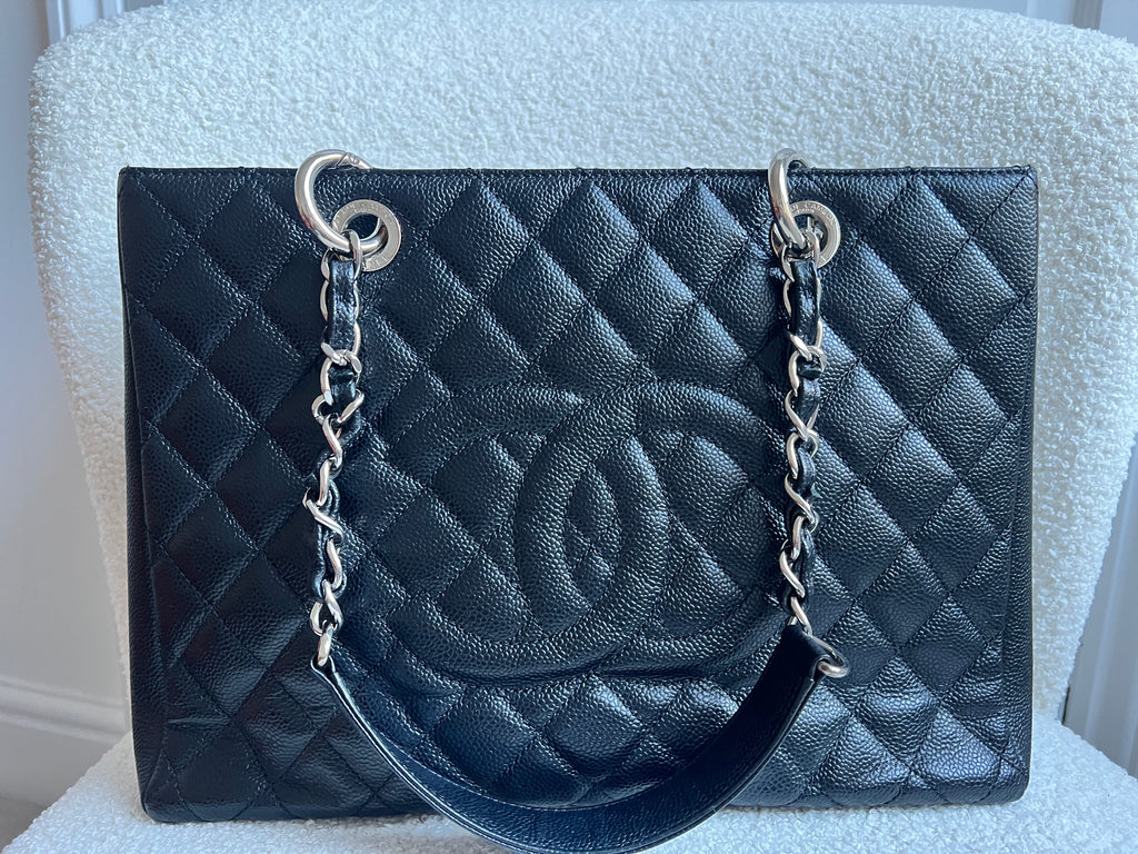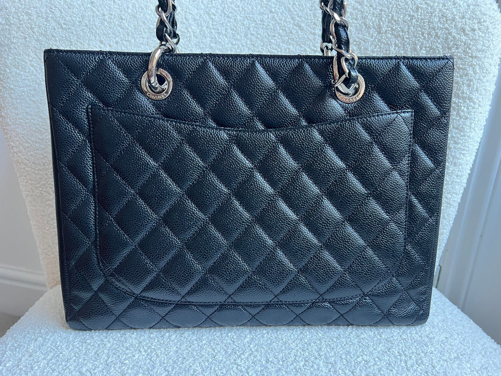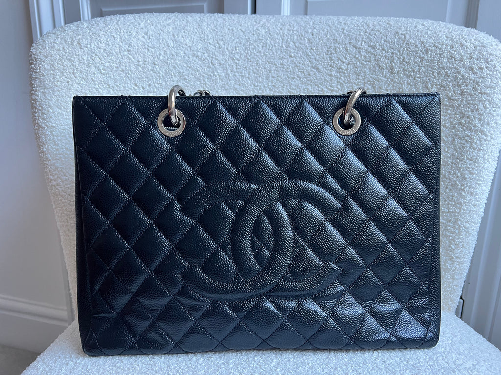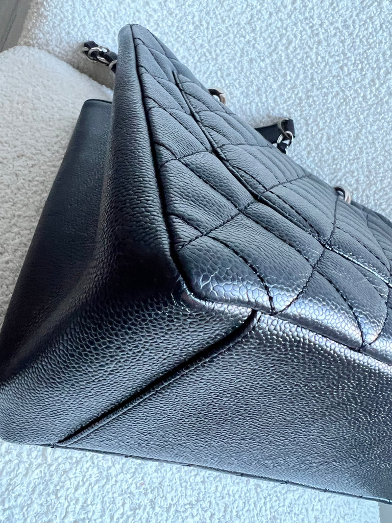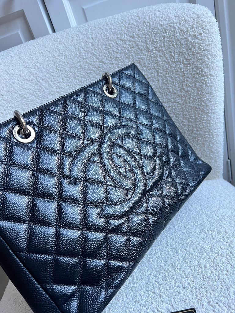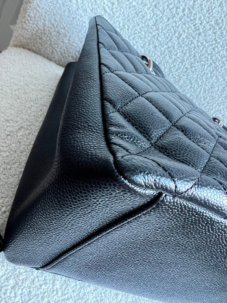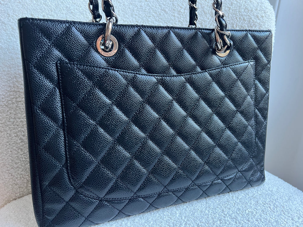 Chanel Grand Shopper Tote (GST) in Black Caviar Leather with silver hardware. This very popular chain tote is sadly now discontinued and only available to buy preloved. Great opportunity to own a practical, iconic and sophisticated Chanel bag without the same price tag as the classic flap styles. Perfect for day or evening use and the caviar leather is very resilient and durable. Can be carried in the crook of the arm or over shoulder using the chain straps.
