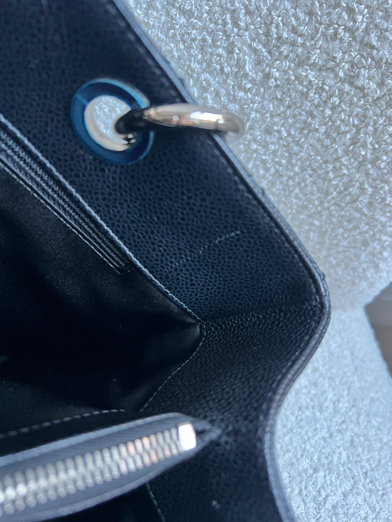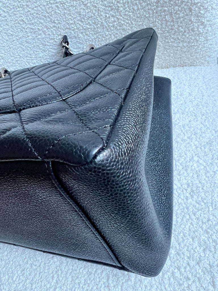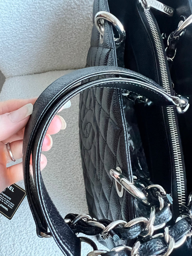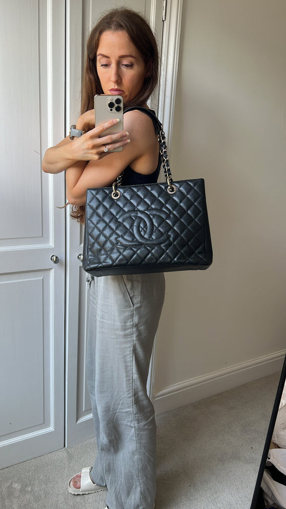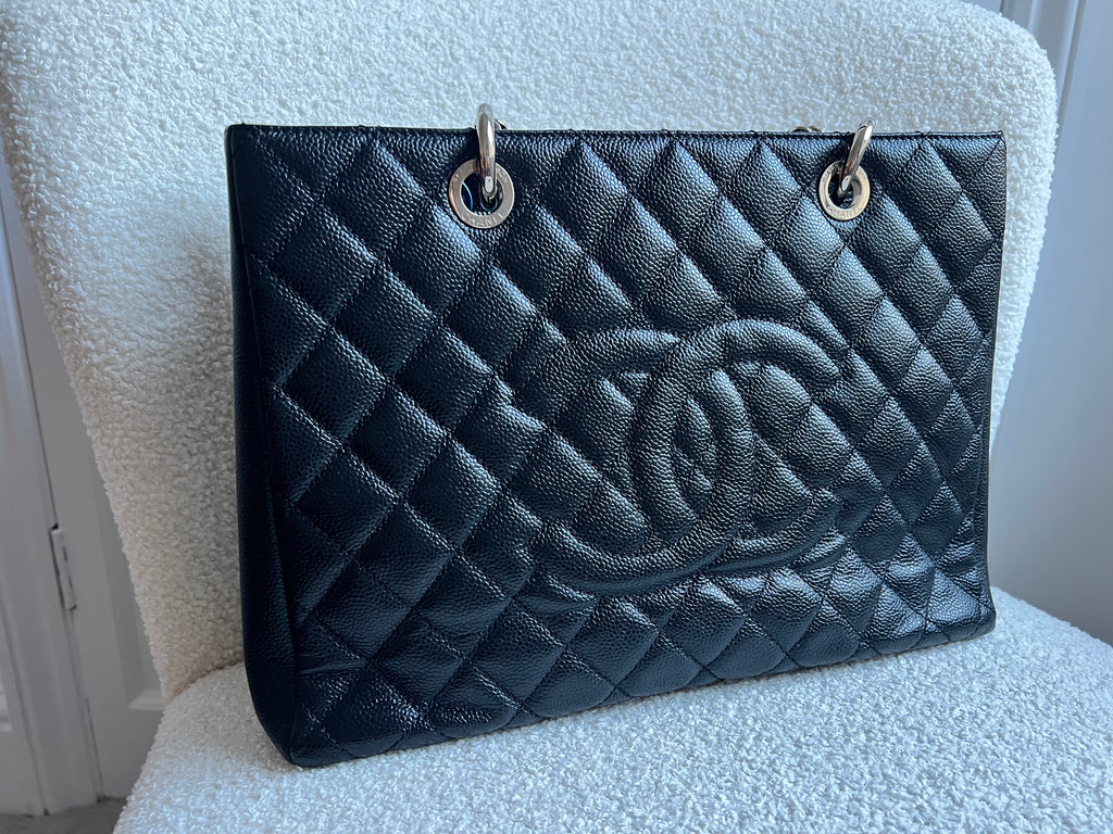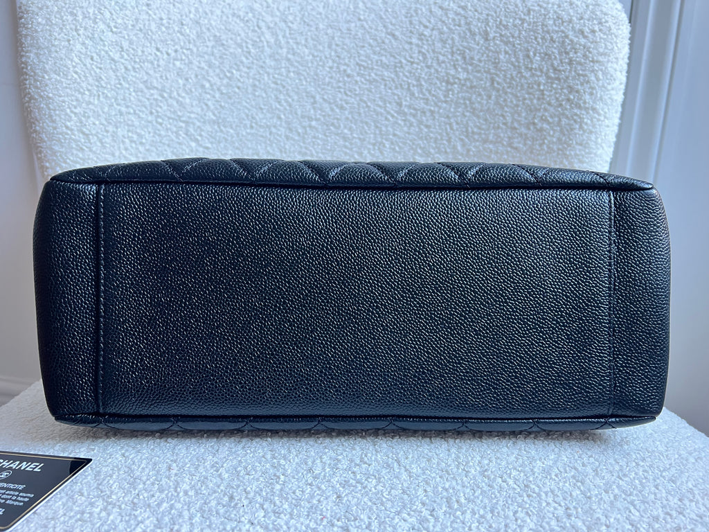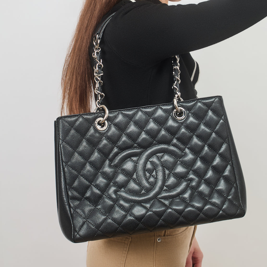 Chanel Grand Shopper Tote (GST) in Black Caviar Leather with silver hardware. This very popular chain tote is sadly now discontinued and only available to buy preloved. Great opportunity to own a practical, iconic and sophisticated Chanel bag without the same price tag as the classic flap styles. Perfect for day or evening use and the caviar leather is very resilient and durable. Can be carried in the crook of the arm or over shoulder using the chain straps.