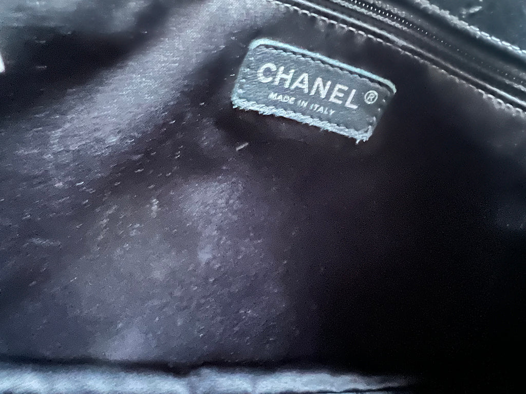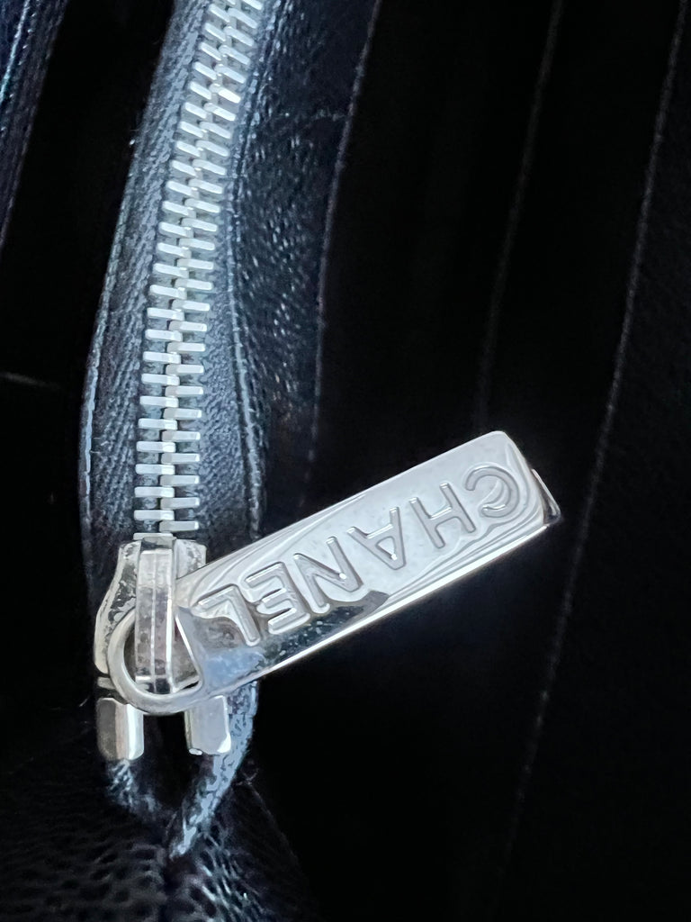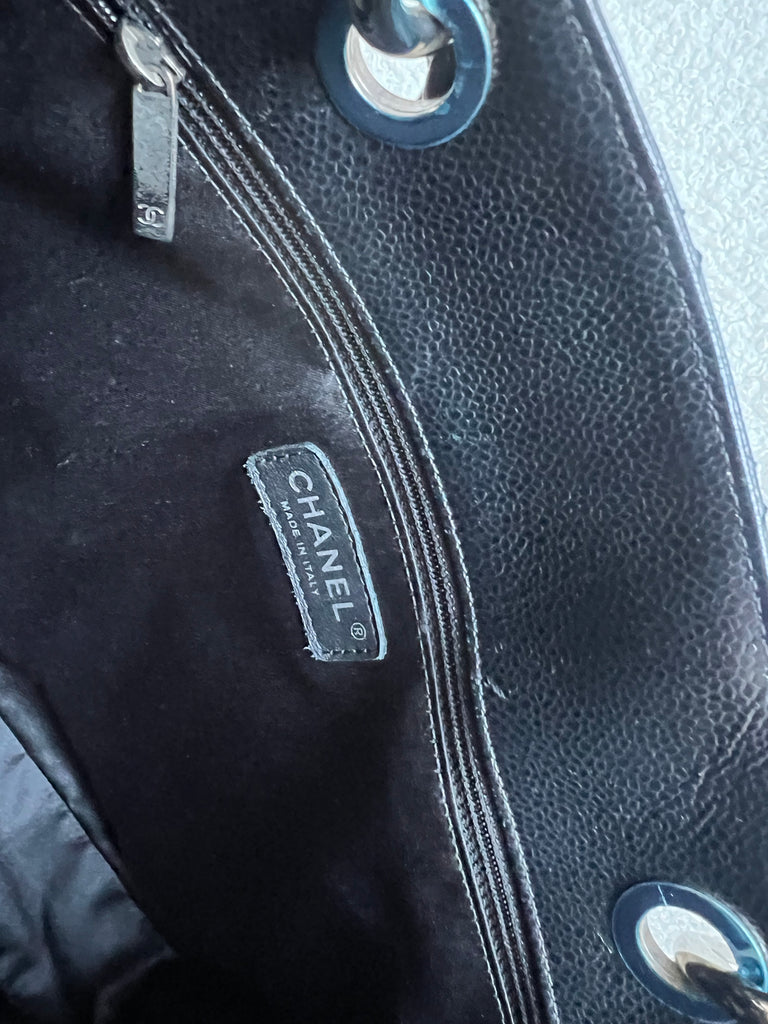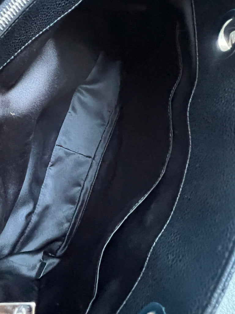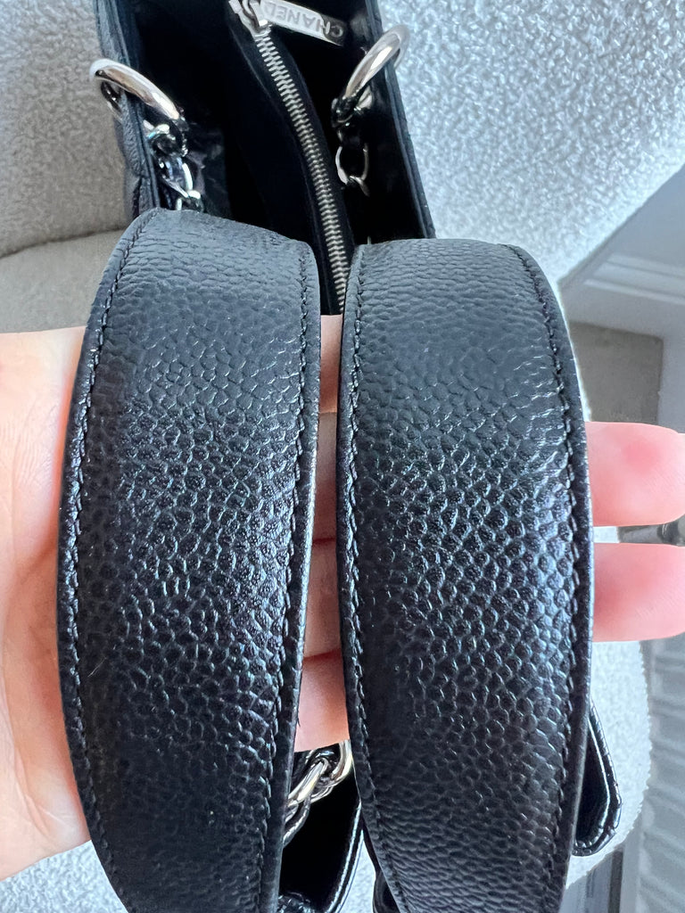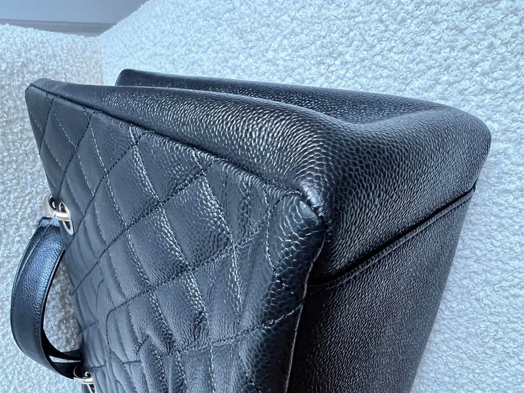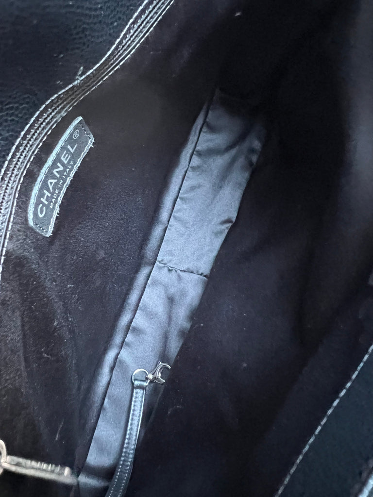 Chanel Grand Shopper Tote (GST) in Black Caviar Leather with silver hardware. This very popular chain tote is sadly now discontinued and only available to buy preloved. Great opportunity to own a practical, iconic and sophisticated Chanel bag without the same price tag as the classic flap styles. Perfect for day or evening use and the caviar leather is very resilient and durable. Can be carried in the crook of the arm or over shoulder using the chain straps.