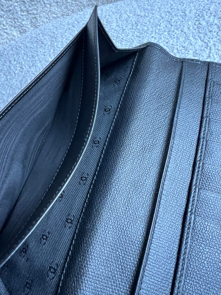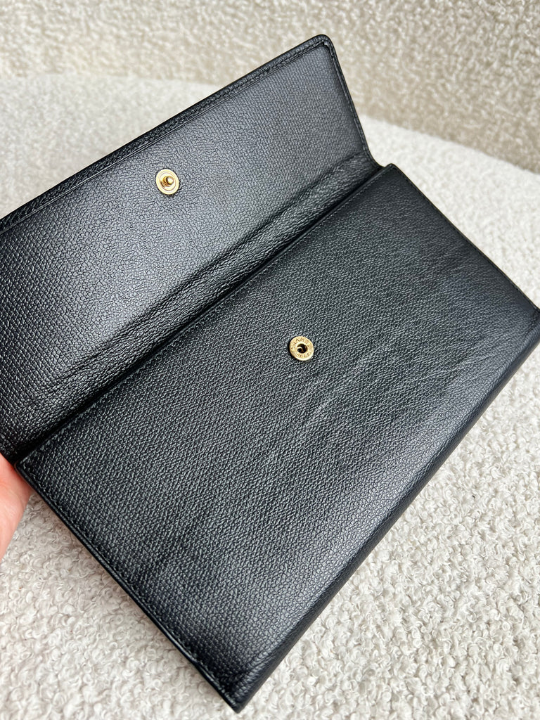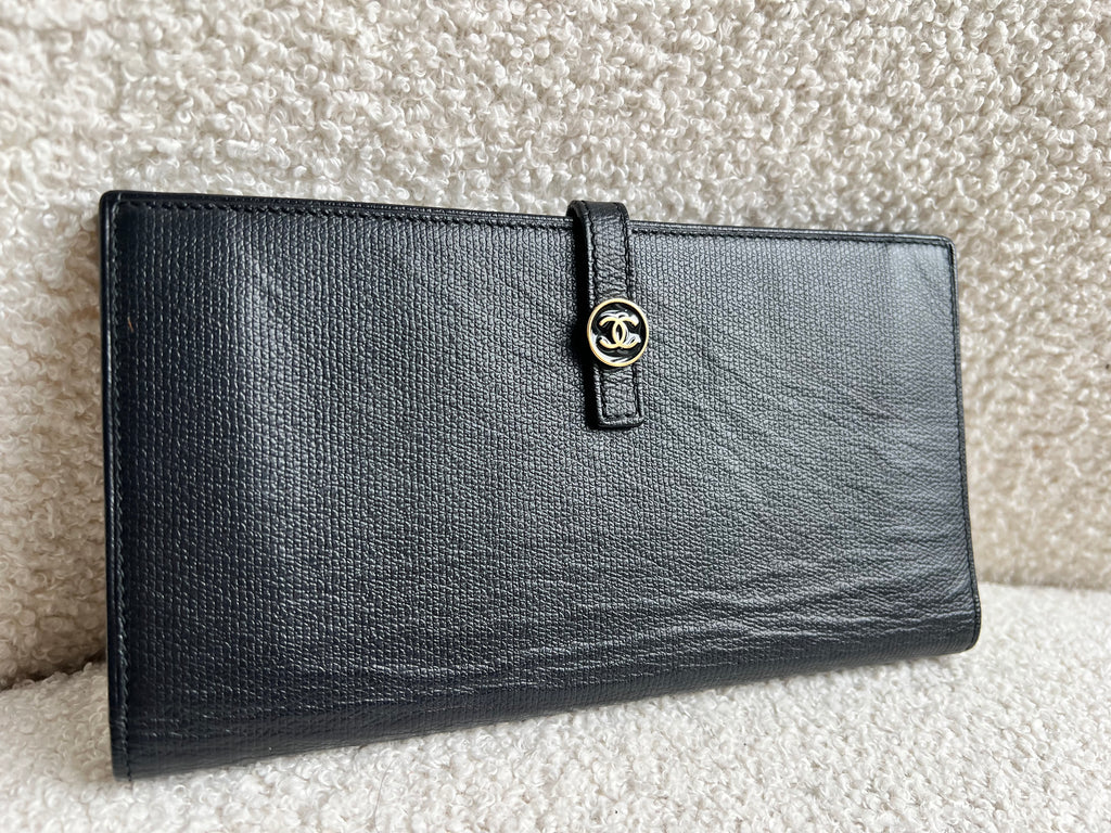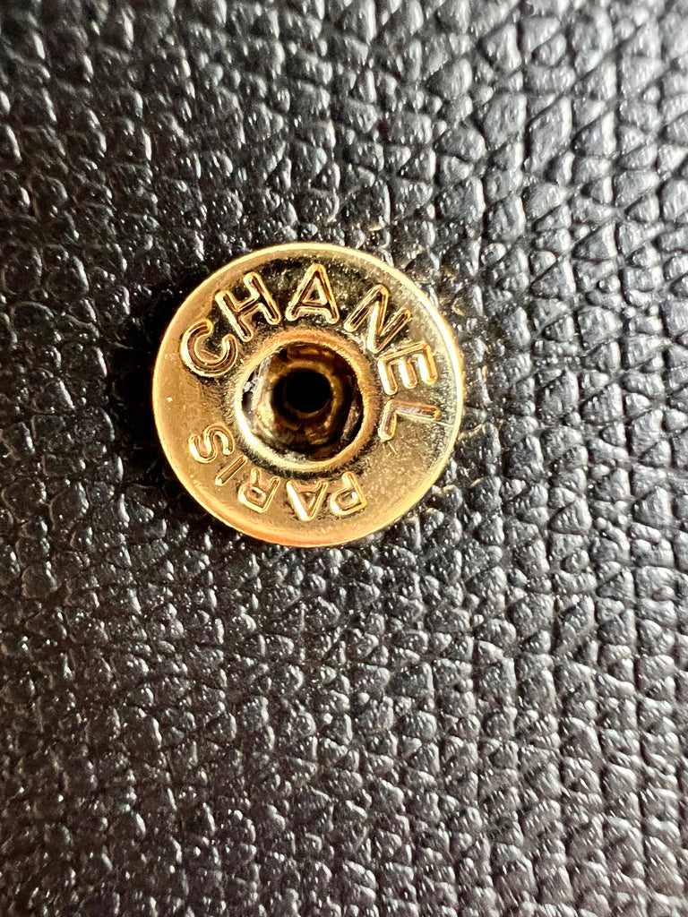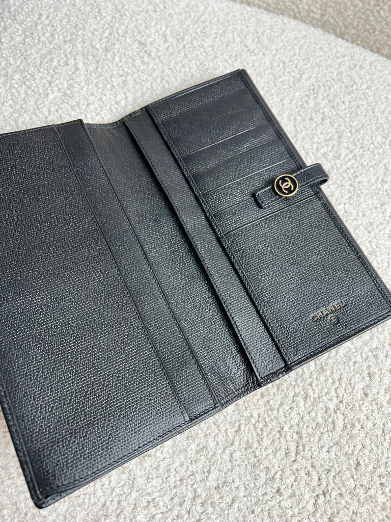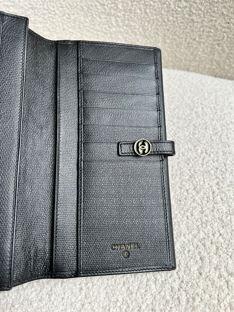 Chanel Coco Button long wallet in Black Caviar Leather. This bifold long flap sized wallet is perfect for those who prefer a larger sized wallet. Flap section on reverse and tab push stud closure for main bifold section with plenty room for cards, cash and bills.