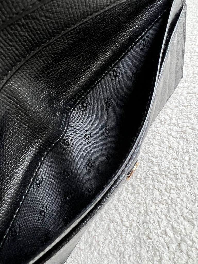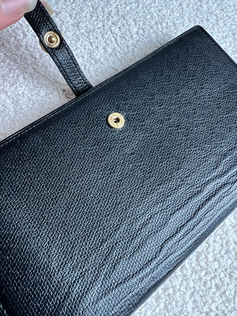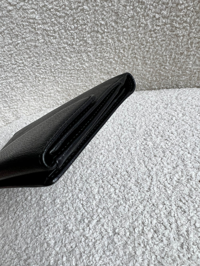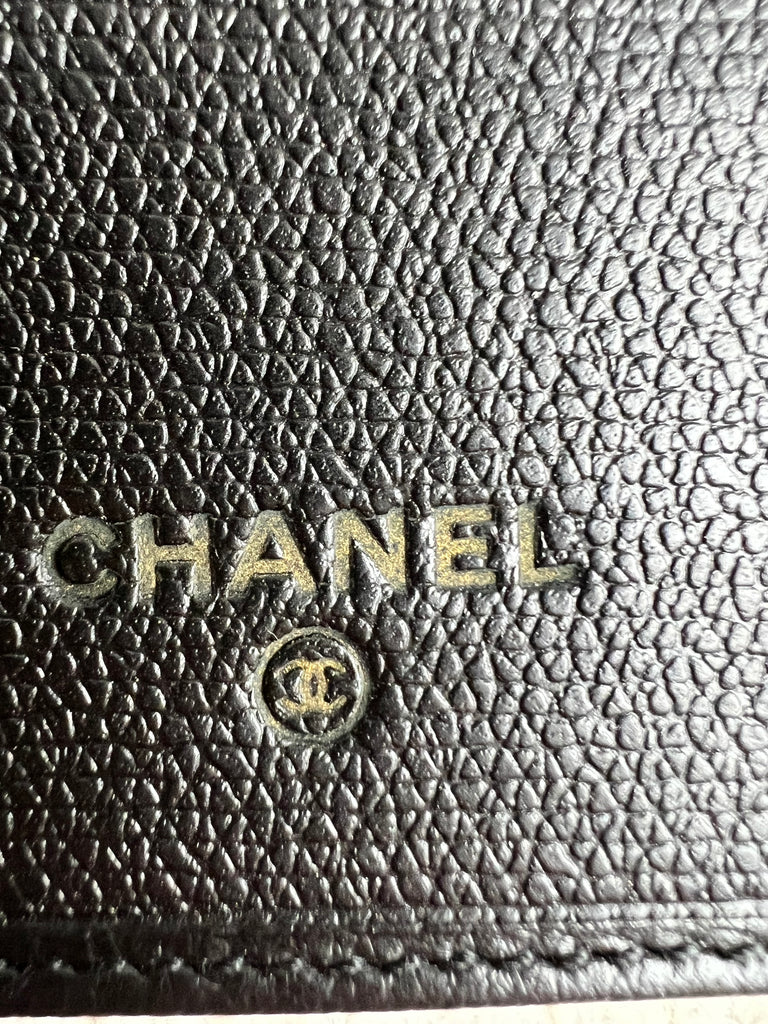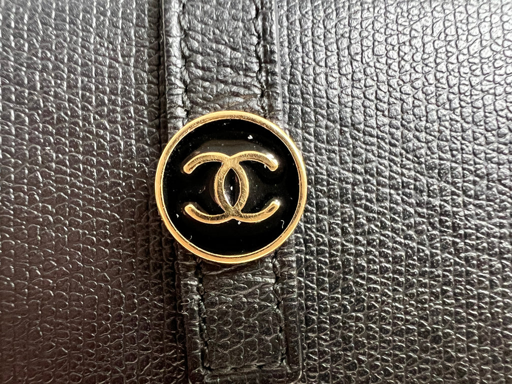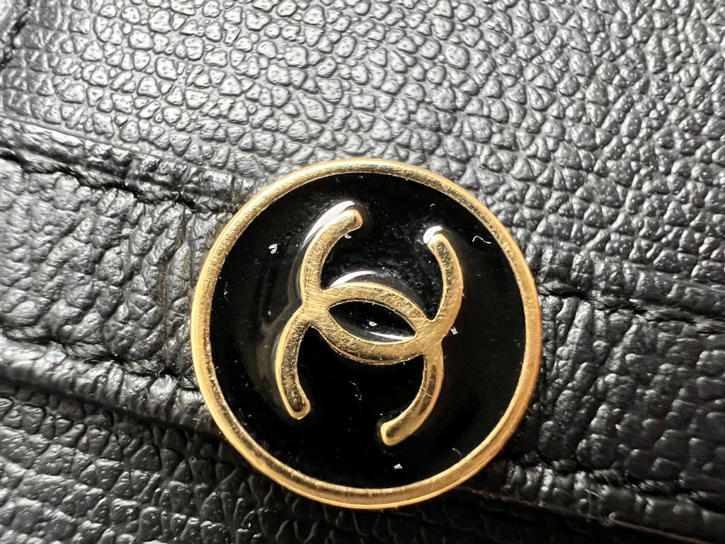 Chanel Coco Button long wallet in Black Caviar Leather. This bifold long flap sized wallet is perfect for those who prefer a larger sized wallet. Flap section on reverse and tab push stud closure for main bifold section with plenty room for cards, cash and bills.