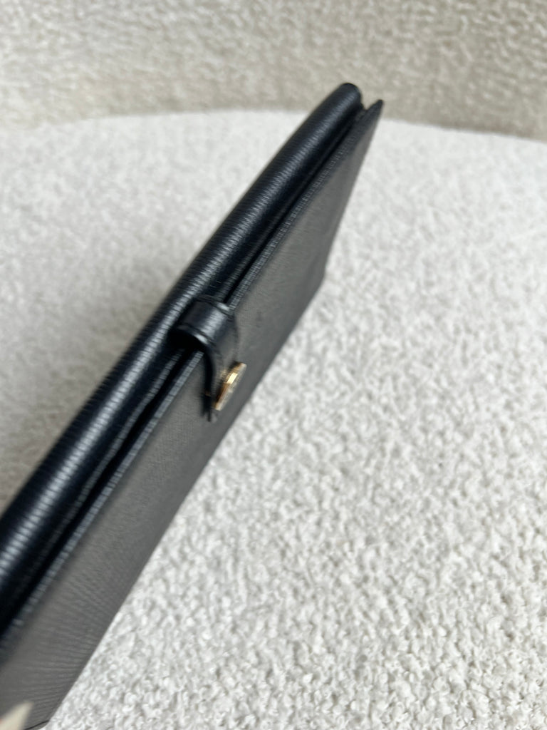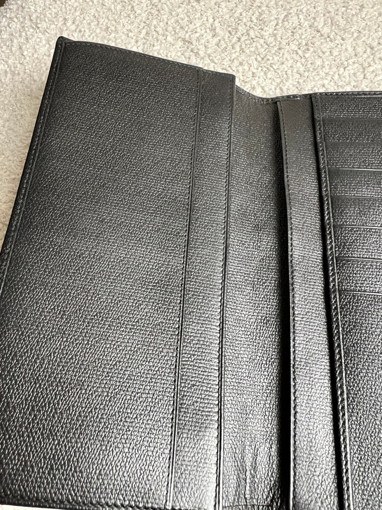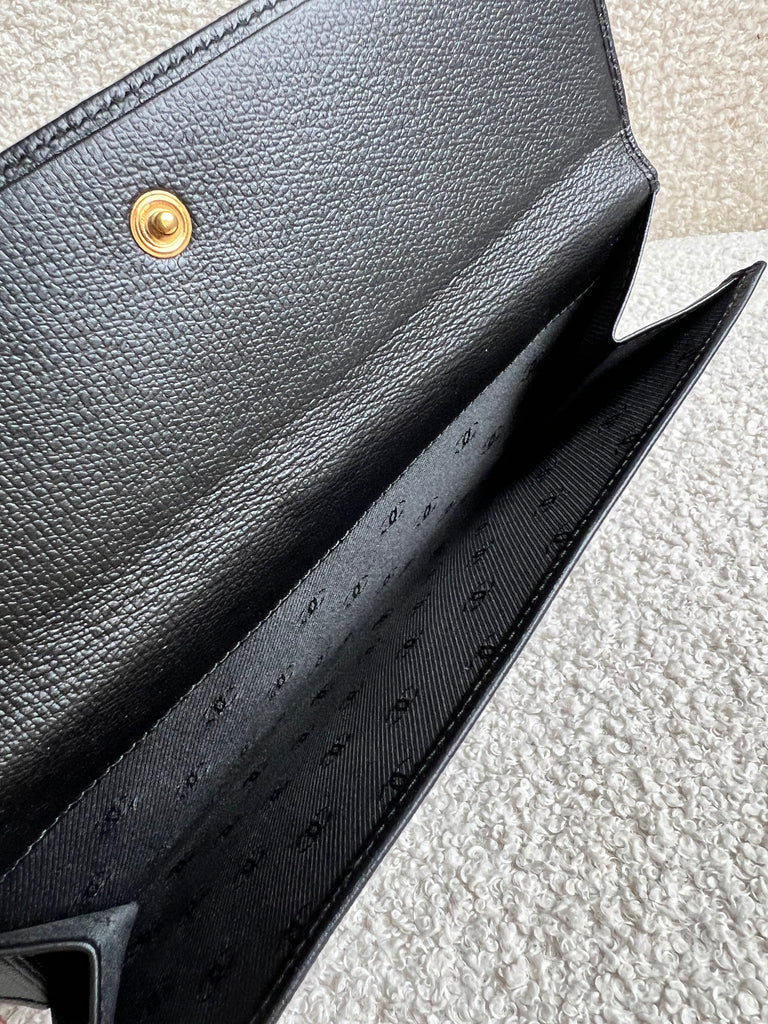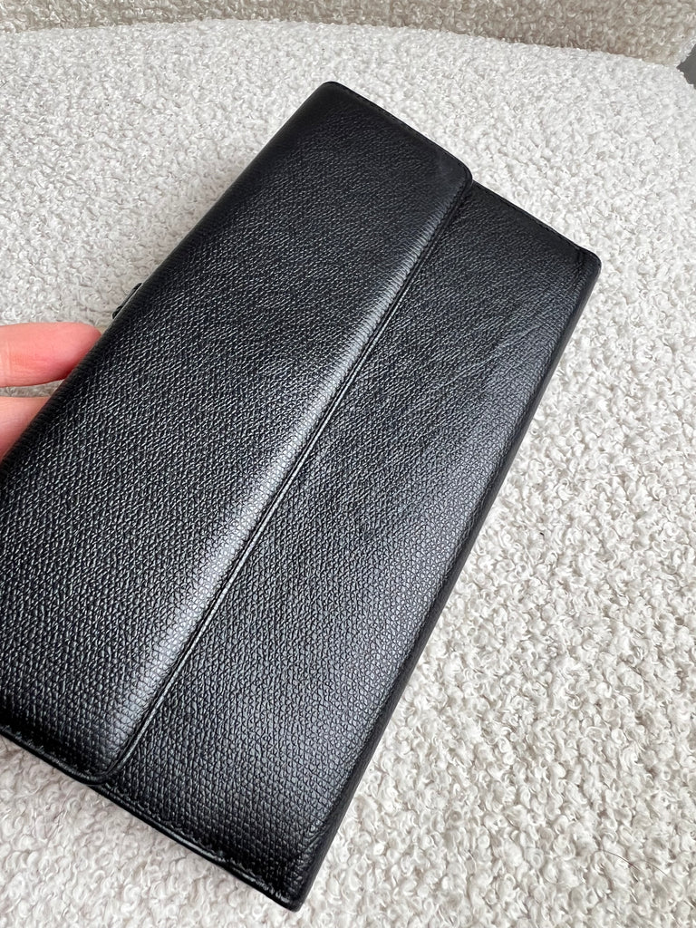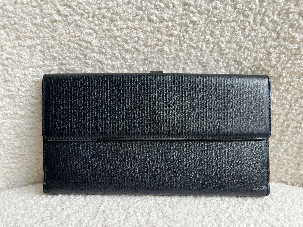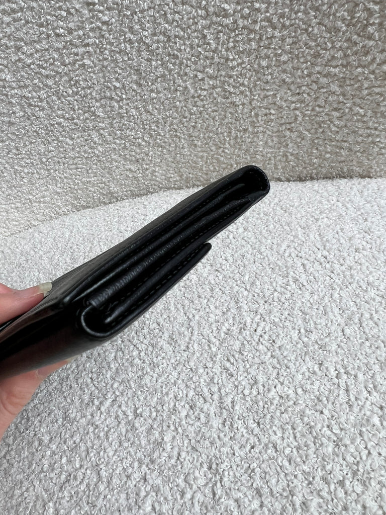 Chanel Coco Button long wallet in Black Caviar Leather. This bifold long flap sized wallet is perfect for those who prefer a larger sized wallet. Flap section on reverse and tab push stud closure for main bifold section with plenty room for cards, cash and bills.