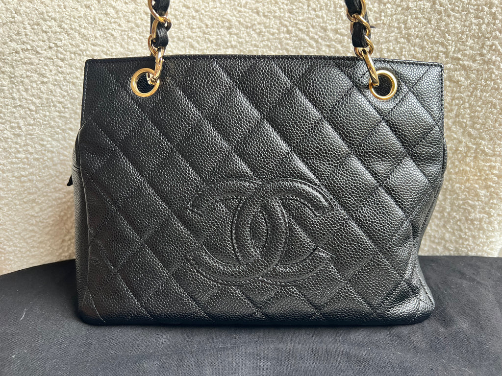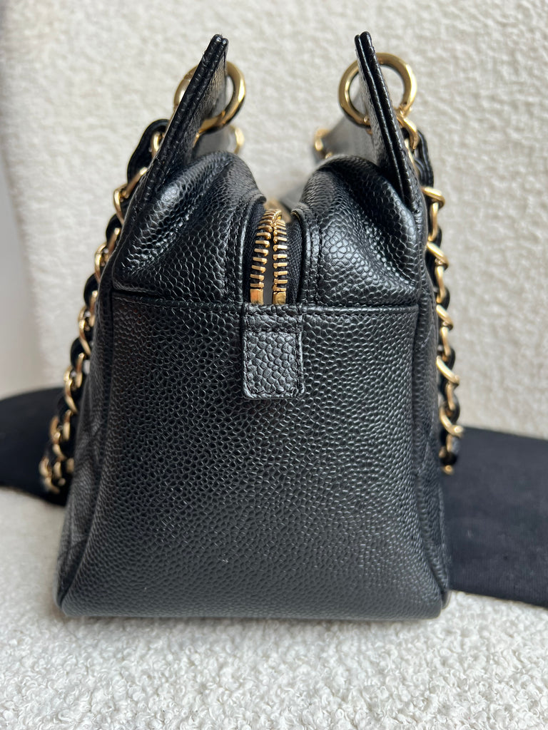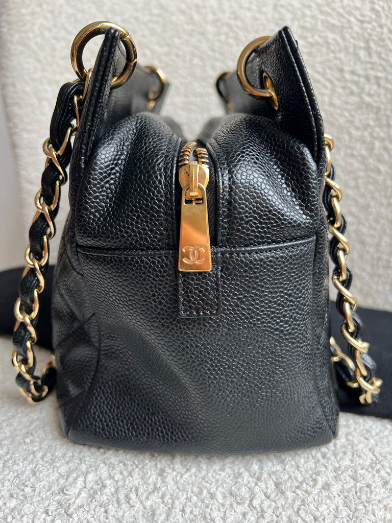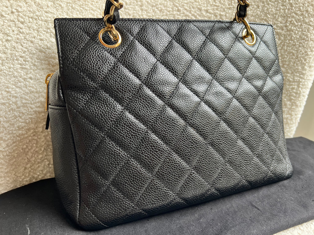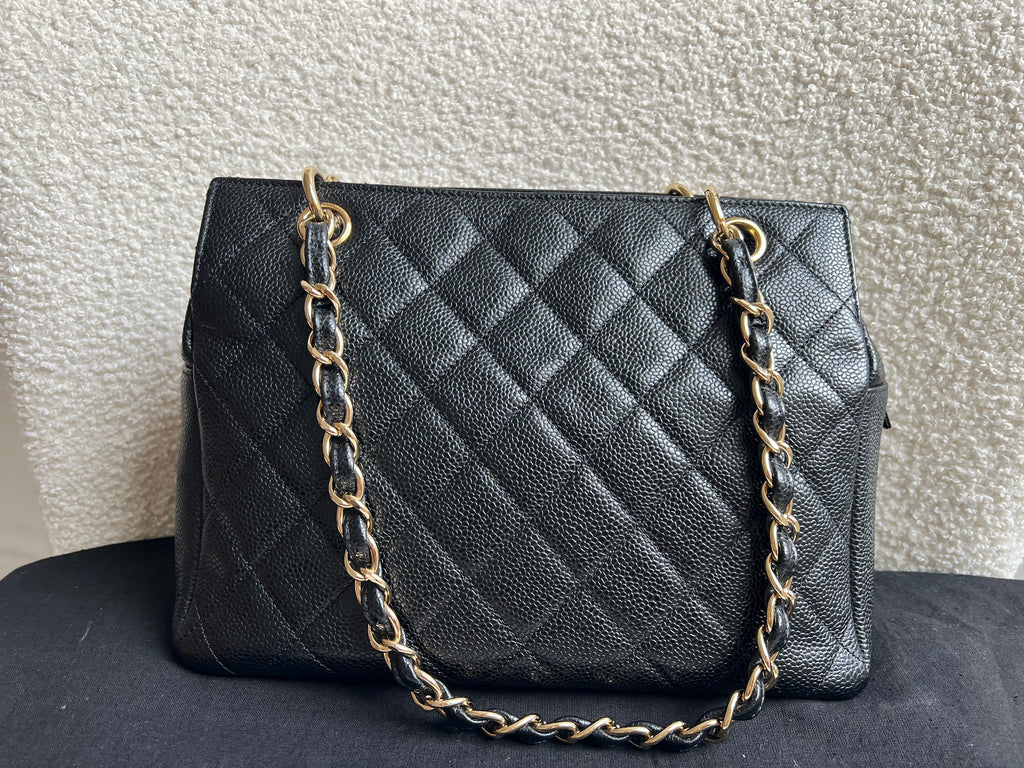 Chanel Petite Timeless Tote in Black Quilted Caviar with gold hardware. This practical, elegant tote is stylish and a great opportunity to buy a more reasonably priced Chanel bag. Medium in size, perfect for day to day use with the interwoven chain and leather straps. Fits over shoulder or can be carried in hand / crook of the arm.