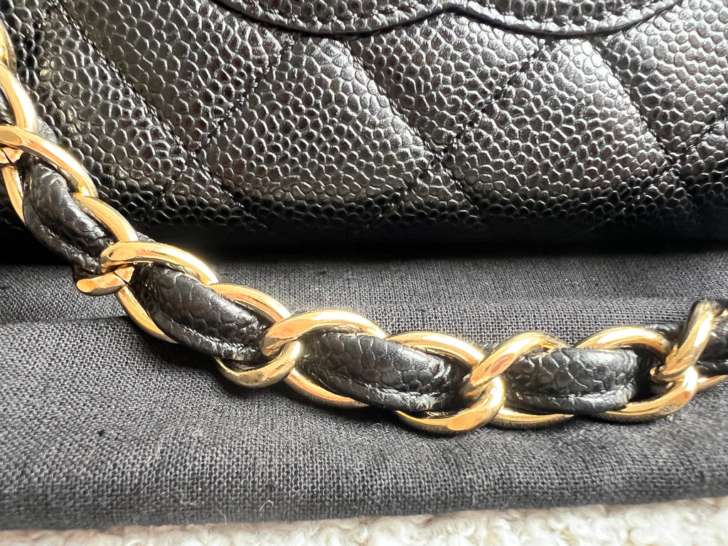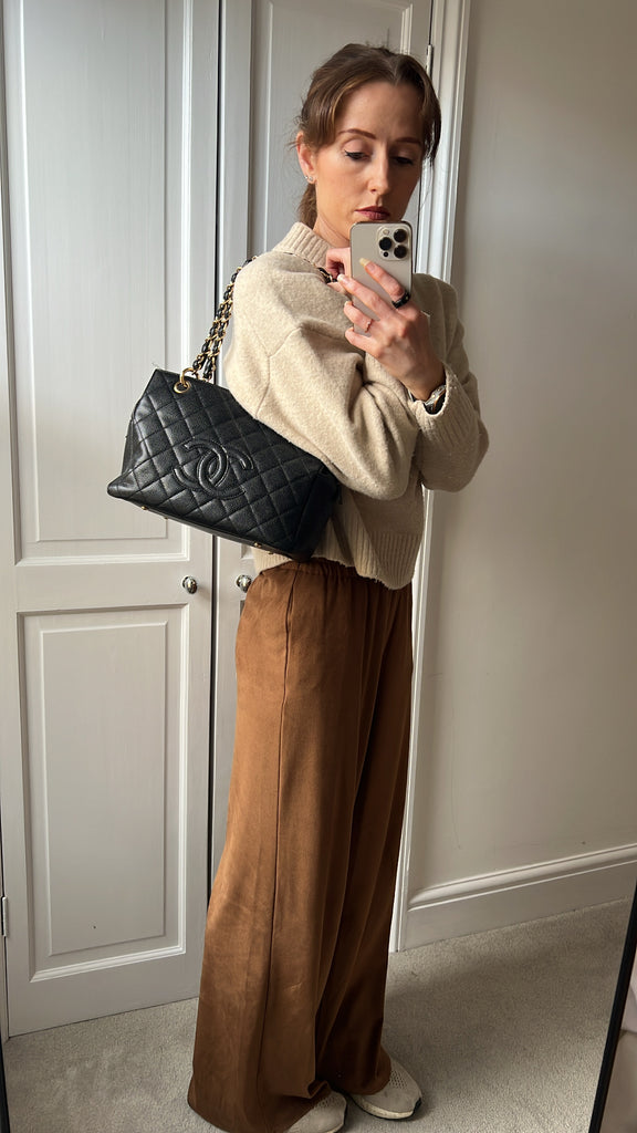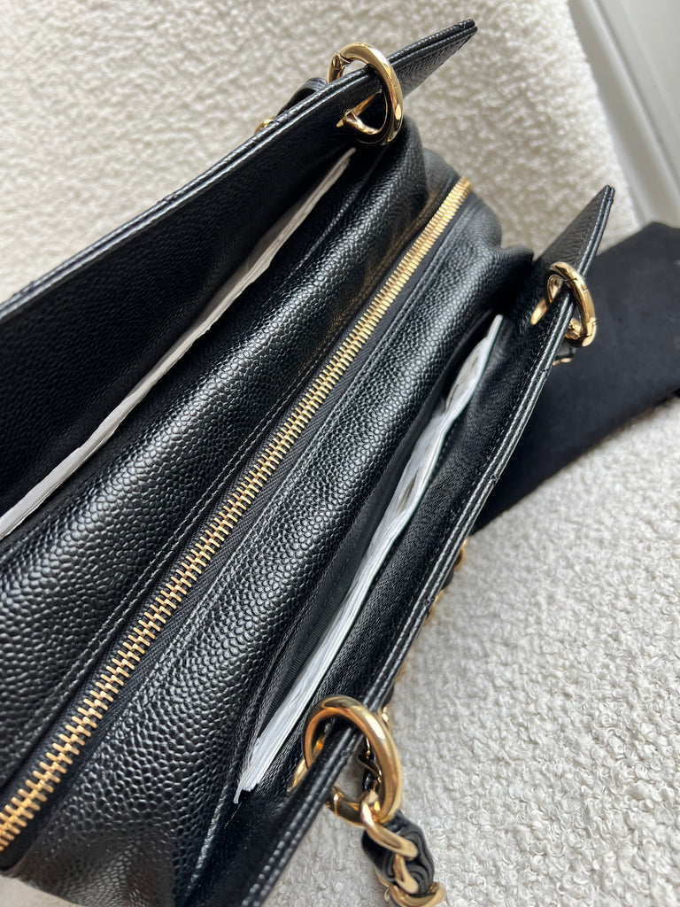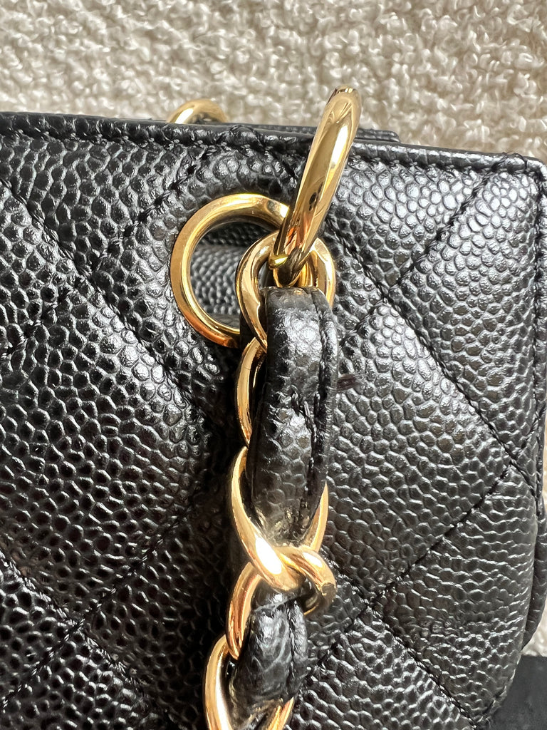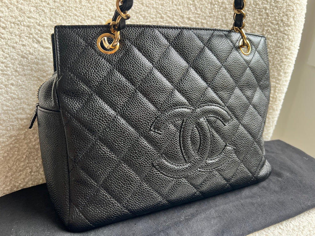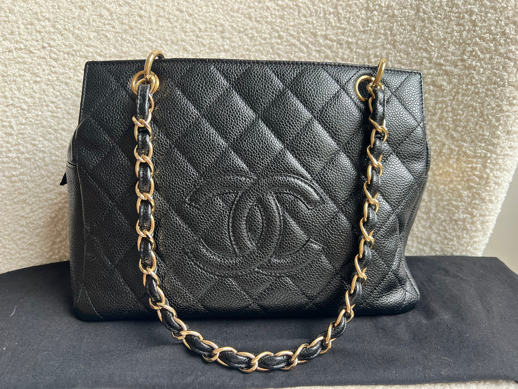 Chanel Petite Timeless Tote in Black Quilted Caviar with gold hardware. This practical, elegant tote is stylish and a great opportunity to buy a more reasonably priced Chanel bag. Medium in size, perfect for day to day use with the interwoven chain and leather straps. Fits over shoulder or can be carried in hand / crook of the arm.