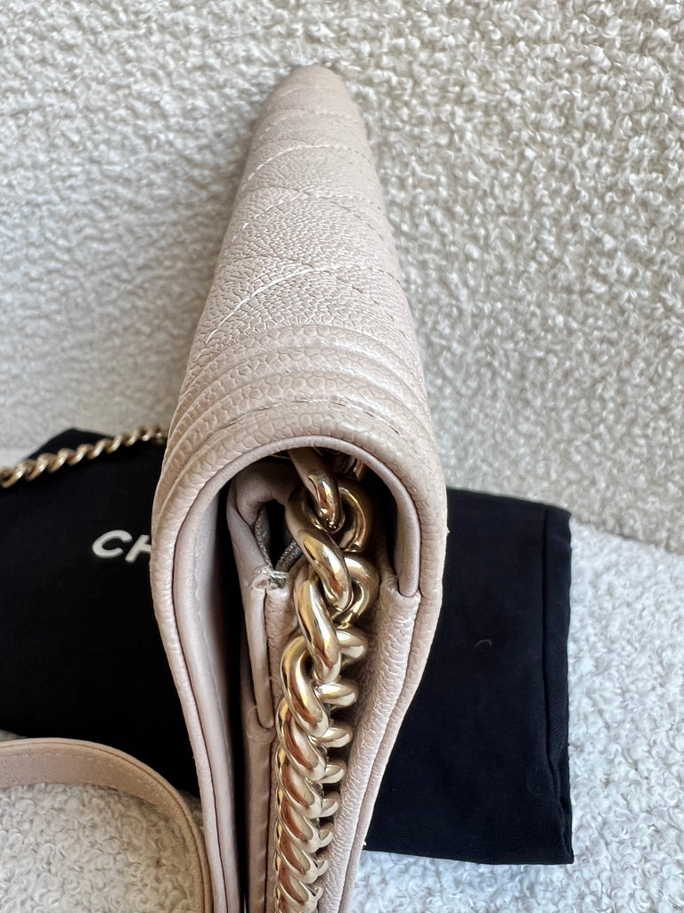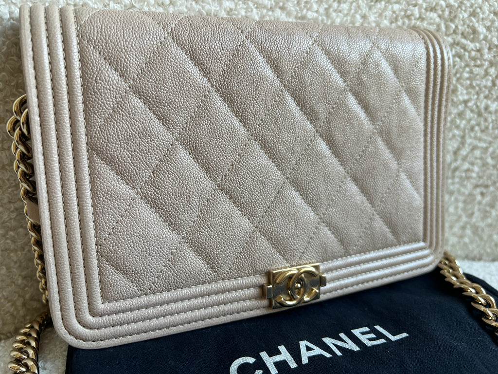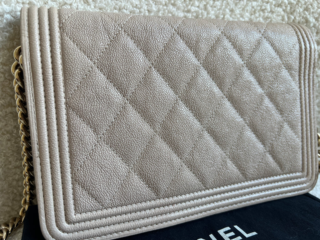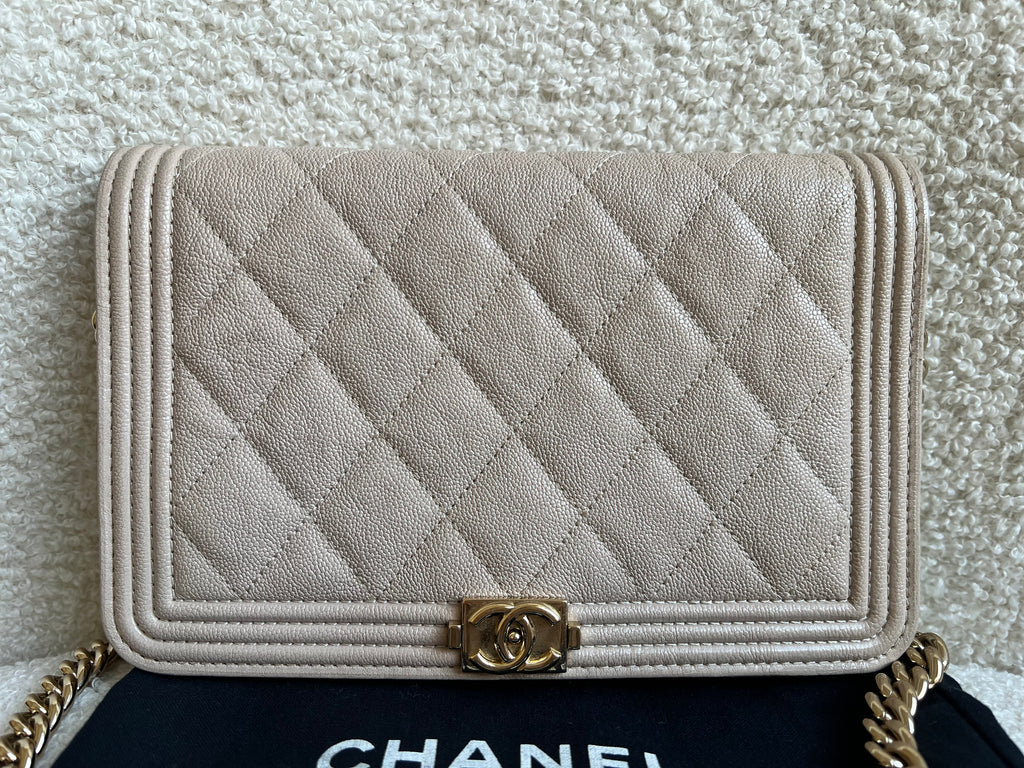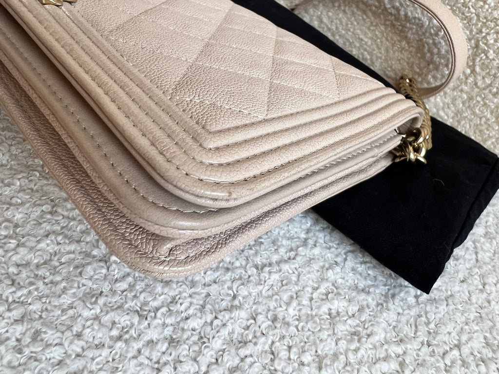 Chanel Boy Wallet on Chain in Ivory/Cream Quilted Caviar Leather with Gold Hardware. The ultimate evening style, the boy Chanel WOC is timeless and features the Boy CC hardware detailing on the front flap. The caviar leather is robust and resilient. Perfect for evening wear or night out to carry the essentials. Can be carried as a handheld clutch with the chain tucked inside, or worn over shoulder or cross body. Stunning nude, neutral shade that can be matched with any outfit.
