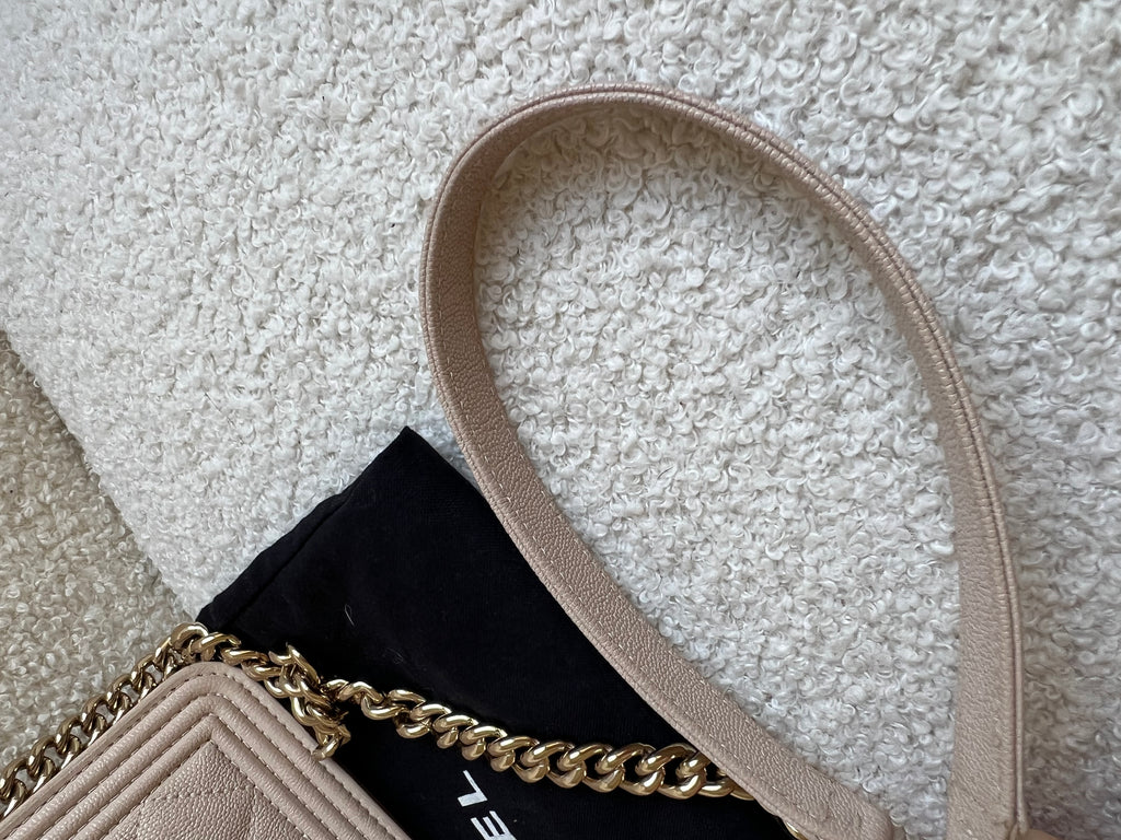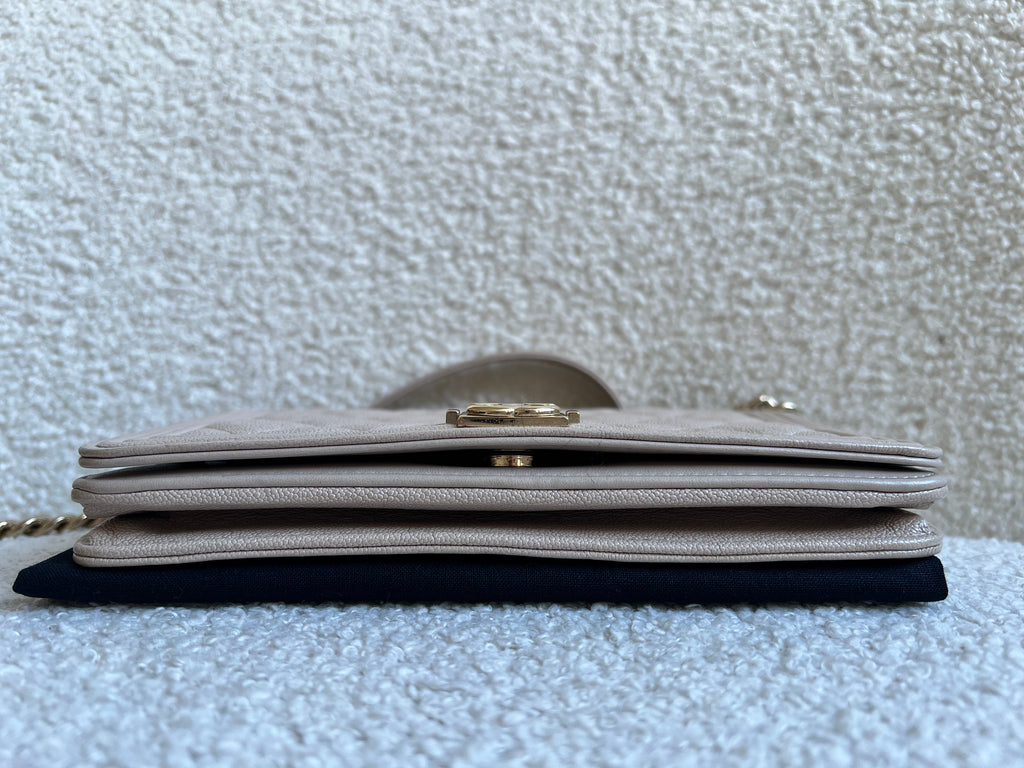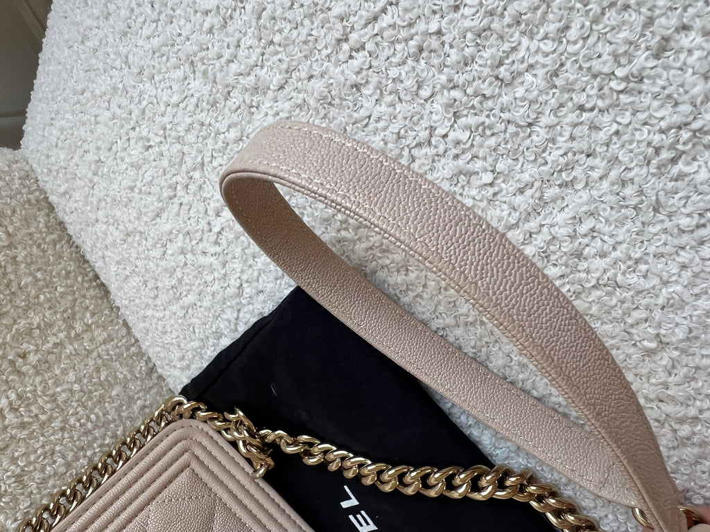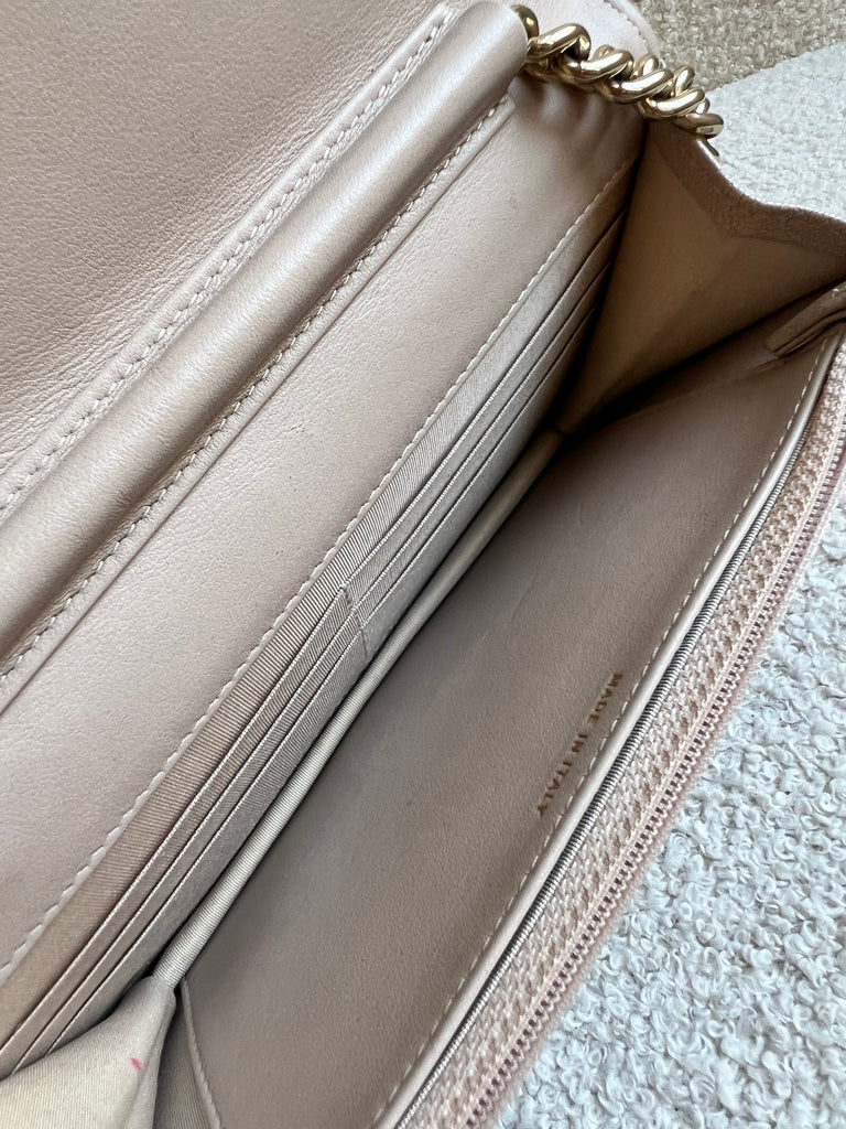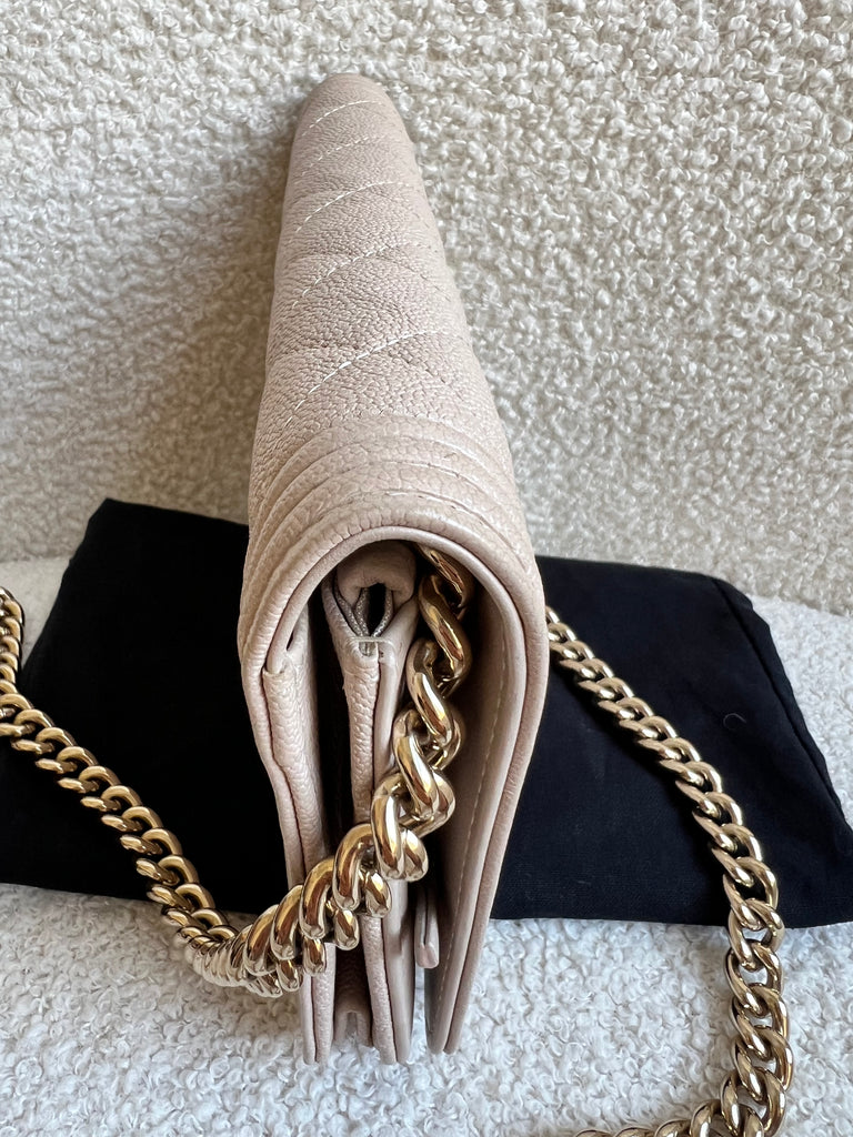 Chanel Boy Wallet on Chain in Ivory/Cream Quilted Caviar Leather with Gold Hardware. The ultimate evening style, the boy Chanel WOC is timeless and features the Boy CC hardware detailing on the front flap. The caviar leather is robust and resilient. Perfect for evening wear or night out to carry the essentials. Can be carried as a handheld clutch with the chain tucked inside, or worn over shoulder or cross body. Stunning nude, neutral shade that can be matched with any outfit.