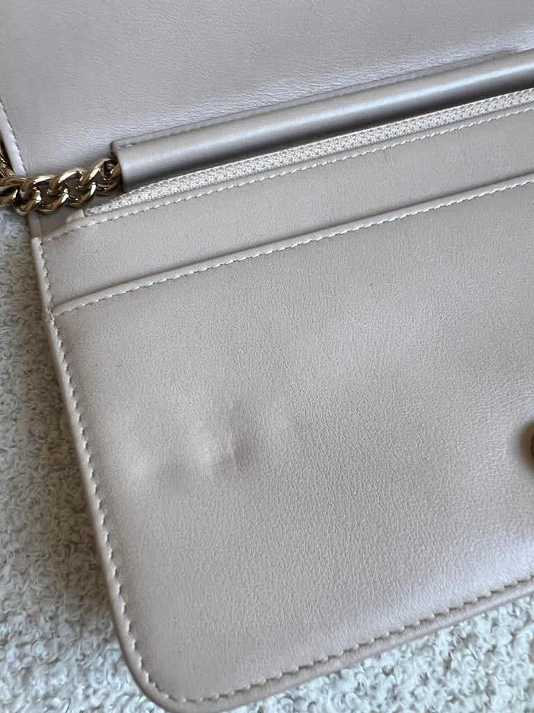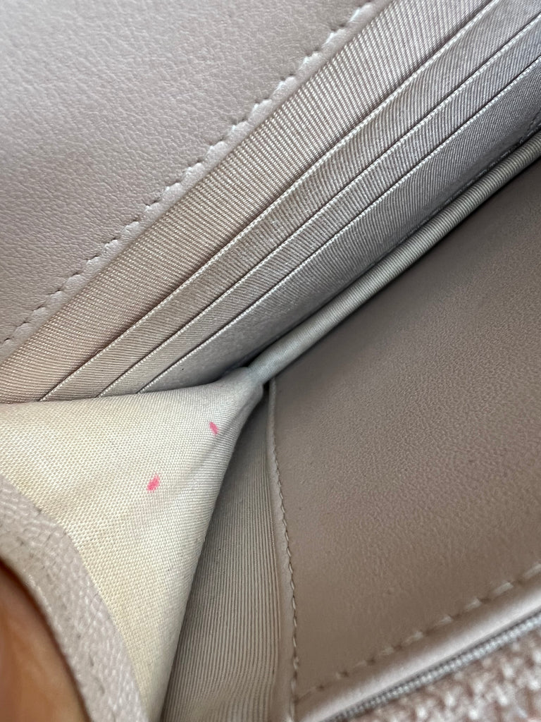 Exterior: Very good condition with small indentations beneath flap (from zipper resting on leather), and minor scuff to one corner.