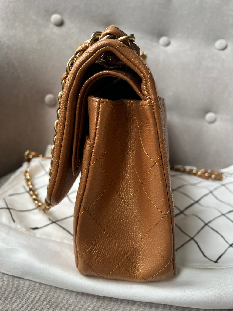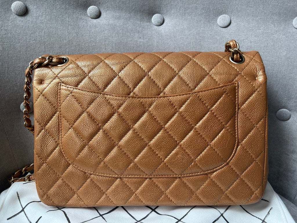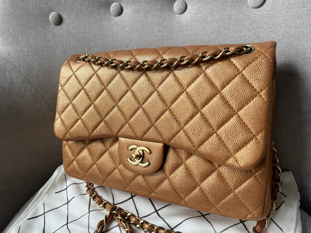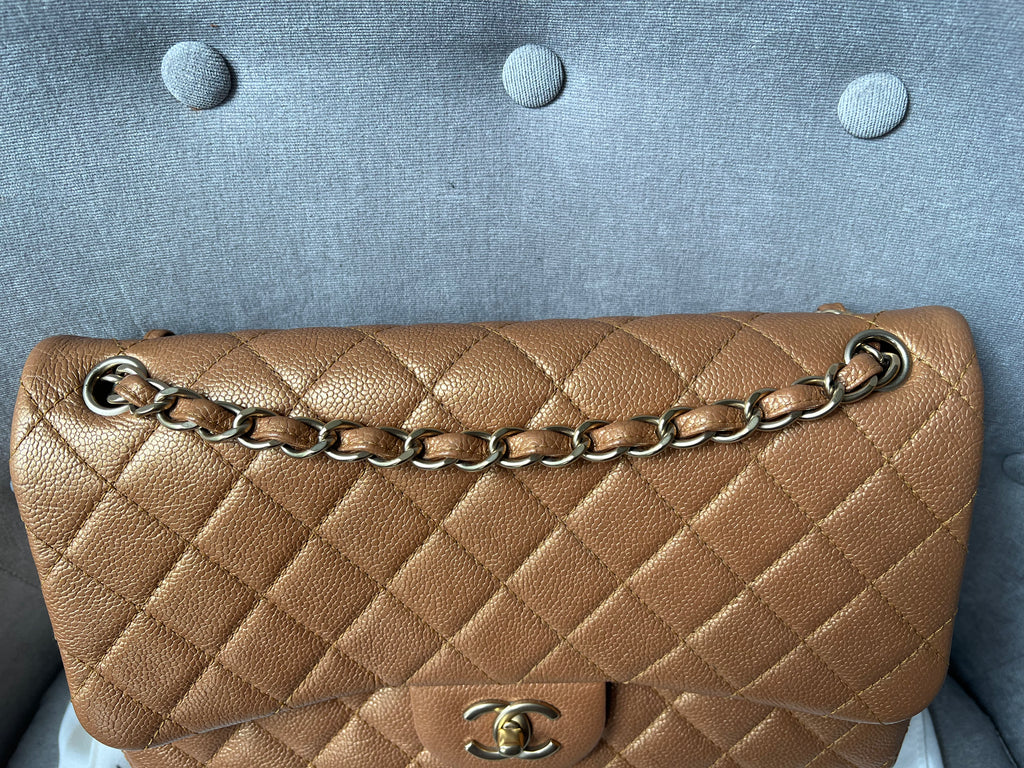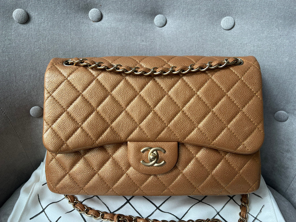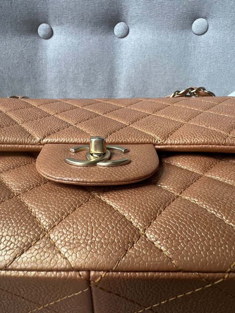 Chanel Jumbo Double Classic Flap Bag in Gold Caviar Leather with pale gold hardware. The ultimate Chanel bag, the Jumbo size is perfect for those who find the medium flap a little too small. This classic flap bag is timeless and features the iconic turnlock flap closure. The sliding chain allows the chain strap to be worn single or doubled up. Due to the length of the chain, this style can easily be worn cross body with the chain lengthened. The caviar leather is robust and resilient to marks and scratches. A great investment piece for those looking to own a classic Chanel in a statement colour. Gold/bronze shade.