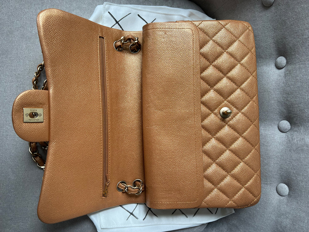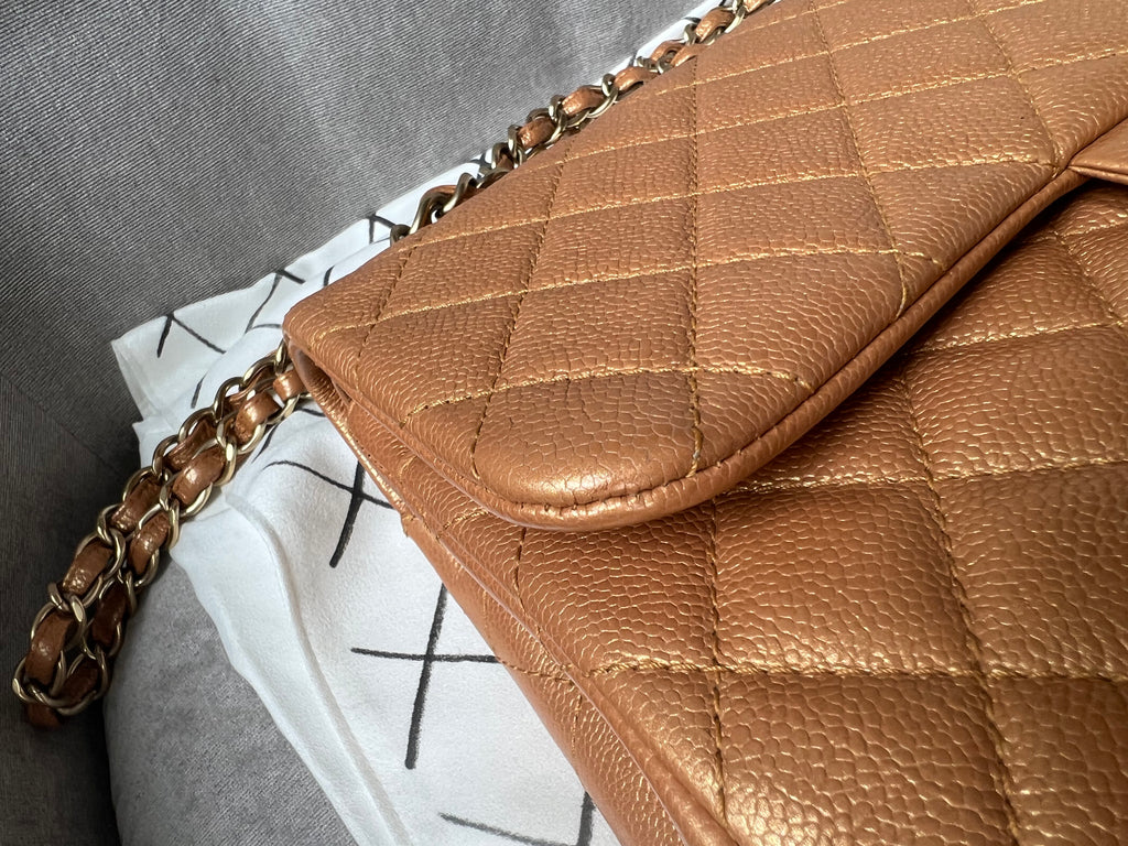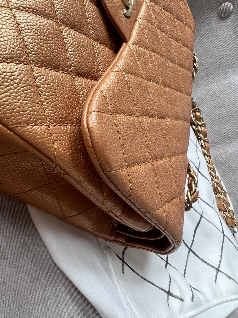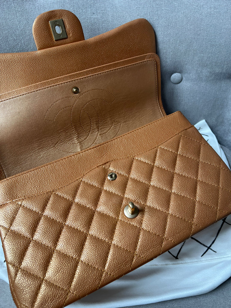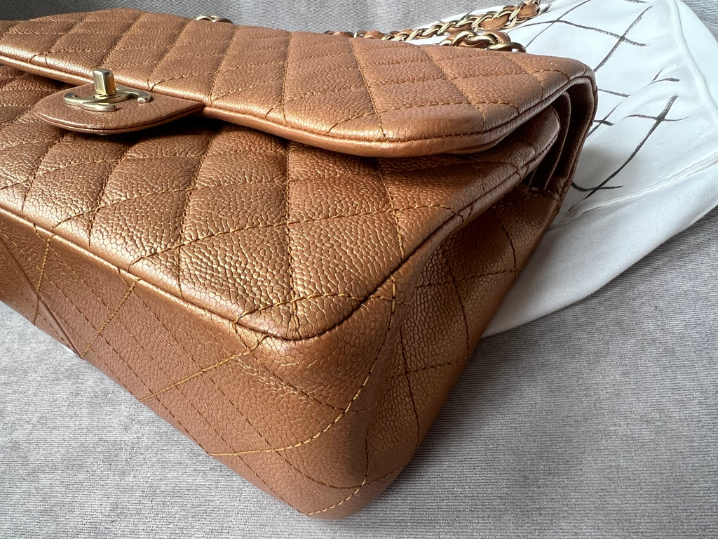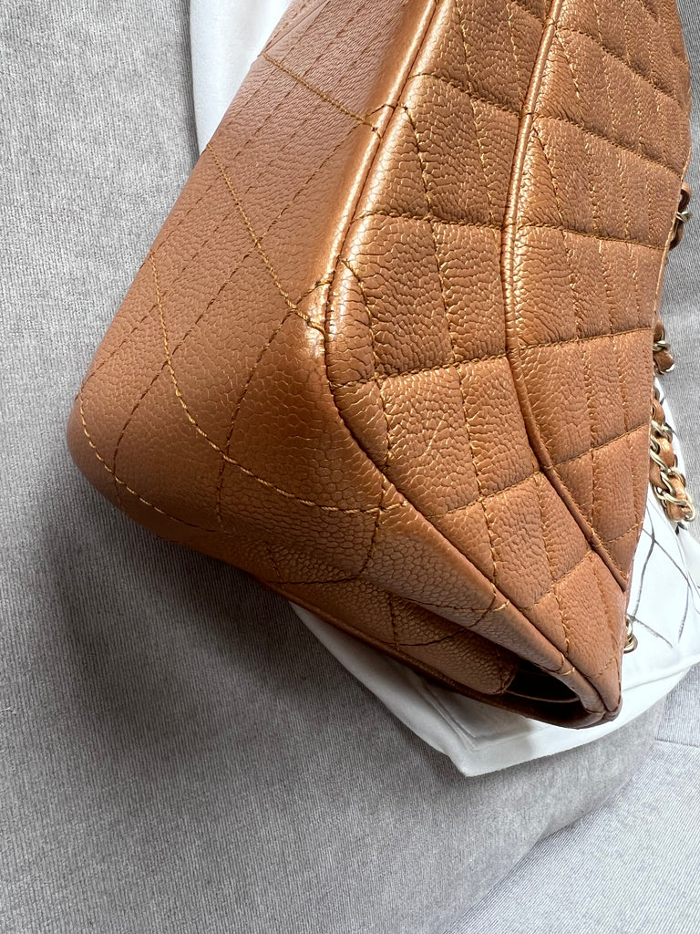 Chanel Jumbo Double Classic Flap Bag in Gold Caviar Leather with pale gold hardware. The ultimate Chanel bag, the Jumbo size is perfect for those who find the medium flap a little too small. This classic flap bag is timeless and features the iconic turnlock flap closure. The sliding chain allows the chain strap to be worn single or doubled up. Due to the length of the chain, this style can easily be worn cross body with the chain lengthened. The caviar leather is robust and resilient to marks and scratches. A great investment piece for those looking to own a classic Chanel in a statement colour. Gold/bronze shade.