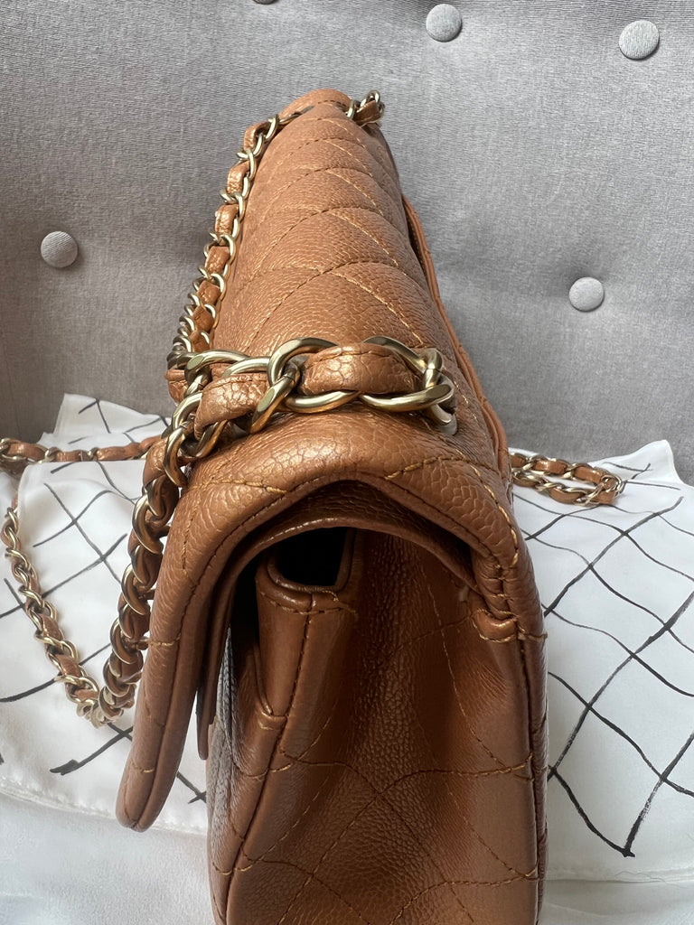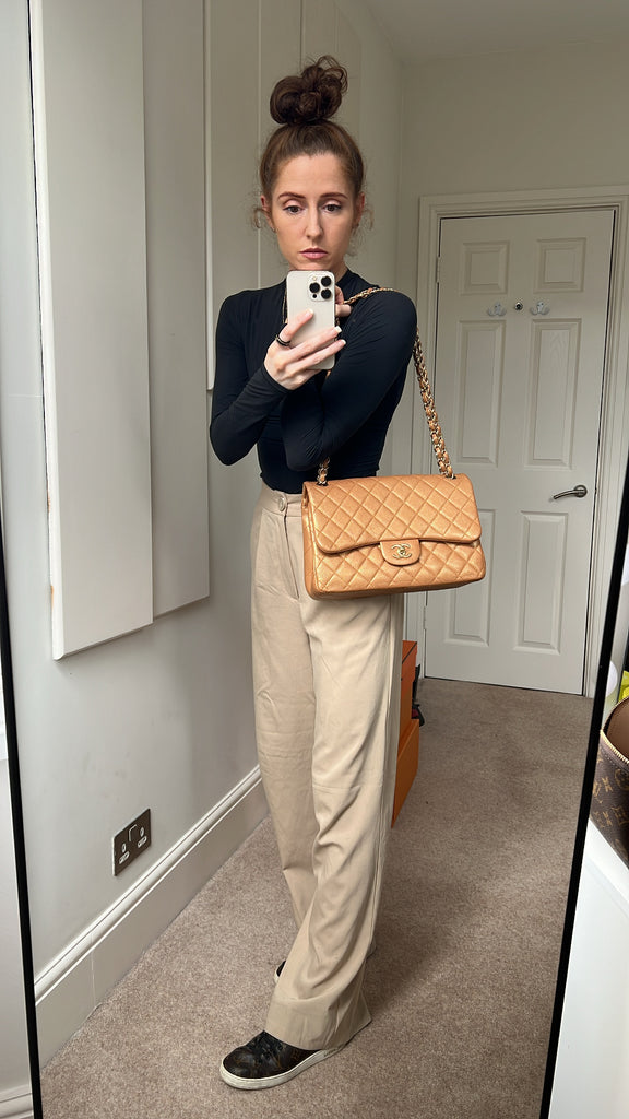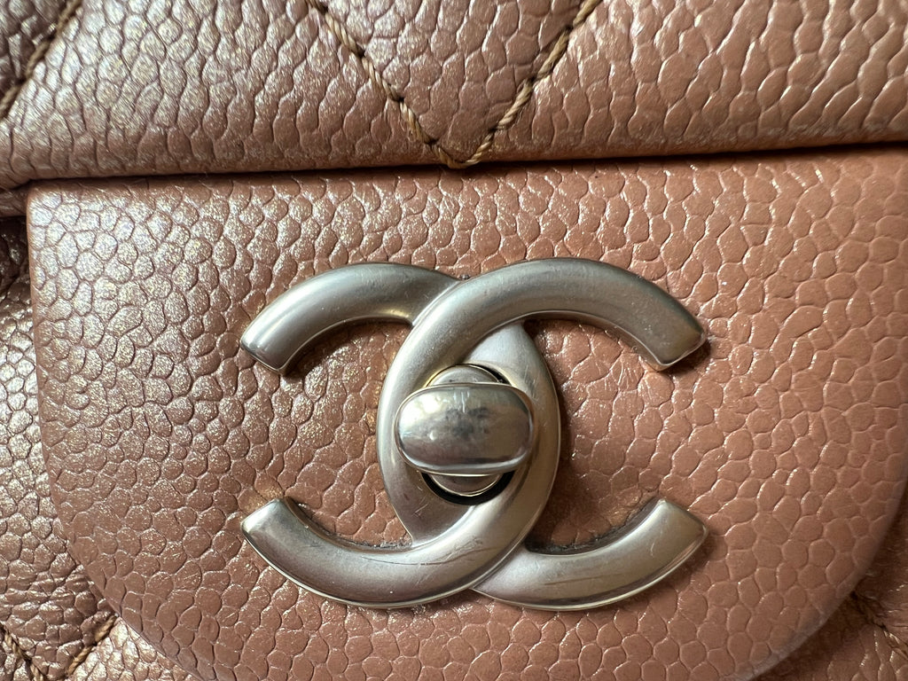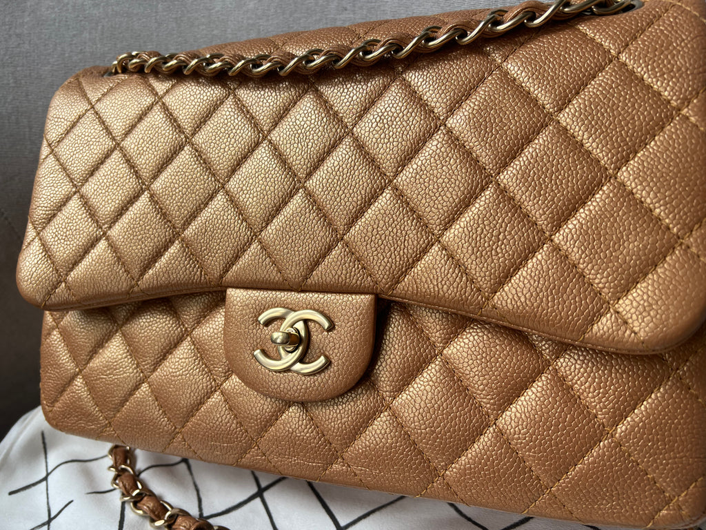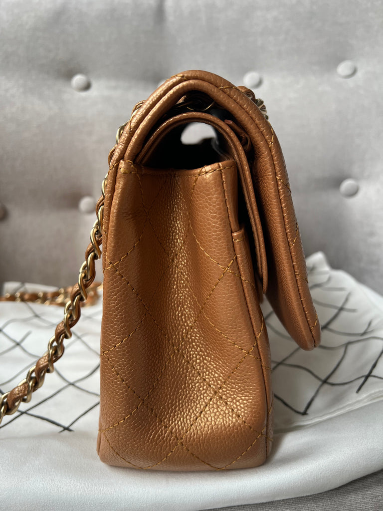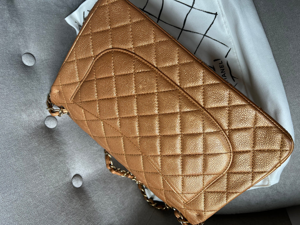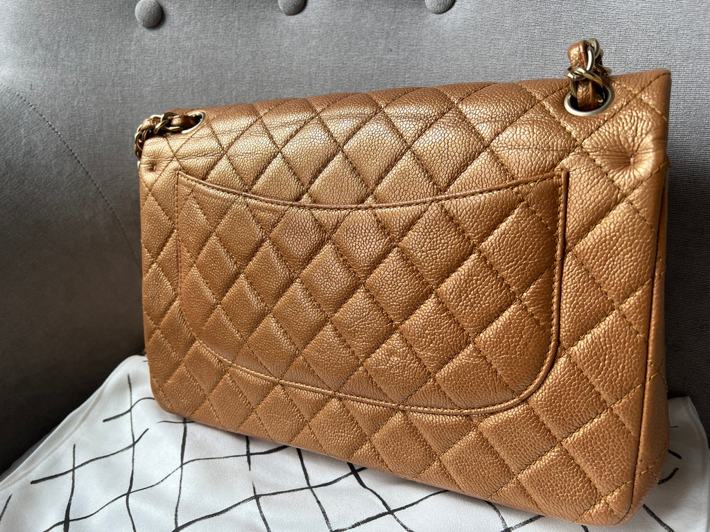 Chanel Jumbo Double Classic Flap Bag in Gold Caviar Leather with pale gold hardware. The ultimate Chanel bag, the Jumbo size is perfect for those who find the medium flap a little too small. This classic flap bag is timeless and features the iconic turnlock flap closure. The sliding chain allows the chain strap to be worn single or doubled up. Due to the length of the chain, this style can easily be worn cross body with the chain lengthened. The caviar leather is robust and resilient to marks and scratches. A great investment piece for those looking to own a classic Chanel in a statement colour. Gold/bronze shade.
