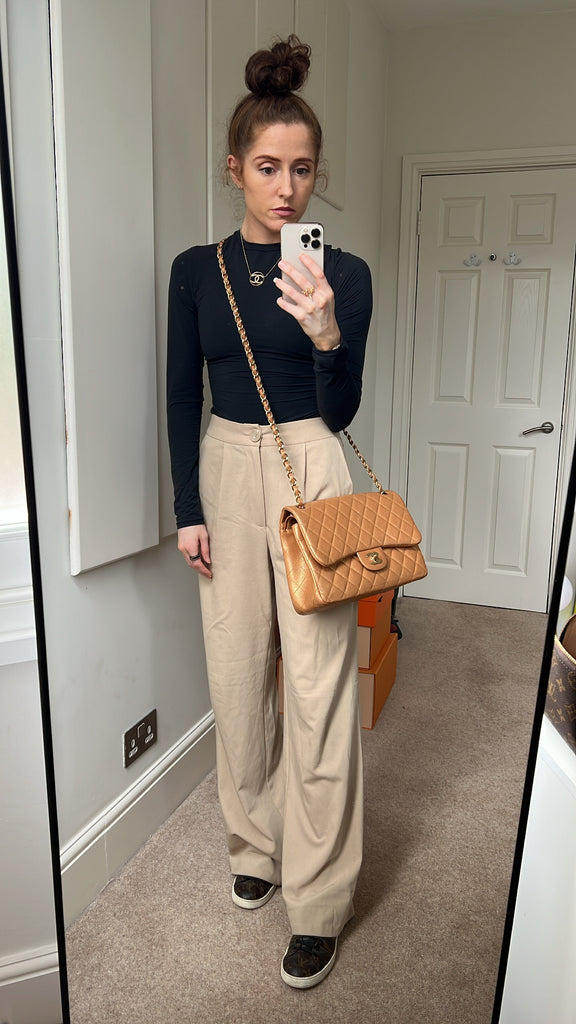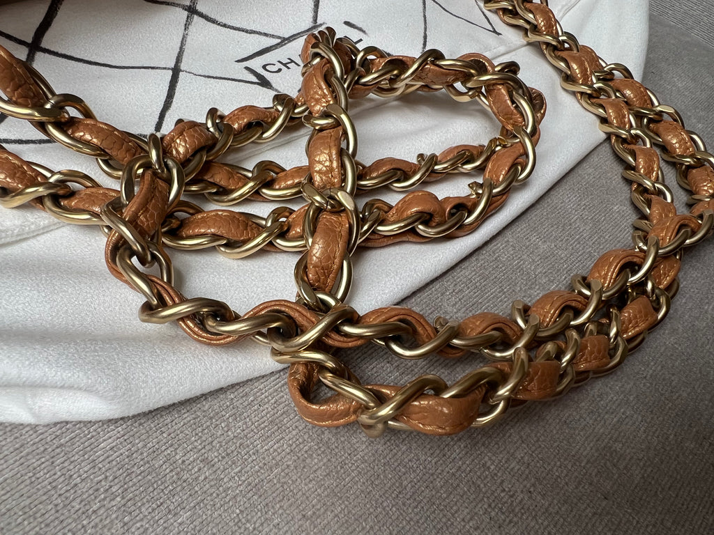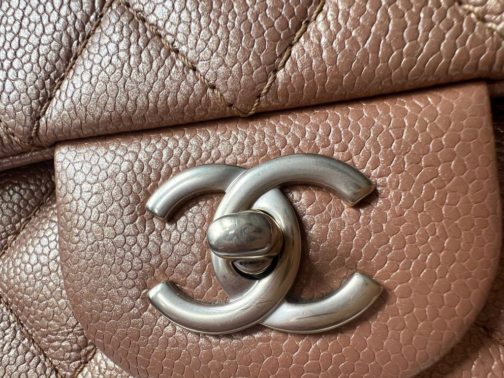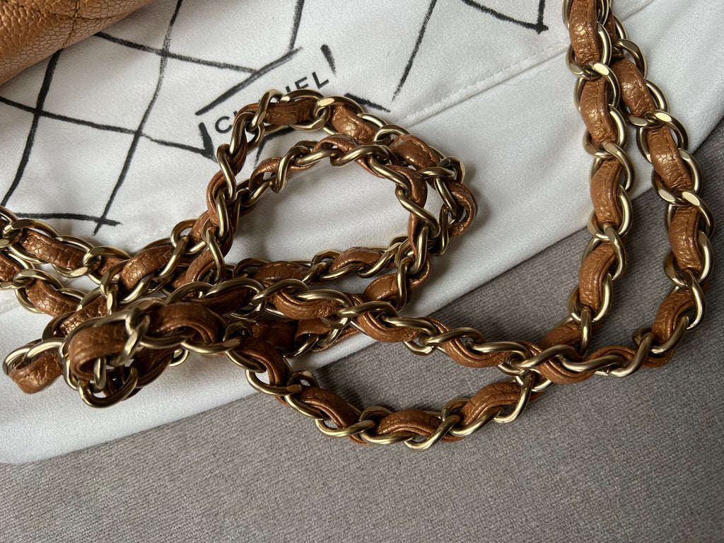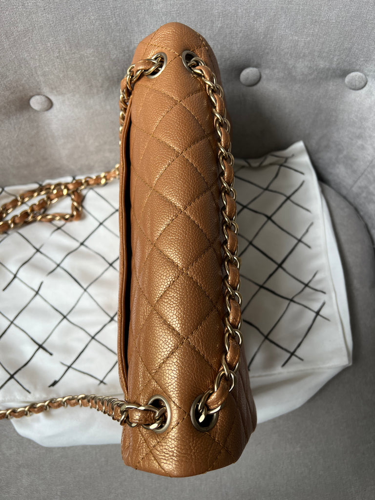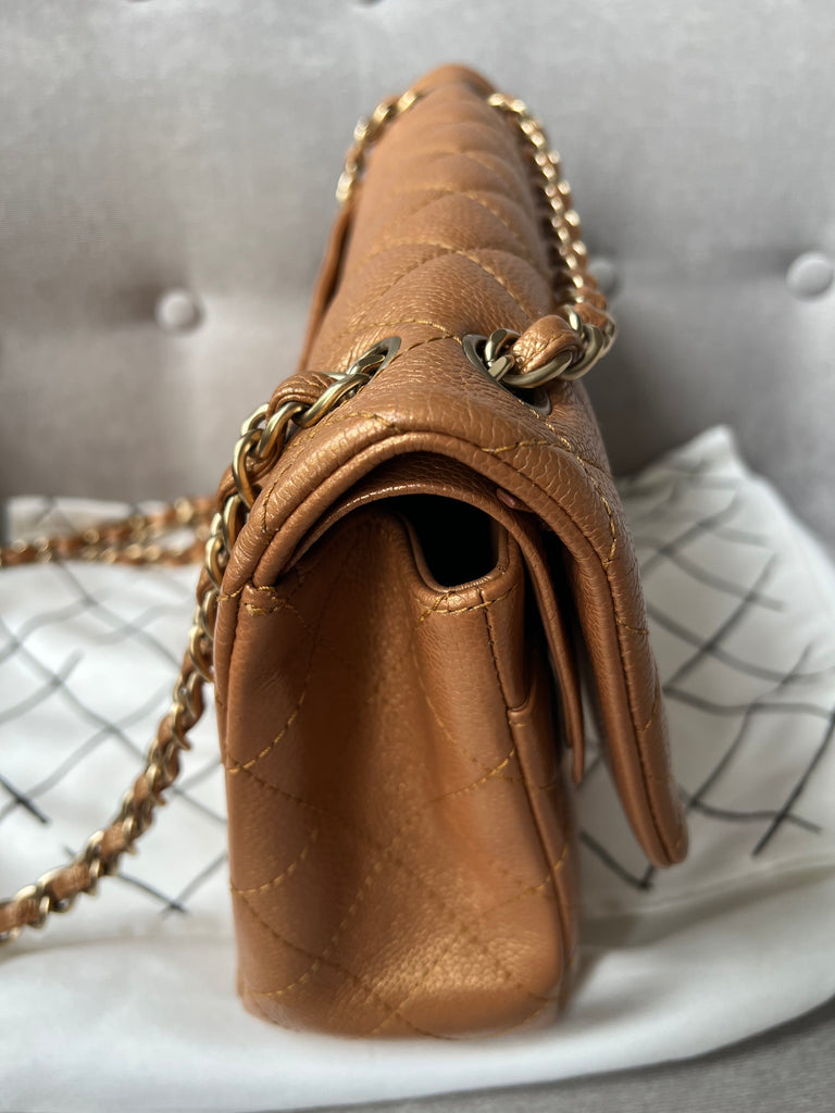 Chanel Jumbo Double Classic Flap Bag in Gold Caviar Leather with pale gold hardware. The ultimate Chanel bag, the Jumbo size is perfect for those who find the medium flap a little too small. This classic flap bag is timeless and features the iconic turnlock flap closure. The sliding chain allows the chain strap to be worn single or doubled up. Due to the length of the chain, this style can easily be worn cross body with the chain lengthened. The caviar leather is robust and resilient to marks and scratches. A great investment piece for those looking to own a classic Chanel in a statement colour. Gold/bronze shade.