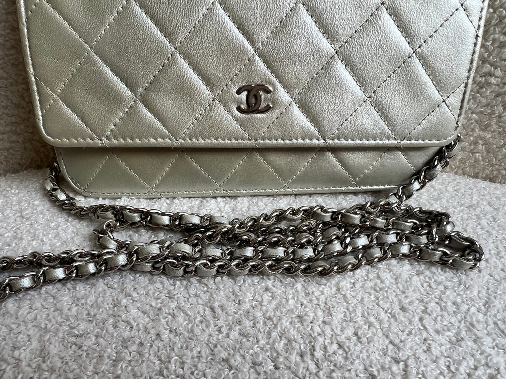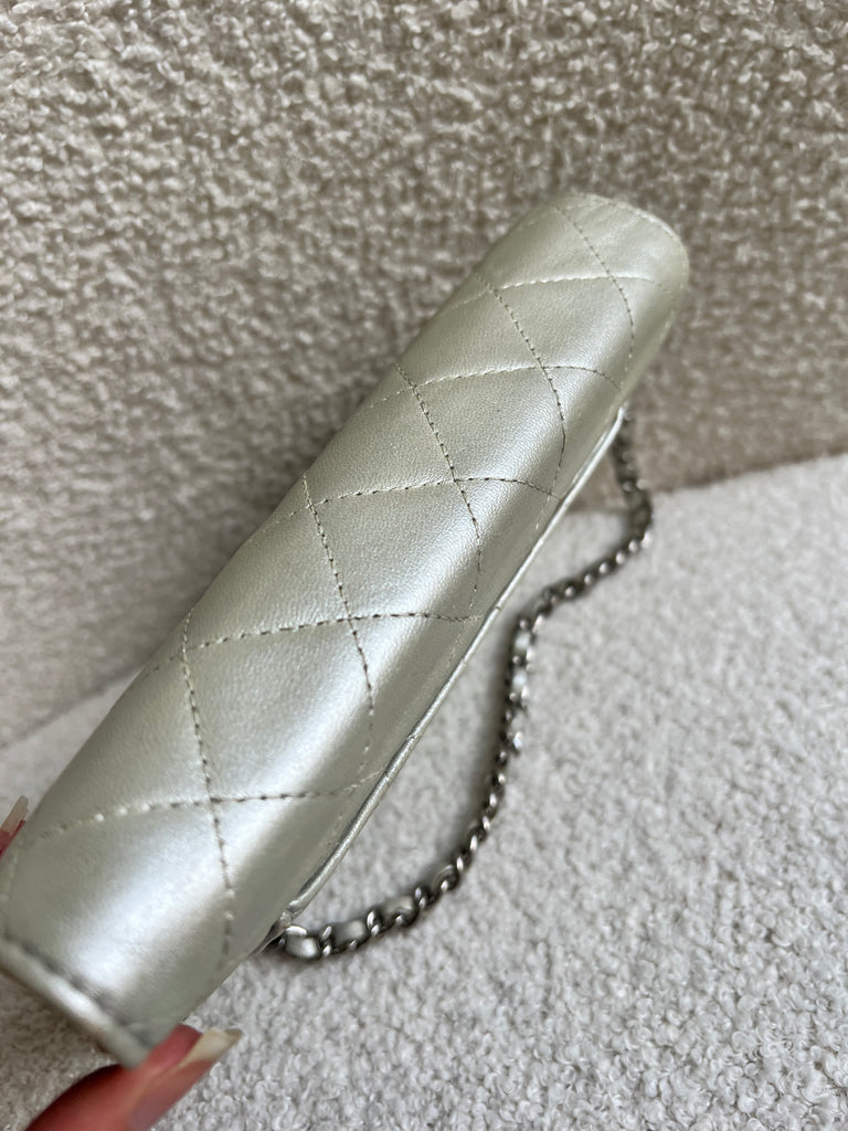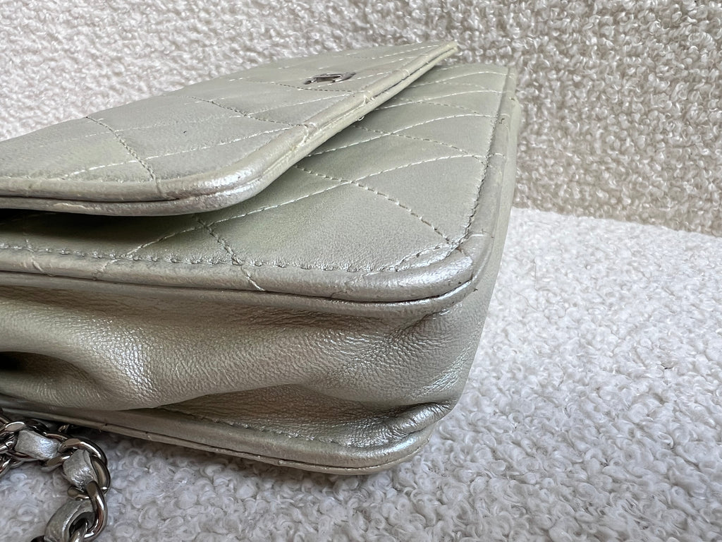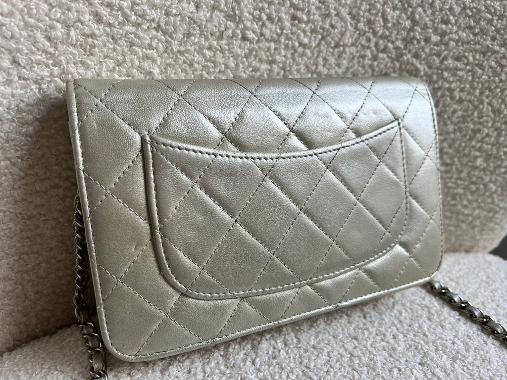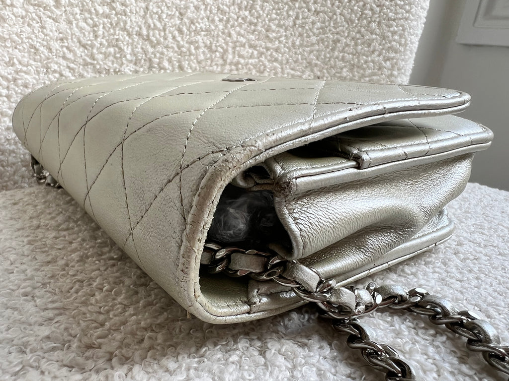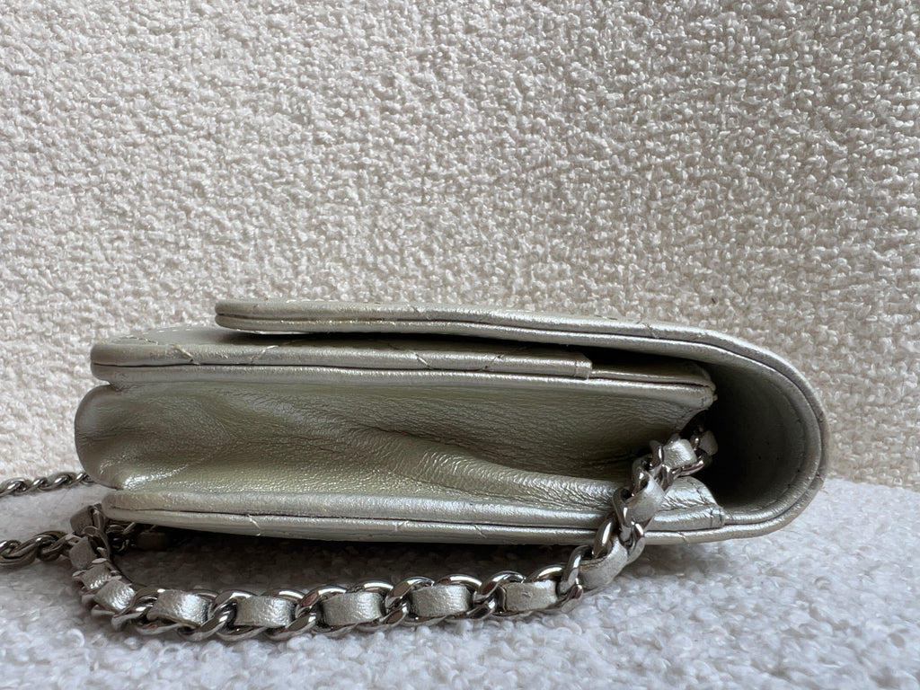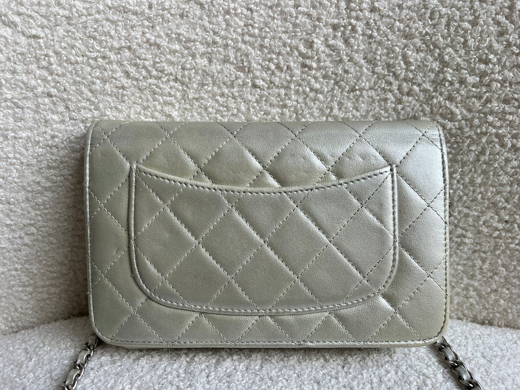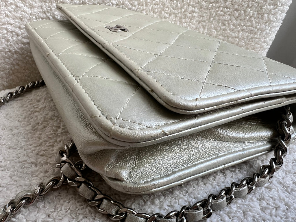 Chanel Silver Pearlescent Lambskin Wallet on Chain