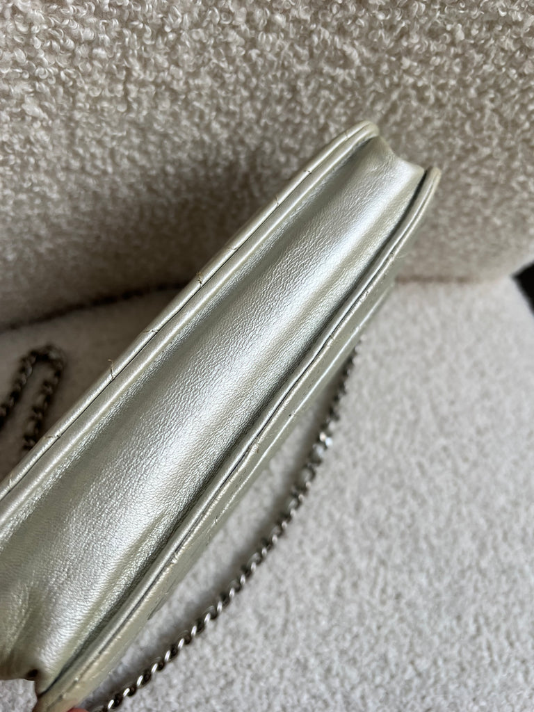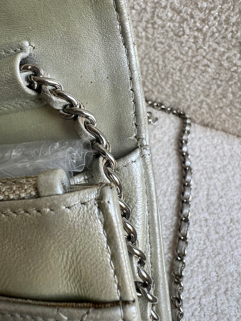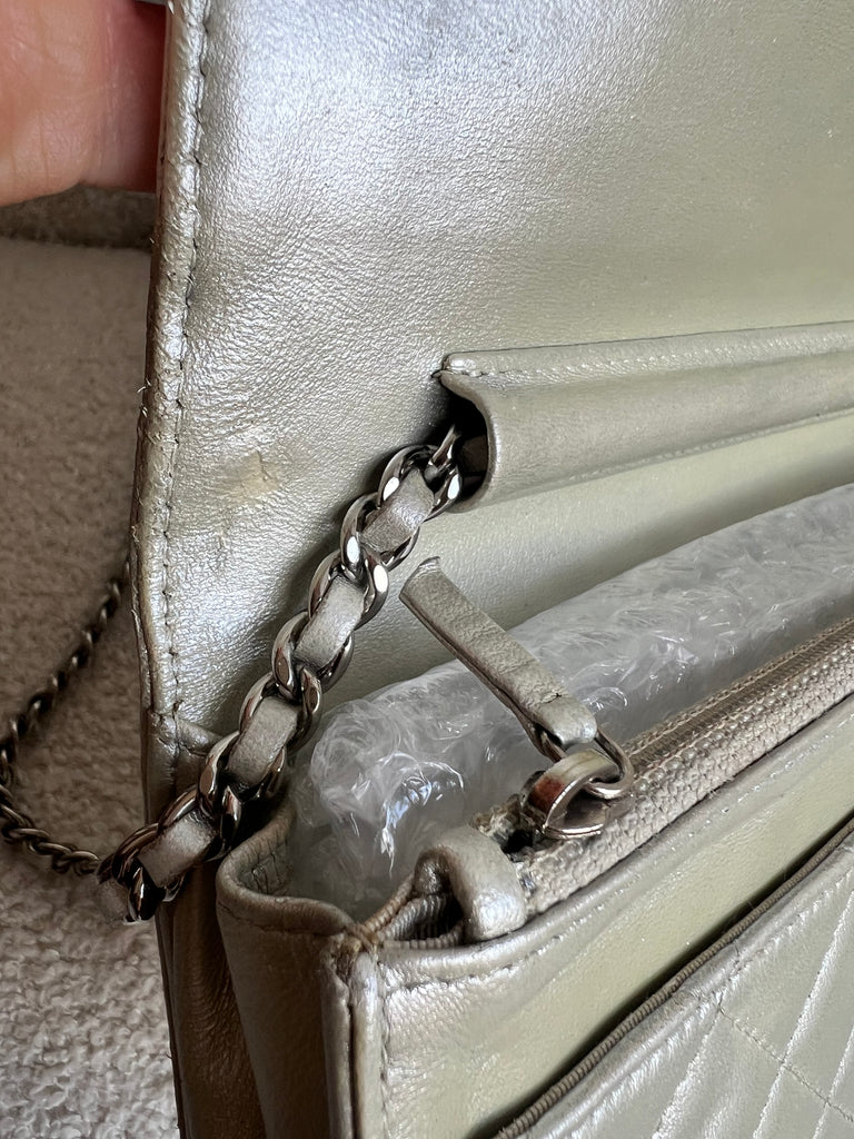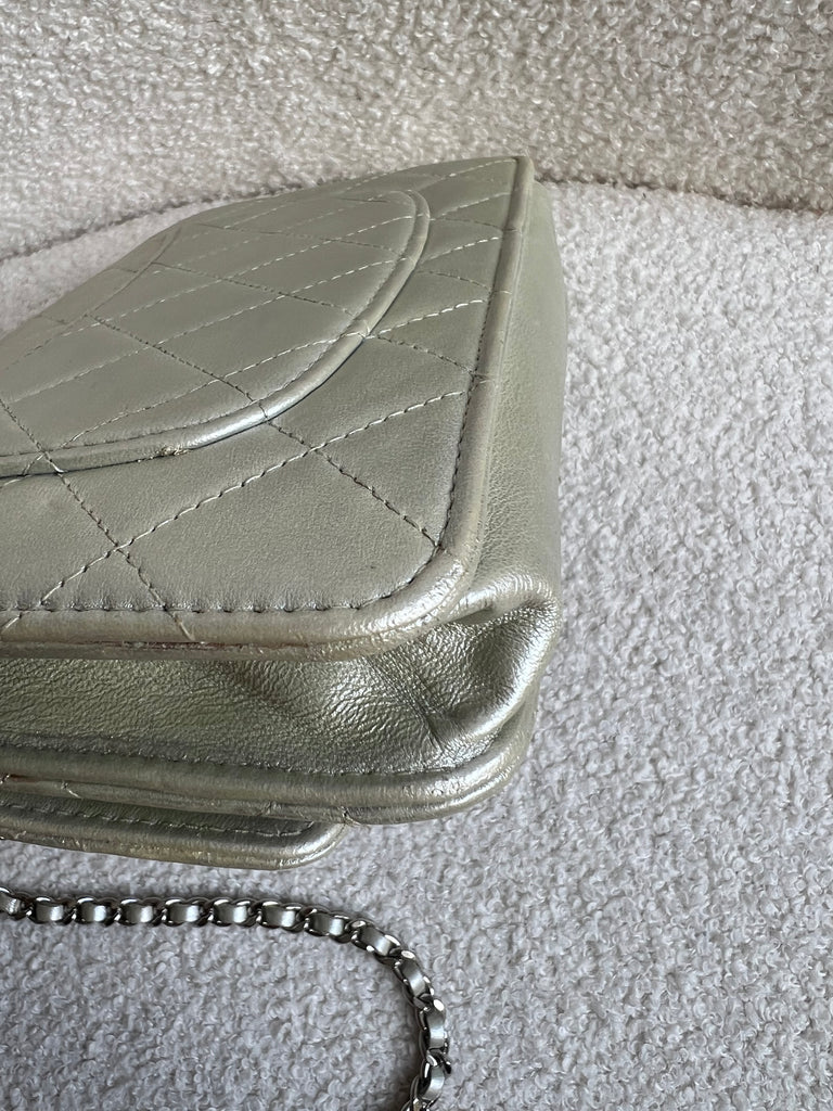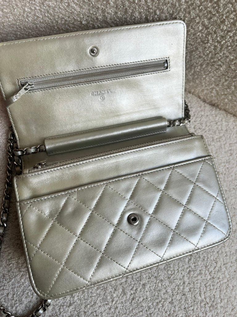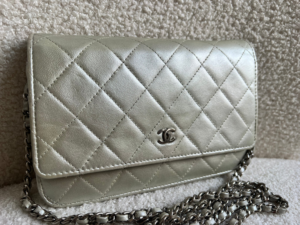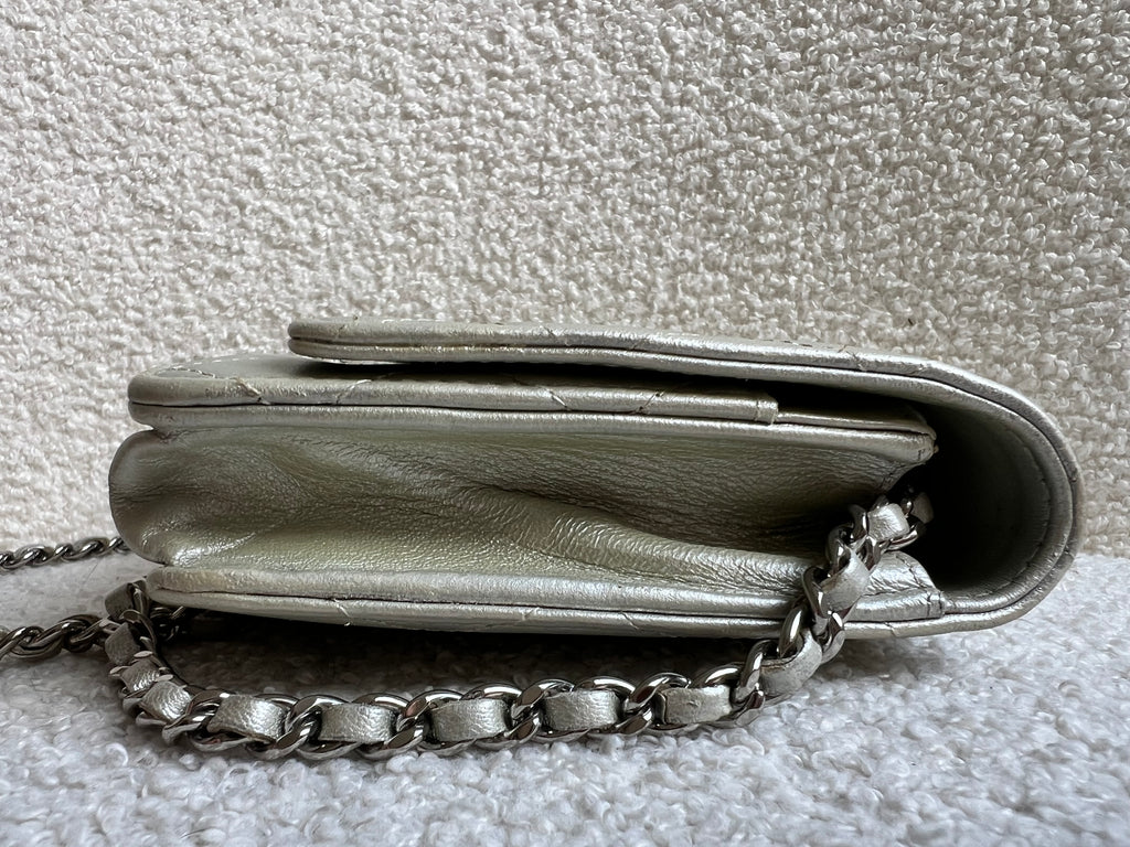 Chanel Silver Pearlescent Lambskin Wallet on Chain