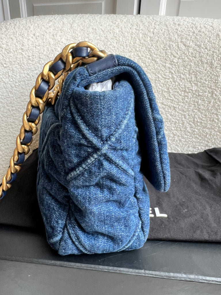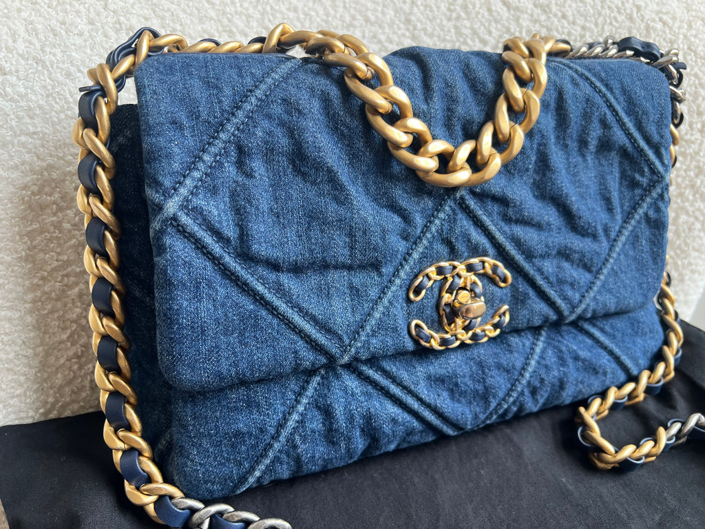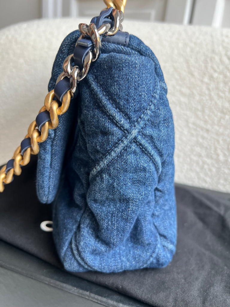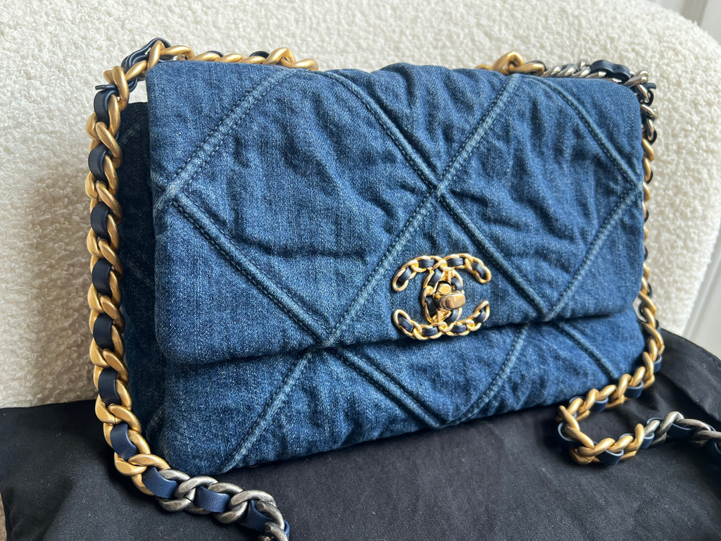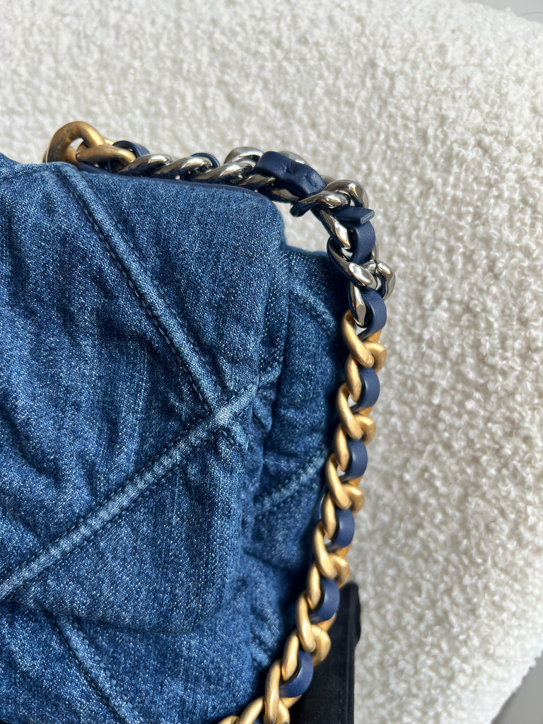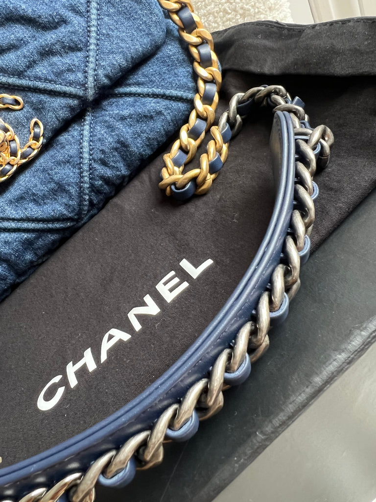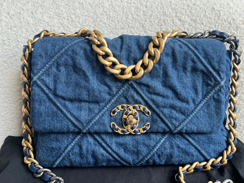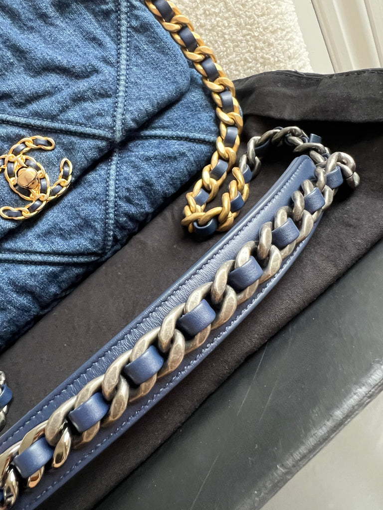 Chanel Small 19 in Blue Denim with Mixed (Gold and Silver) hardware. This classic denim and on trend Chanel 19 flap bag is highly sought after. The chunky interwoven chain can be used as a top handle or sits elegantly on your shoulder. Can be carried by the top handle or cross body with the longer strap subject to size. Although termed "small" it is more medium in size for this style of bag. Goes with almost any outfit.