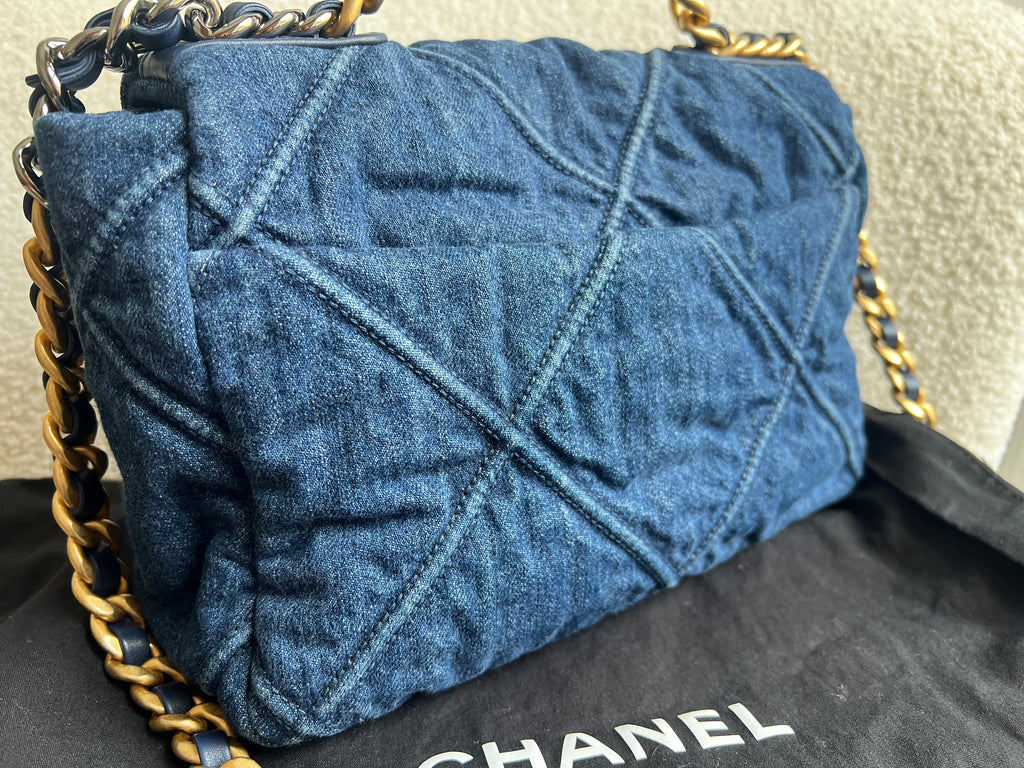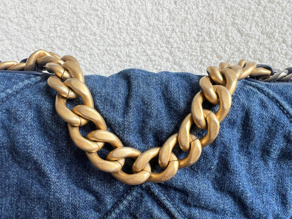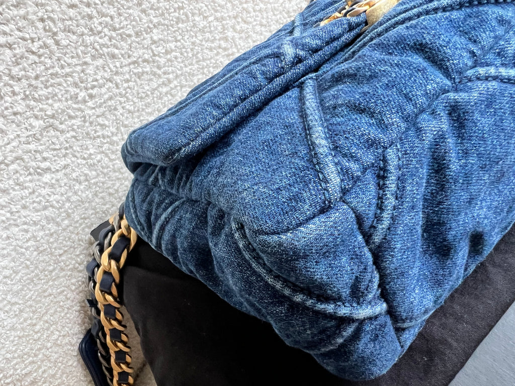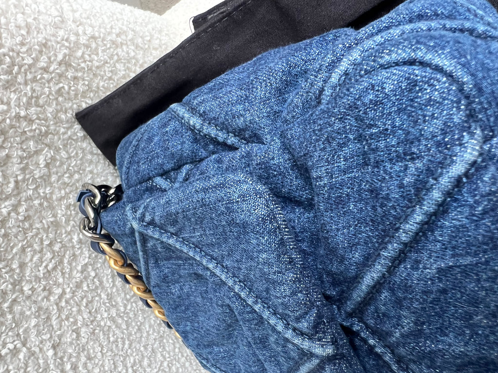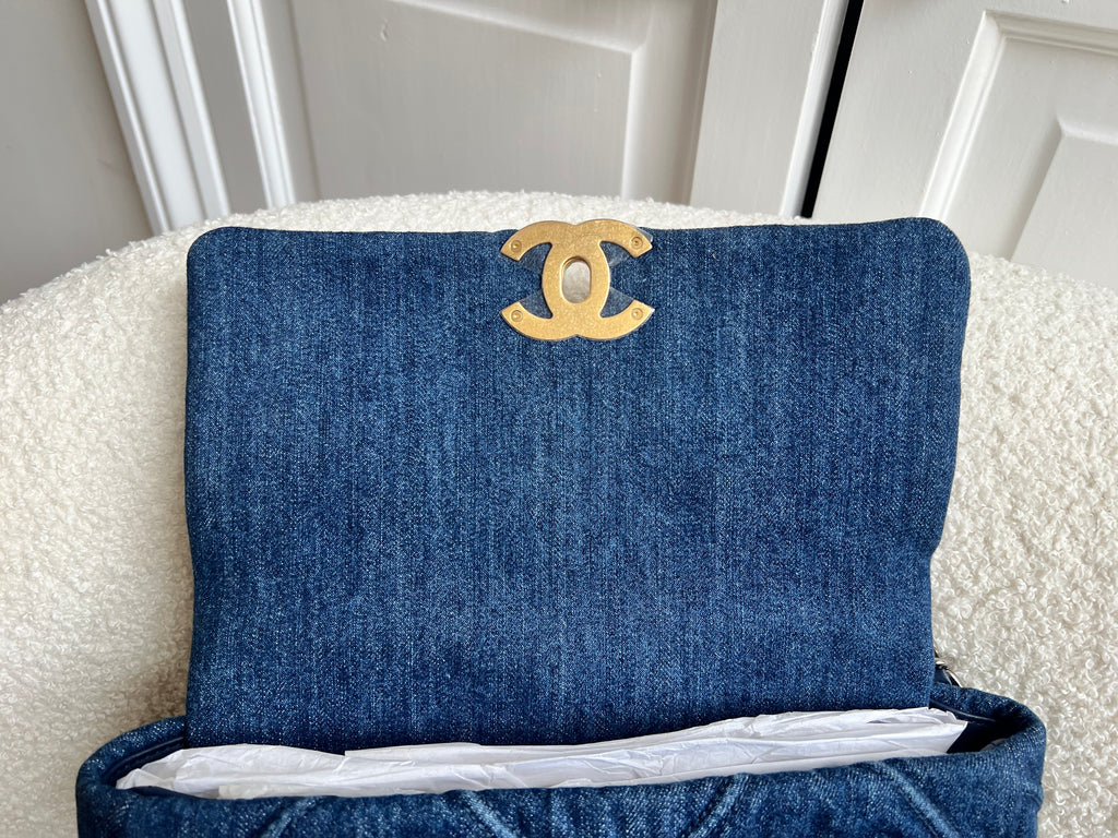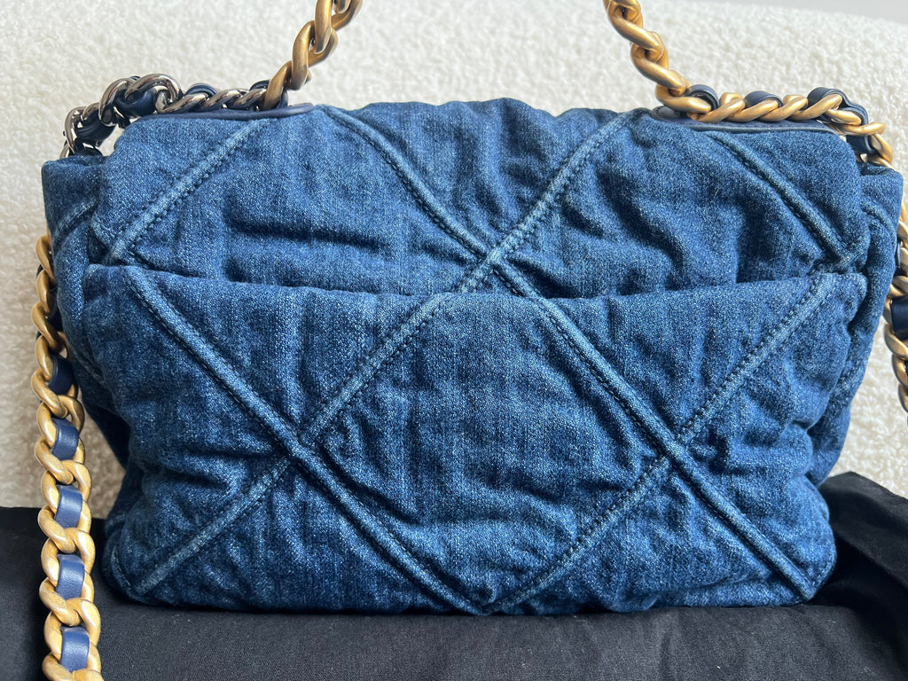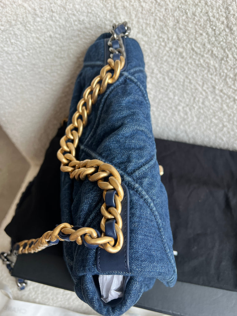 Chanel Small 19 in Blue Denim with Mixed (Gold and Silver) hardware. This classic denim and on trend Chanel 19 flap bag is highly sought after. The chunky interwoven chain can be used as a top handle or sits elegantly on your shoulder. Can be carried by the top handle or cross body with the longer strap subject to size. Although termed "small" it is more medium in size for this style of bag. Goes with almost any outfit.
