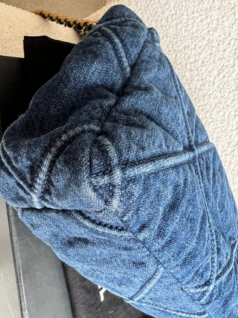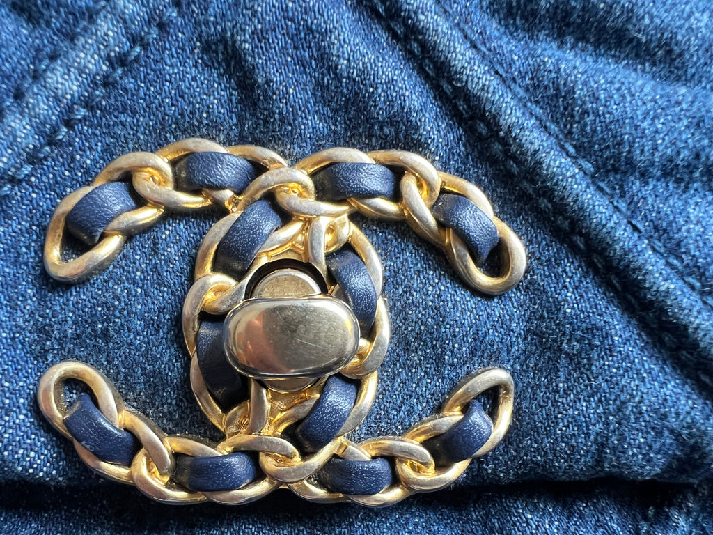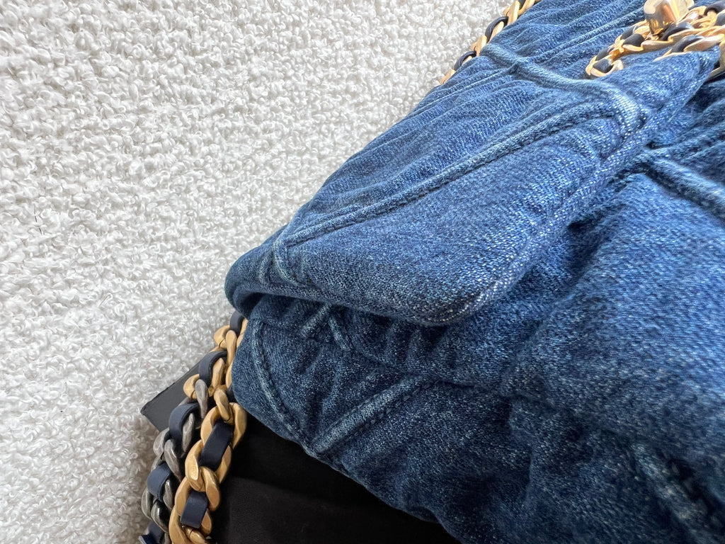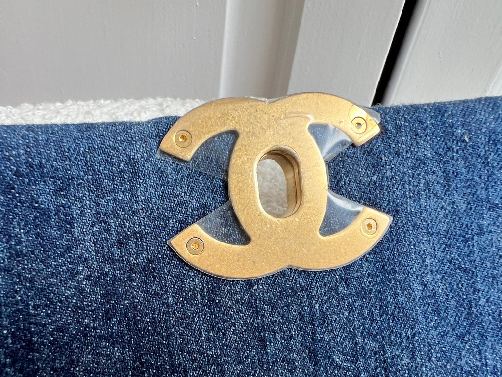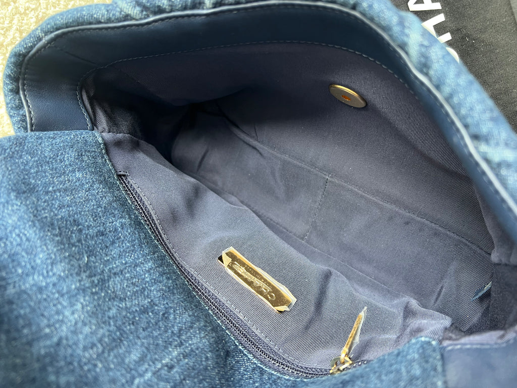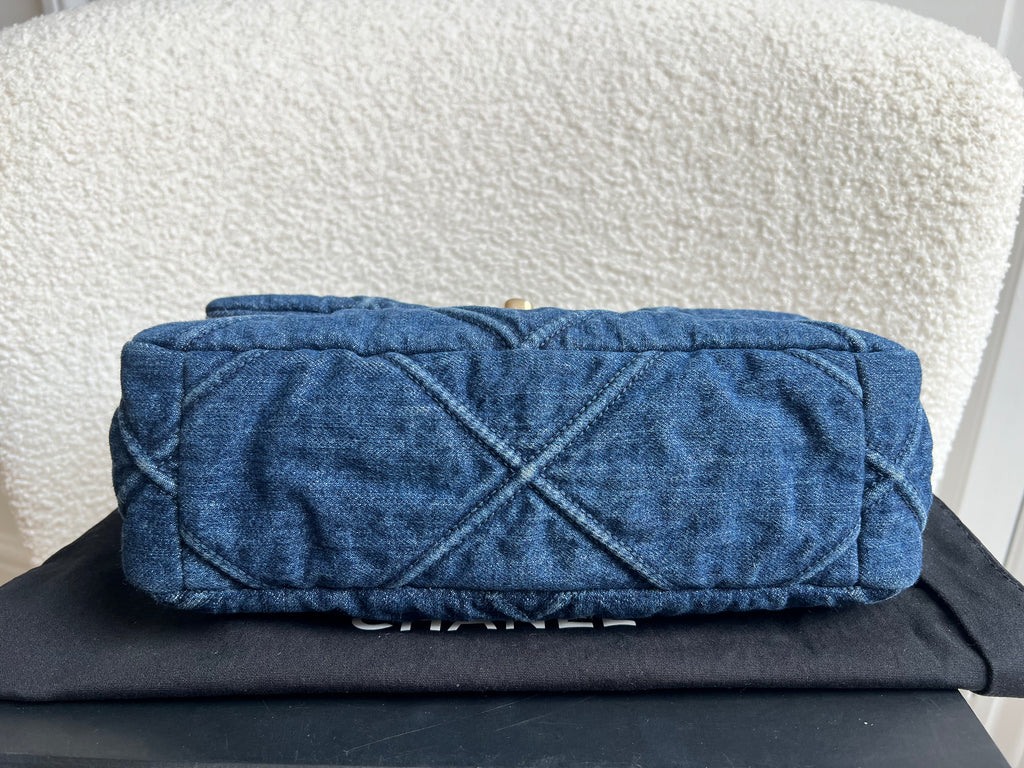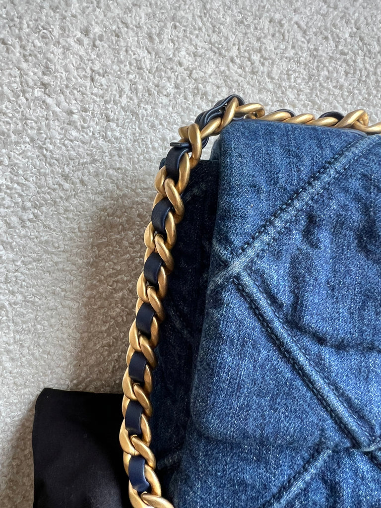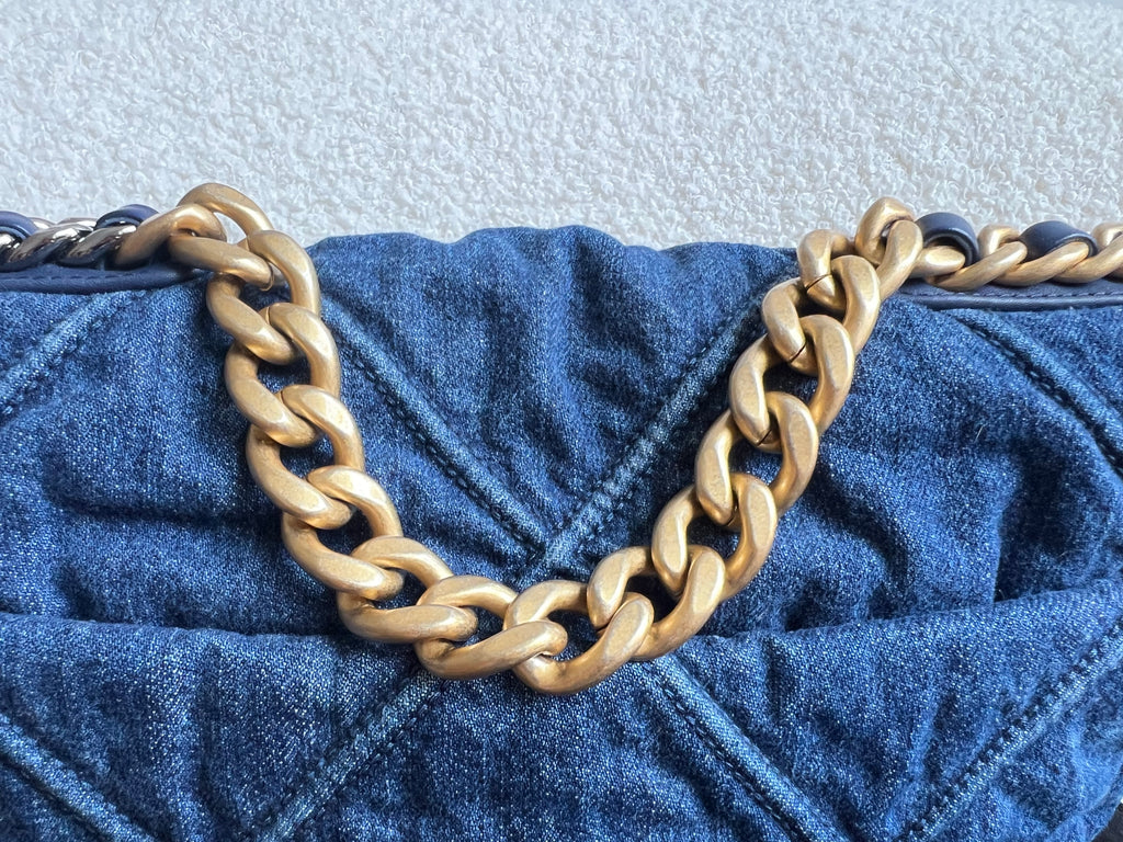 Chanel Small 19 in Blue Denim with Mixed (Gold and Silver) hardware. This classic denim and on trend Chanel 19 flap bag is highly sought after. The chunky interwoven chain can be used as a top handle or sits elegantly on your shoulder. Can be carried by the top handle or cross body with the longer strap subject to size. Although termed "small" it is more medium in size for this style of bag. Goes with almost any outfit.