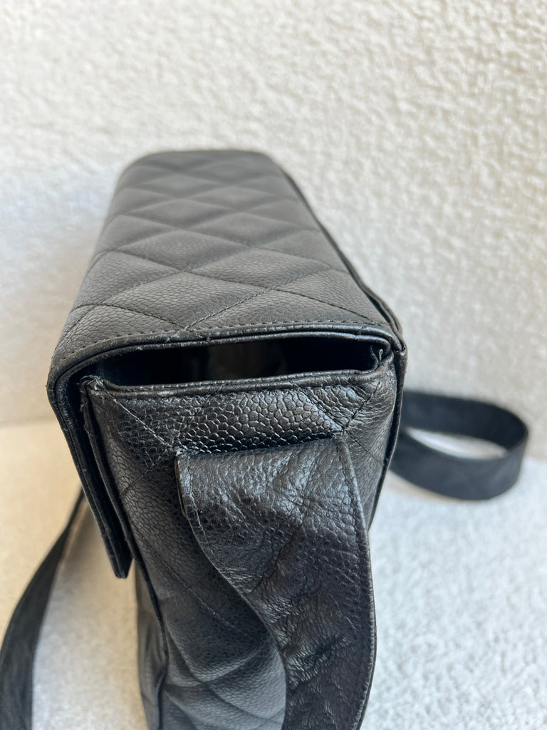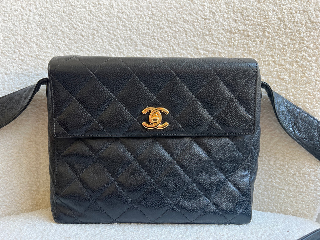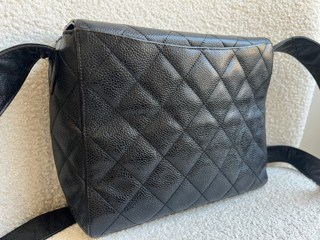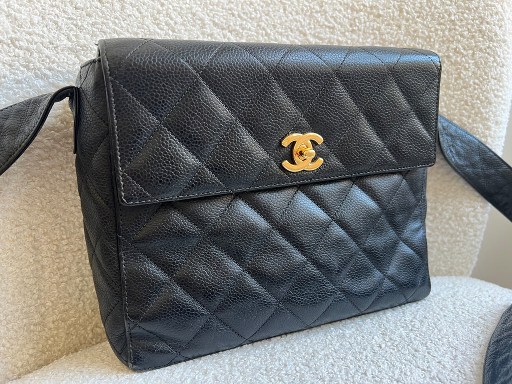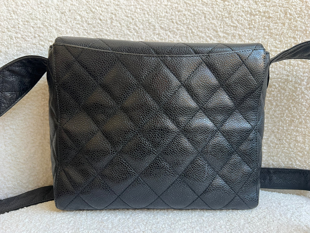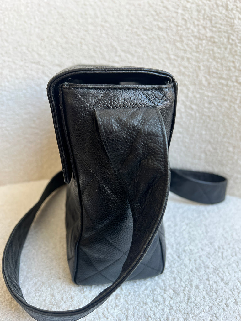 Chanel Vintage Black Caviar Square Messenger Bag. The practical style is crafted from the robust caviar leather and has a small - medium capacity. Ideal for day to day wear and has a lower price tag than some other Chanel styles. Featuring a long leather strap, it can be worn over the shoulder or cross body. Flap closure with turnlock hardware.