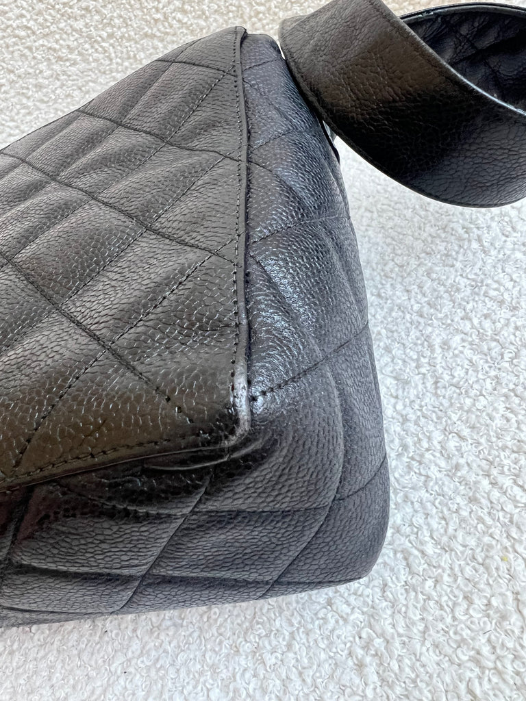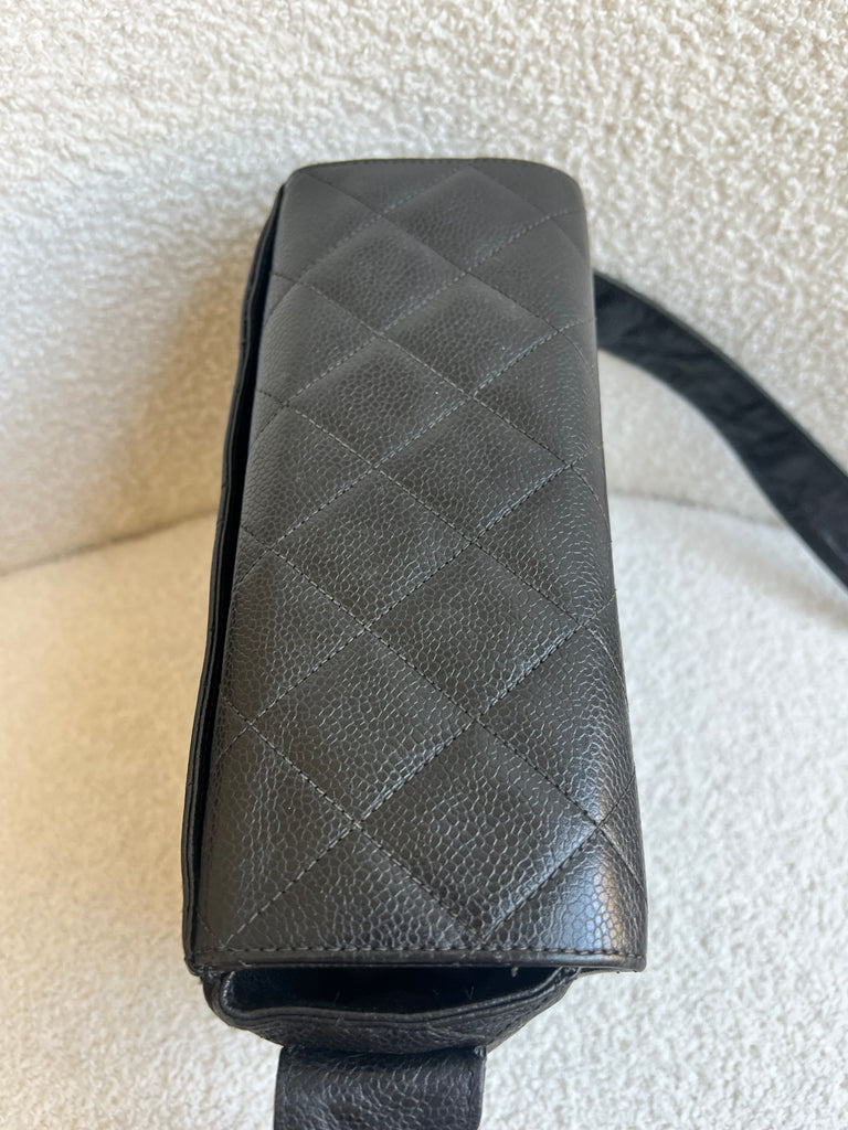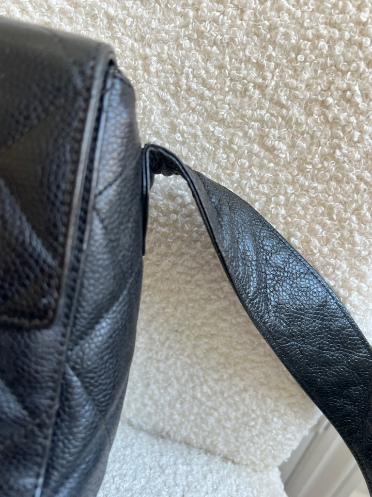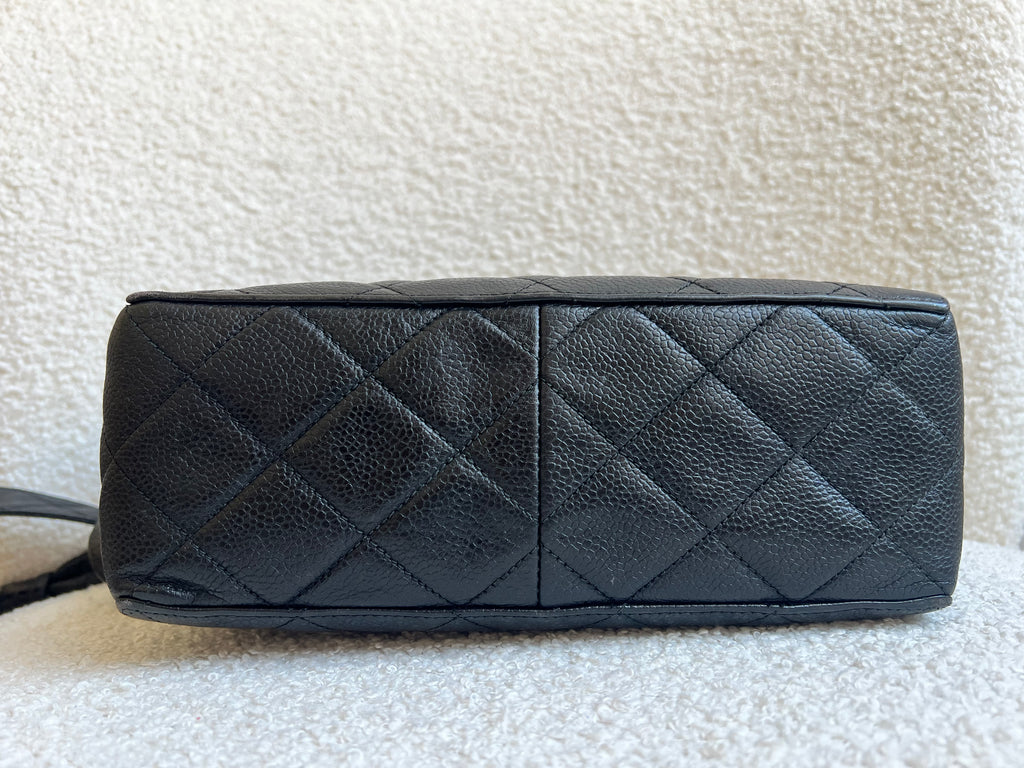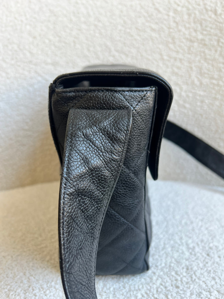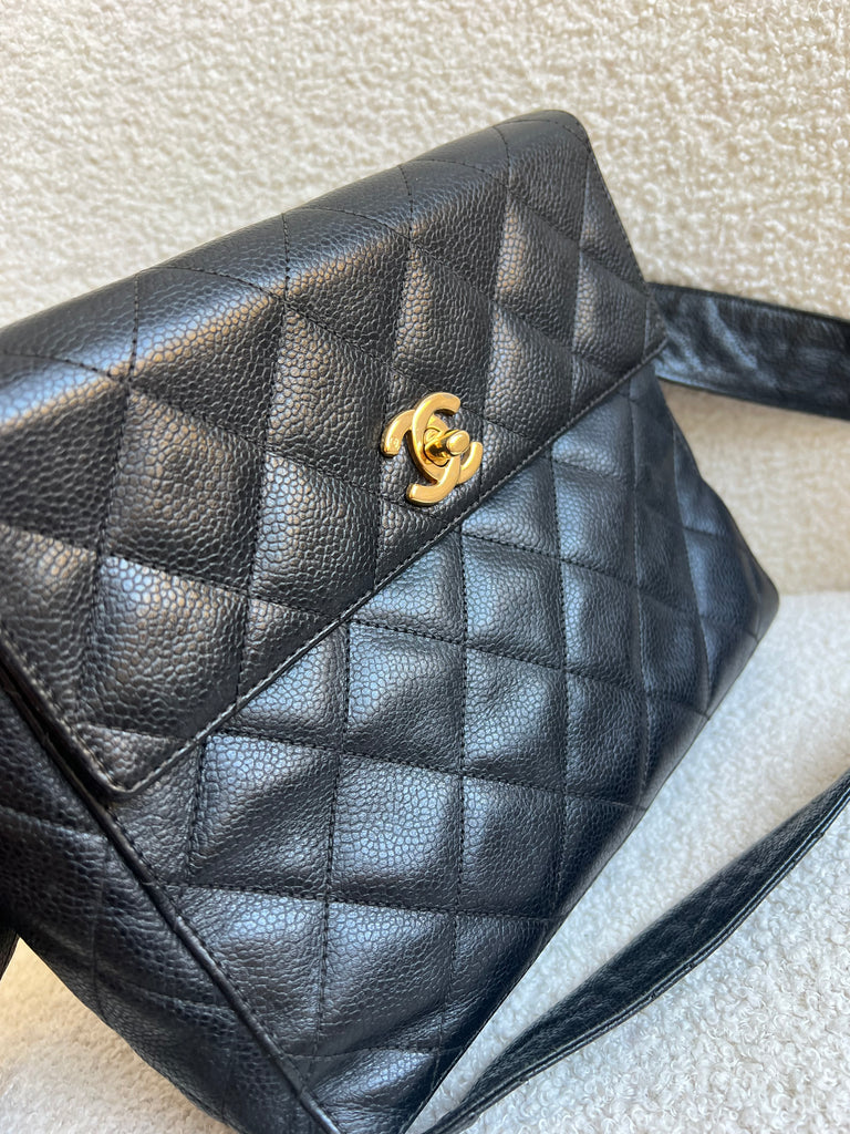 Chanel Vintage Black Caviar Square Messenger Bag. The practical style is crafted from the robust caviar leather and has a small - medium capacity. Ideal for day to day wear and has a lower price tag than some other Chanel styles. Featuring a long leather strap, it can be worn over the shoulder or cross body. Flap closure with turnlock hardware.