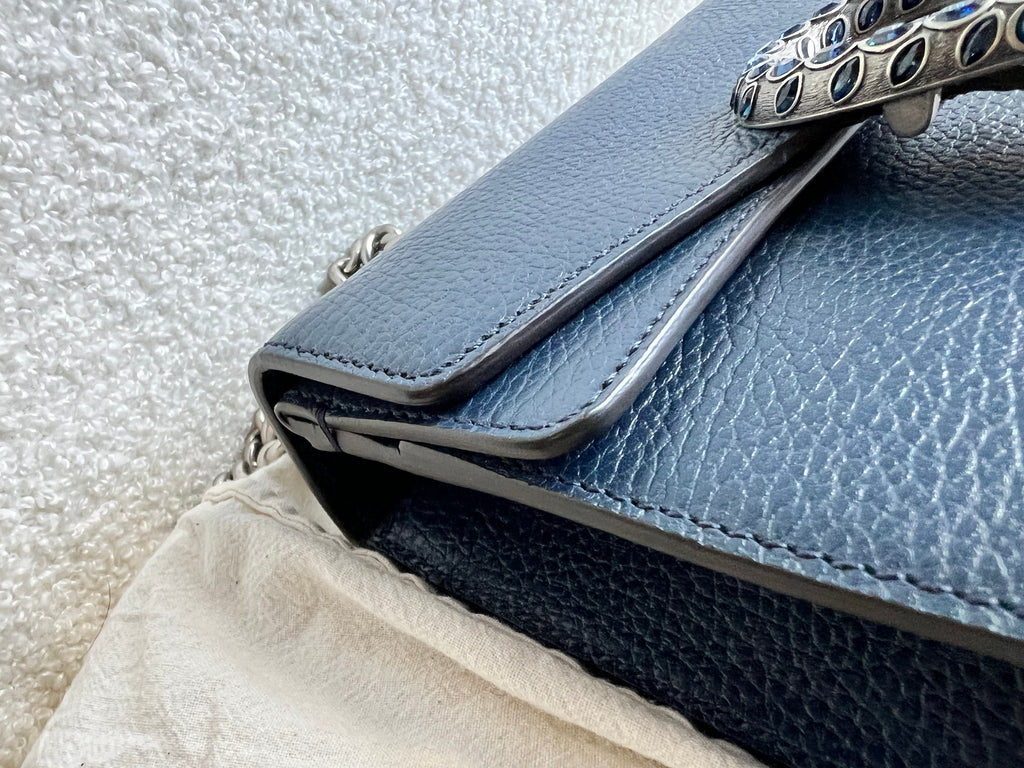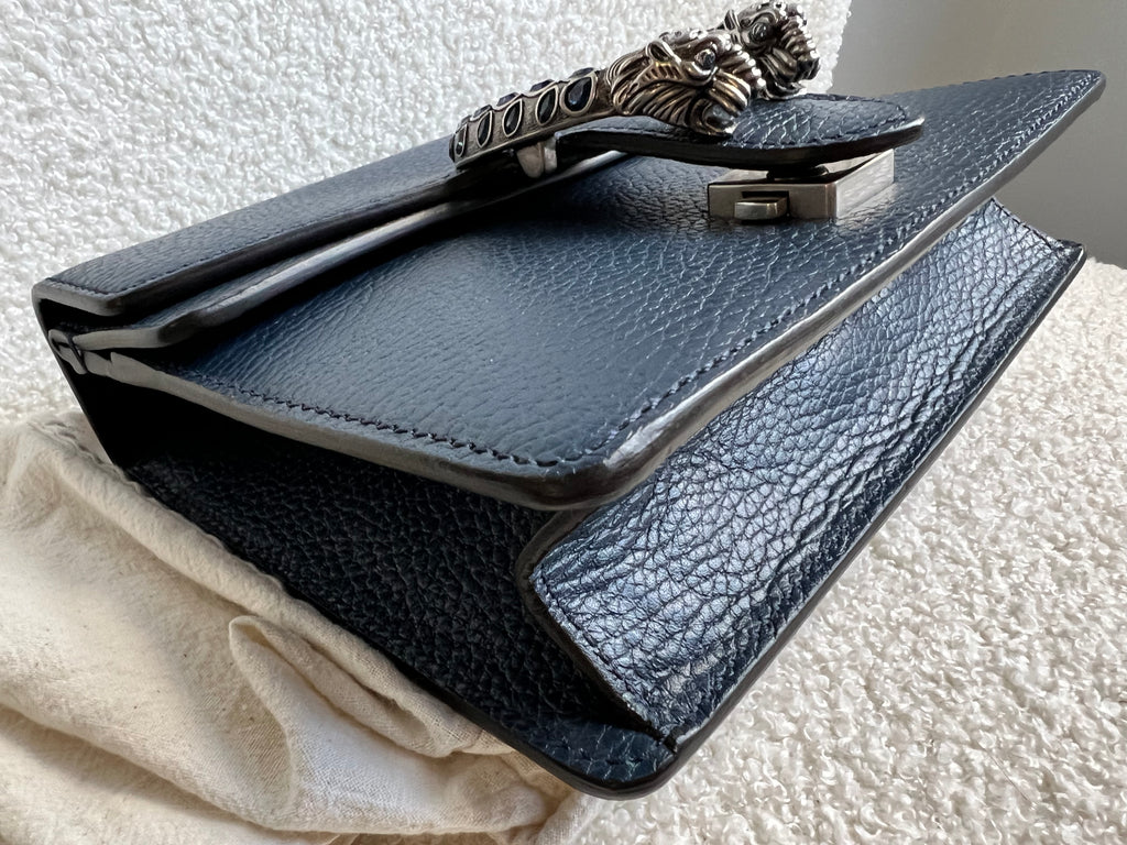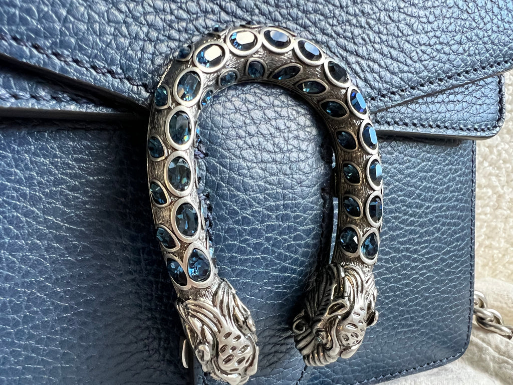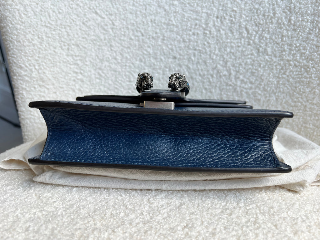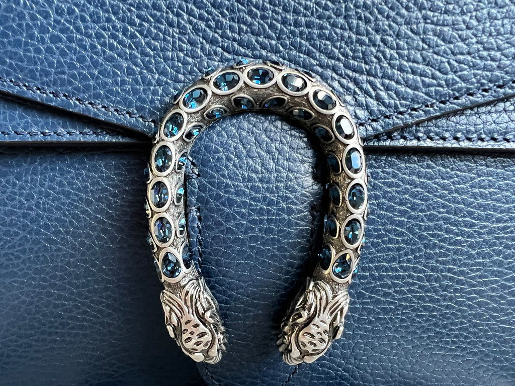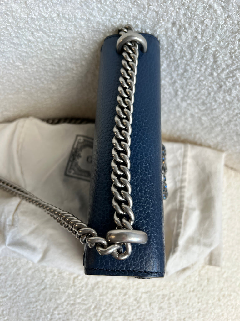 Gucci Dionysus Mini bag in Navy Blue grained calf leather with antique silver hardware. The tiger head closure is enhanced with Swarovski crystals. The sliding chain strap can be worn multiple ways, changing between a shoulder and a top handle bag.
