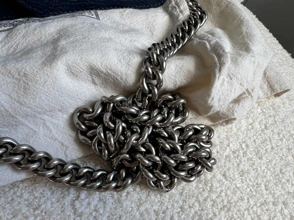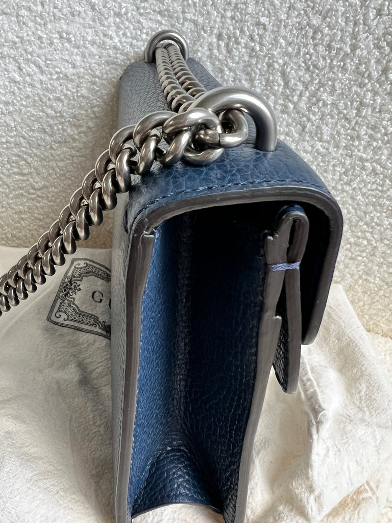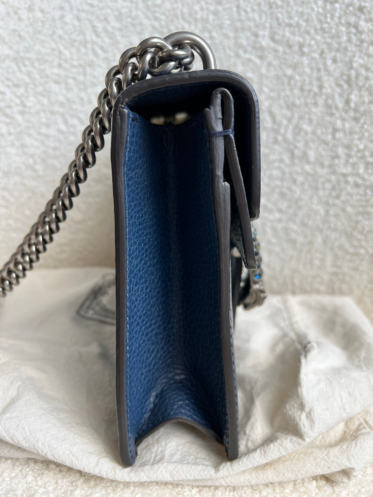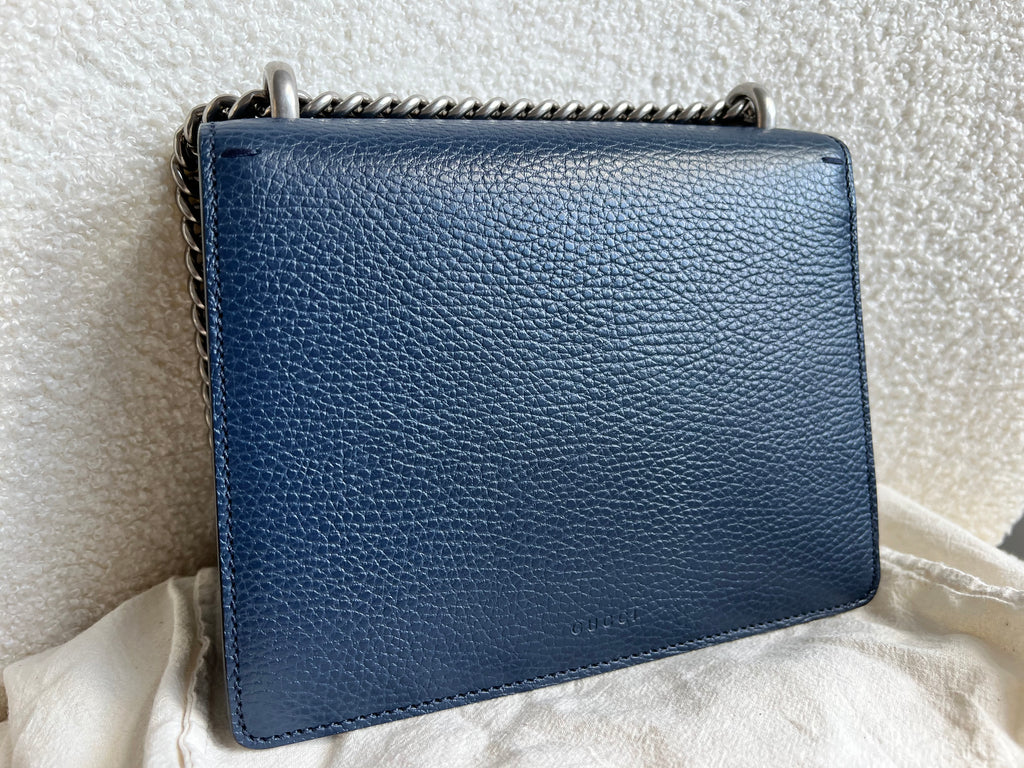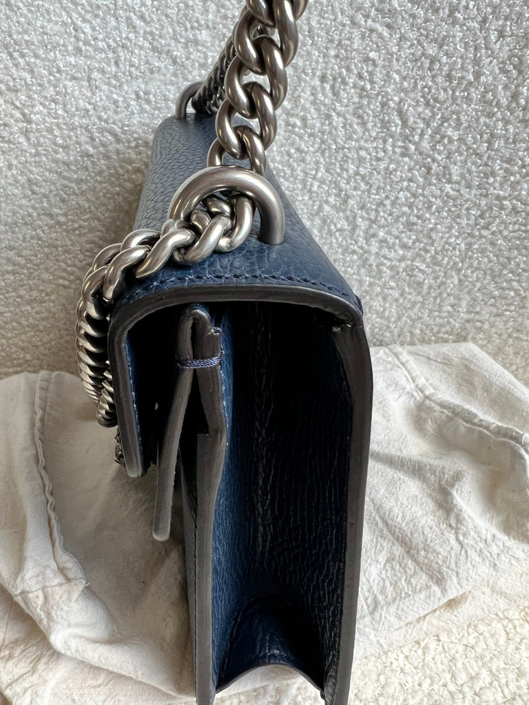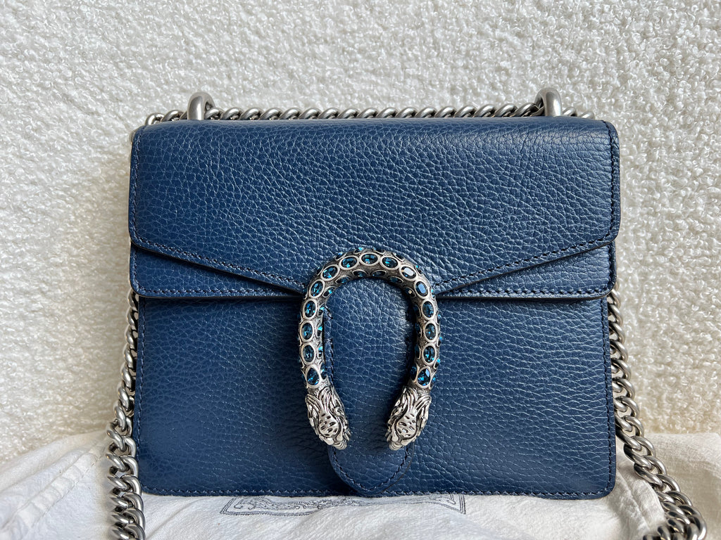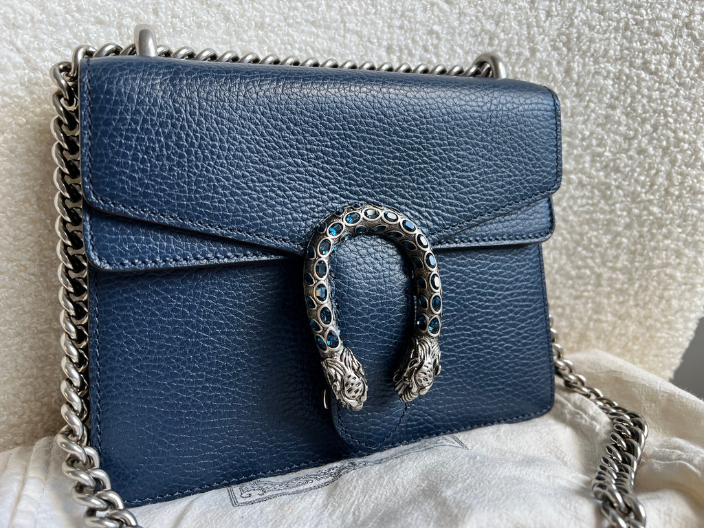 Gucci Dionysus Mini bag in Navy Blue grained calf leather with antique silver hardware. The tiger head closure is enhanced with Swarovski crystals. The sliding chain strap can be worn multiple ways, changing between a shoulder and a top handle bag.