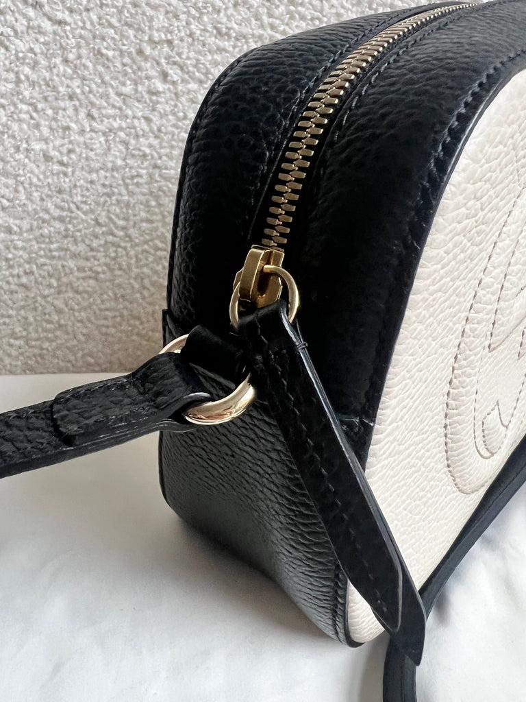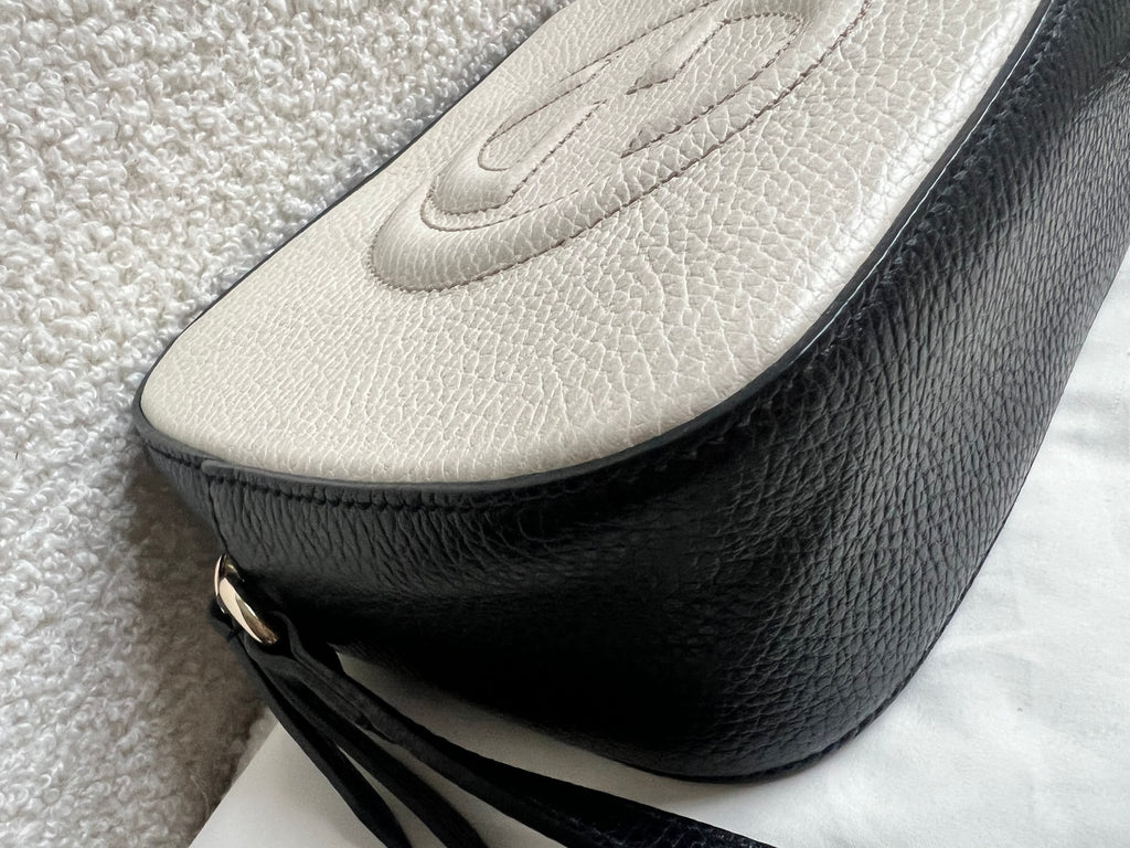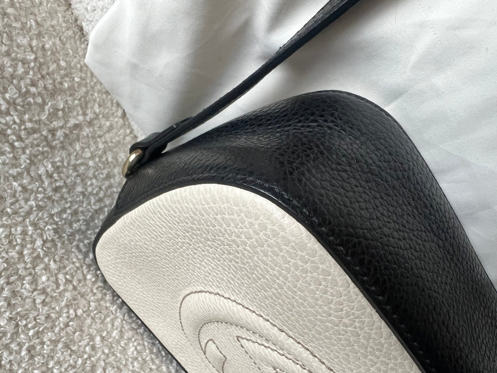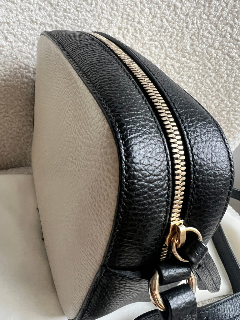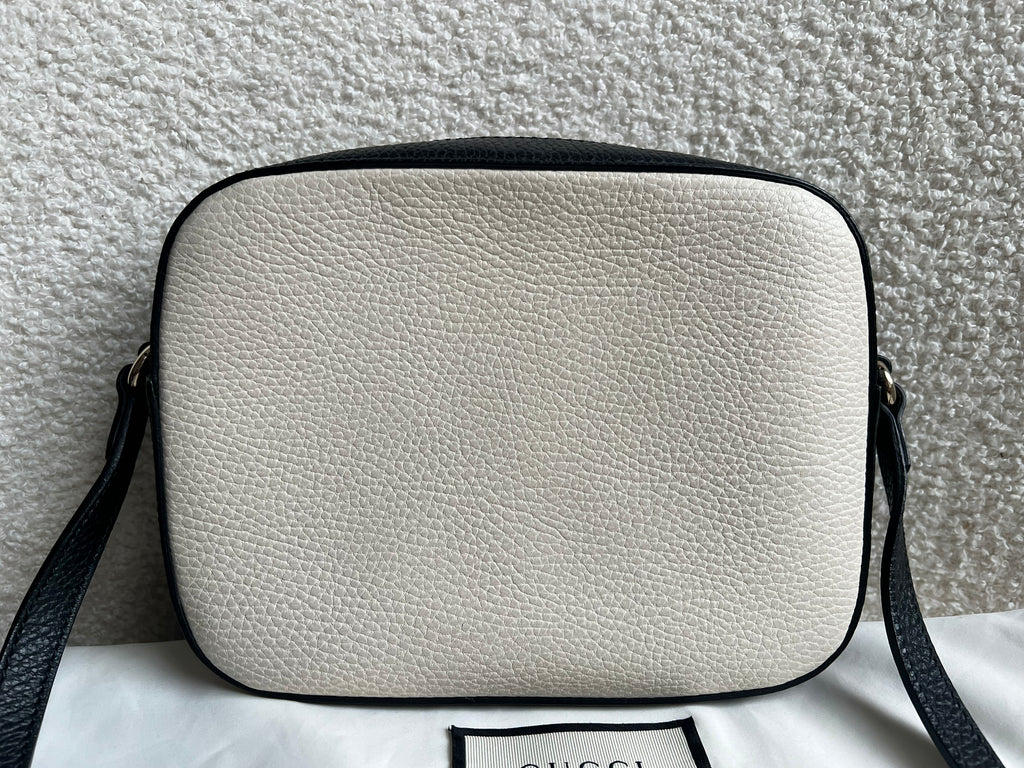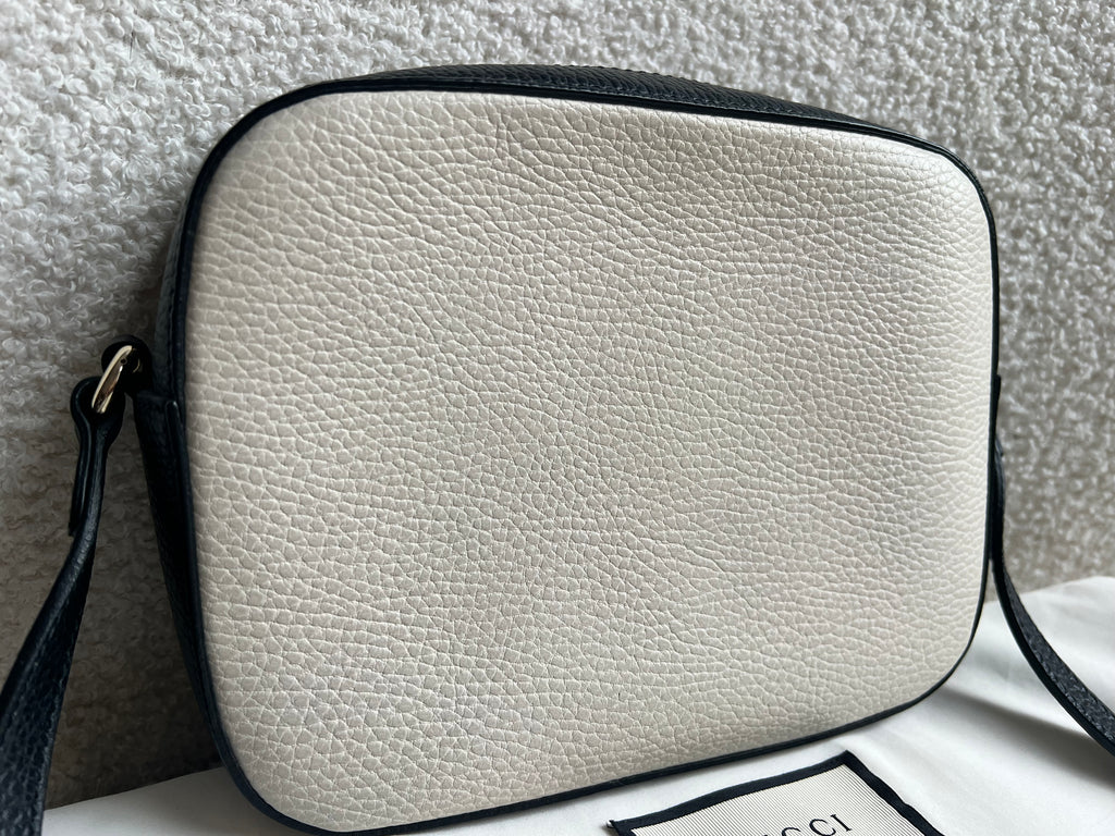 Gucci Bicolour Soho Disco in Black and White Leather with pale gold hardware. Note it is more of a pale cream shade than pure white. This practical, cross body, camera style bag is compact in size but still fits a reasonable amount. Can be worn over shoulder or cross body. Gucci's most popular style and goes with any outfit, dressed up or down. Now discontinued, the bi colour version does not come up preloved often. Note the bicolour version does not come with leather tassel.