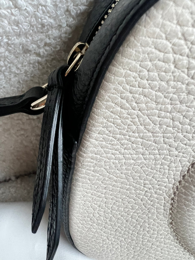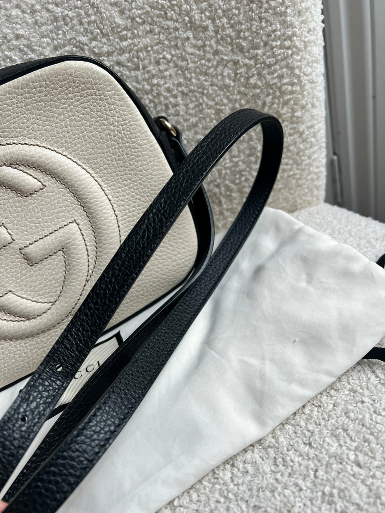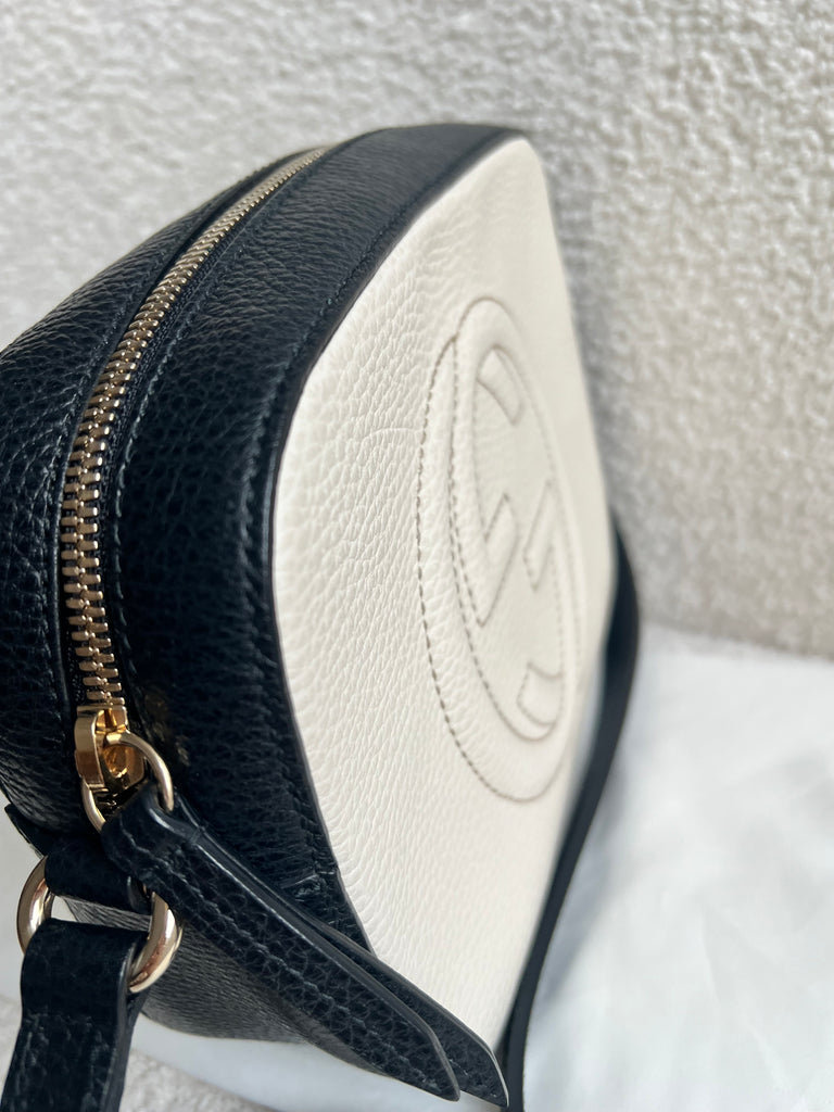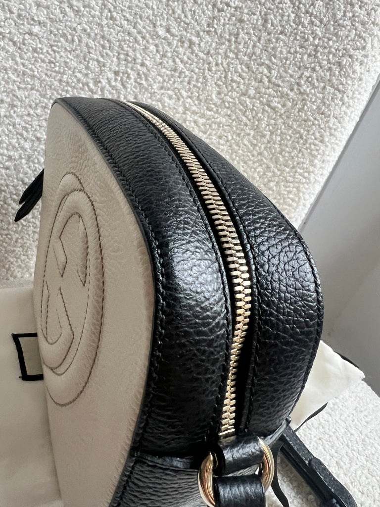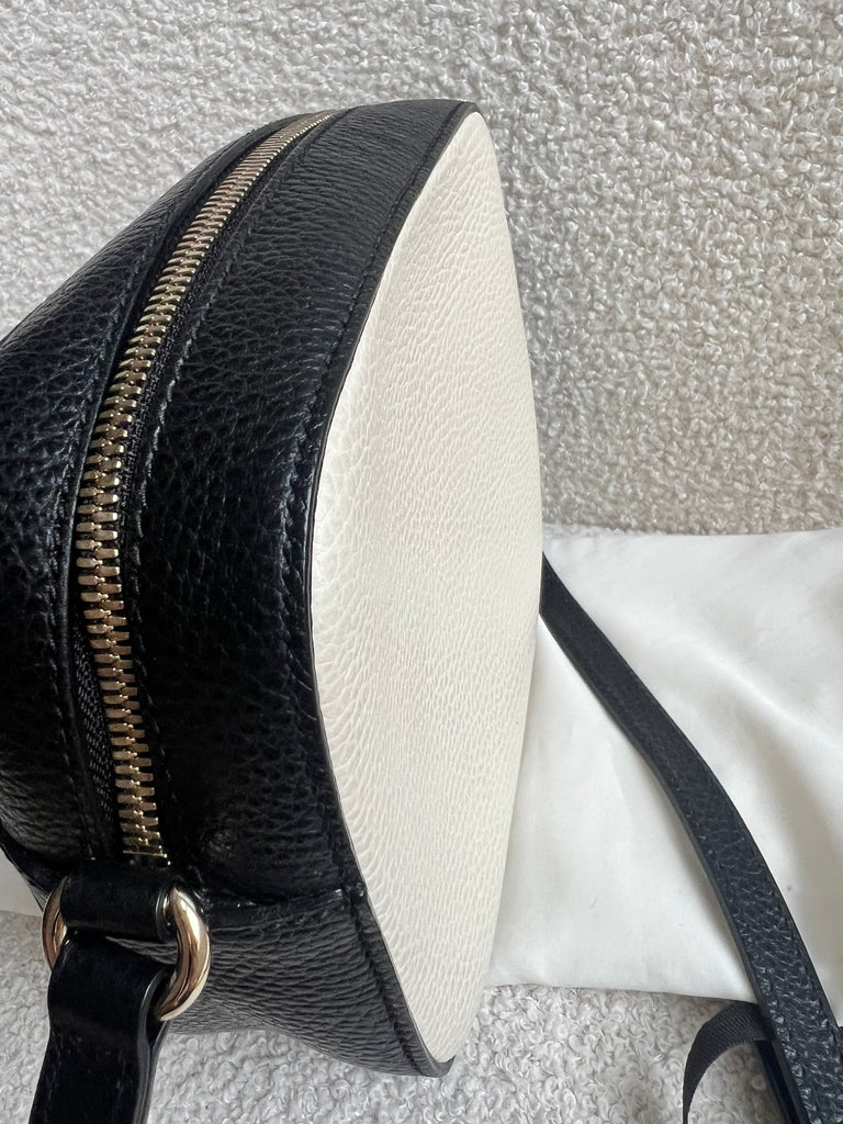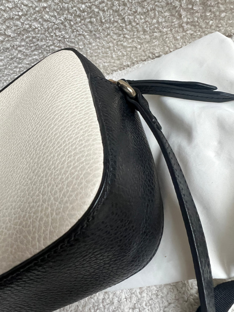 Gucci Bicolour Soho Disco in Black and White Leather with pale gold hardware. Note it is more of a pale cream shade than pure white. This practical, cross body, camera style bag is compact in size but still fits a reasonable amount. Can be worn over shoulder or cross body. Gucci's most popular style and goes with any outfit, dressed up or down. Now discontinued, the bi colour version does not come up preloved often. Note the bicolour version does not come with leather tassel.