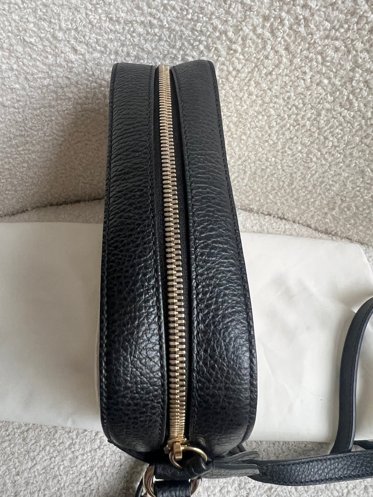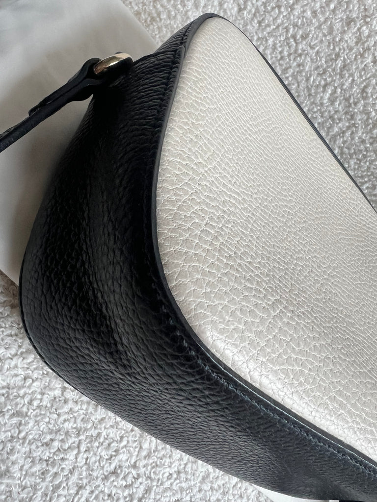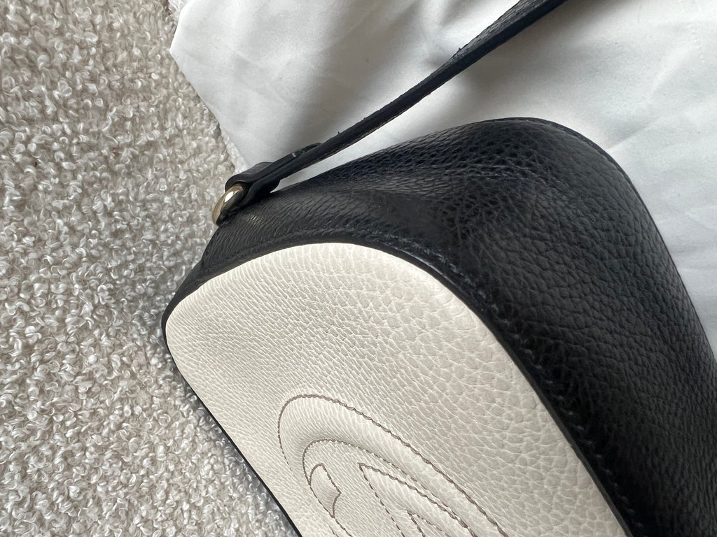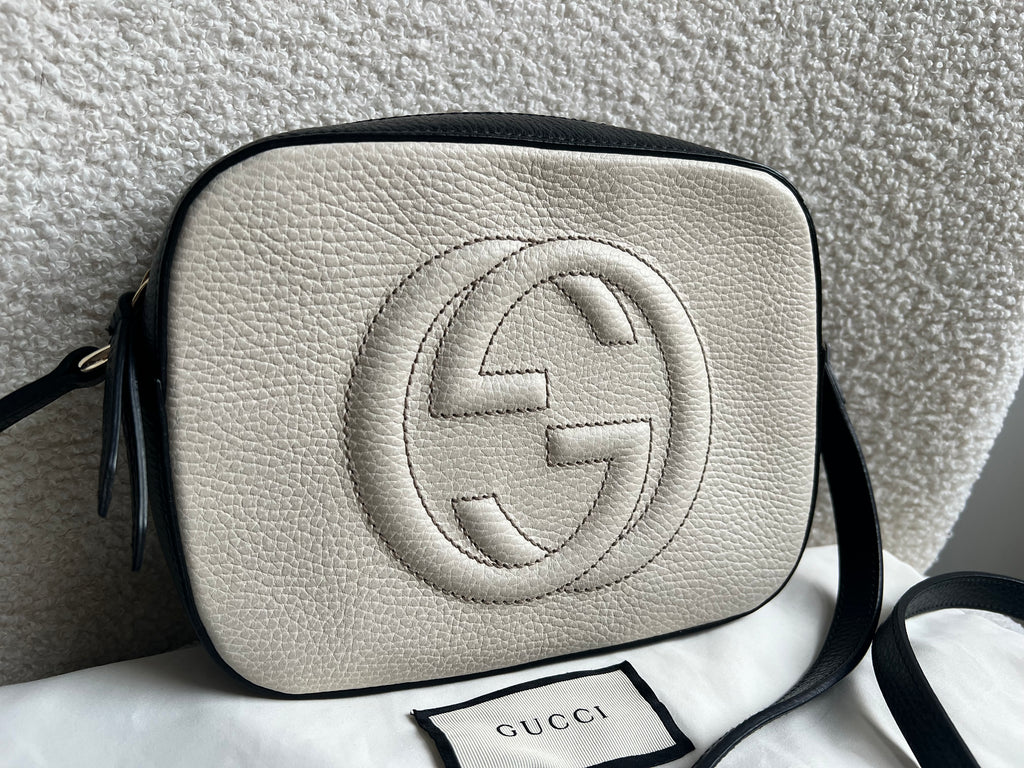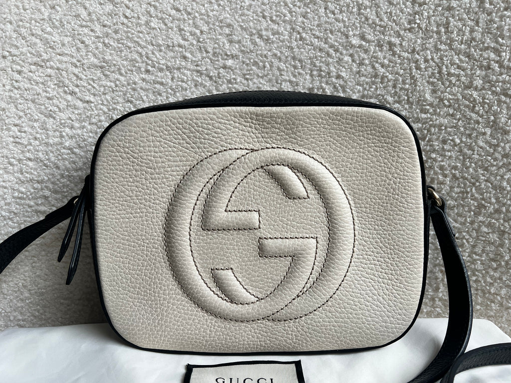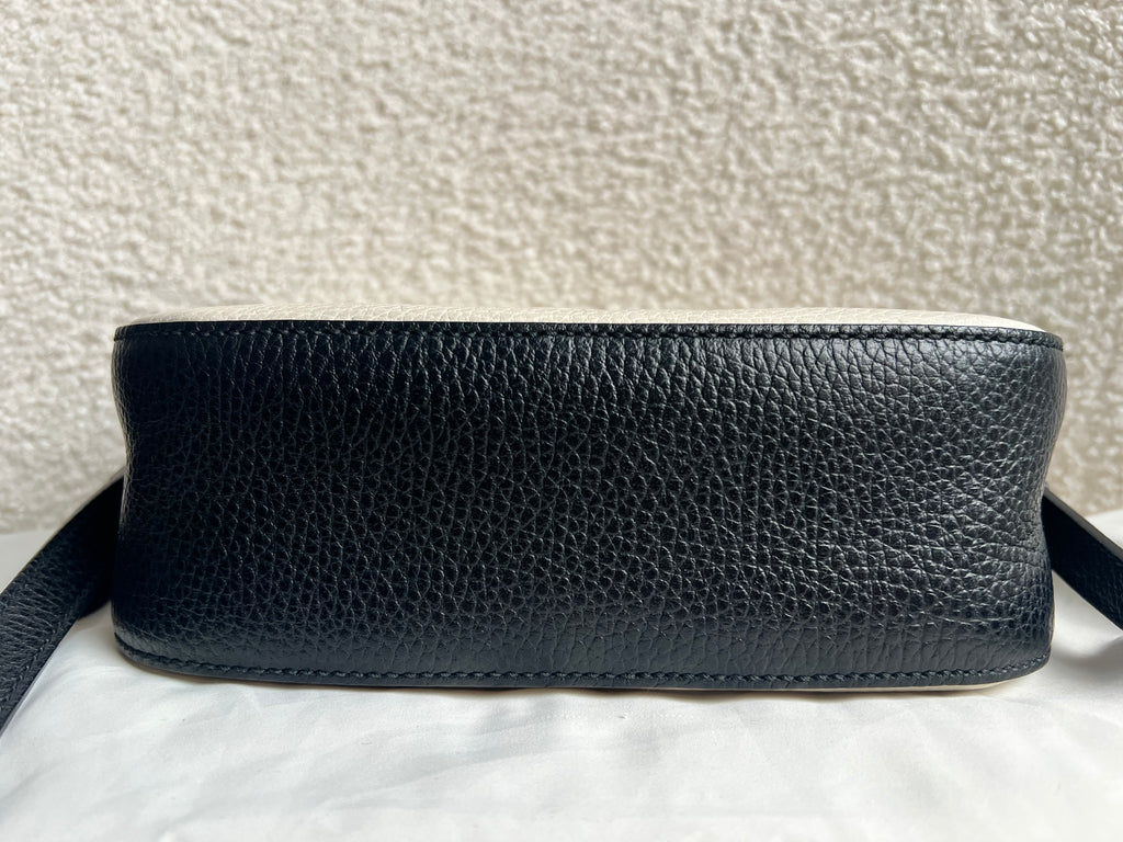 Gucci Bicolour Soho Disco in Black and White Leather with pale gold hardware. Note it is more of a pale cream shade than pure white. This practical, cross body, camera style bag is compact in size but still fits a reasonable amount. Can be worn over shoulder or cross body. Gucci's most popular style and goes with any outfit, dressed up or down. Now discontinued, the bi colour version does not come up preloved often. Note the bicolour version does not come with leather tassel.