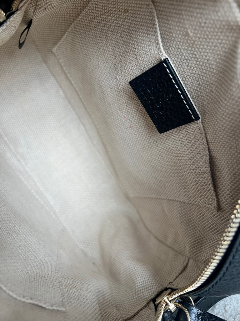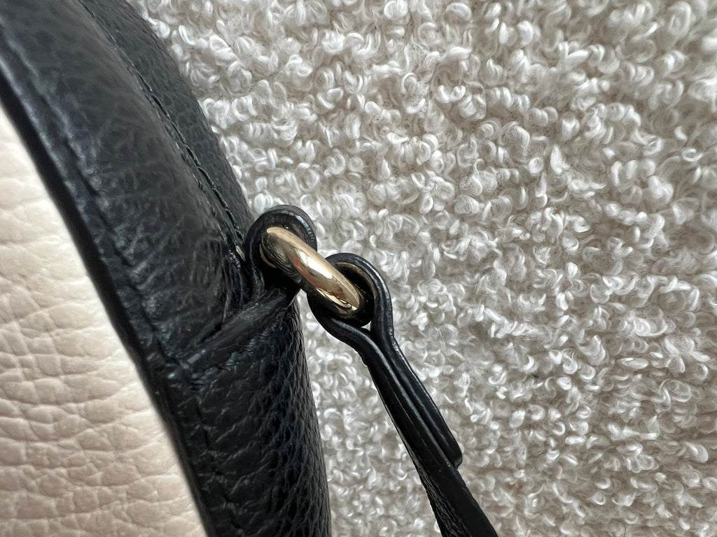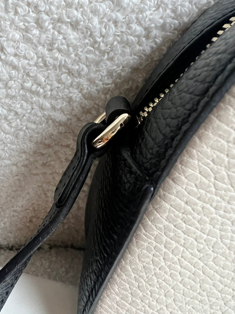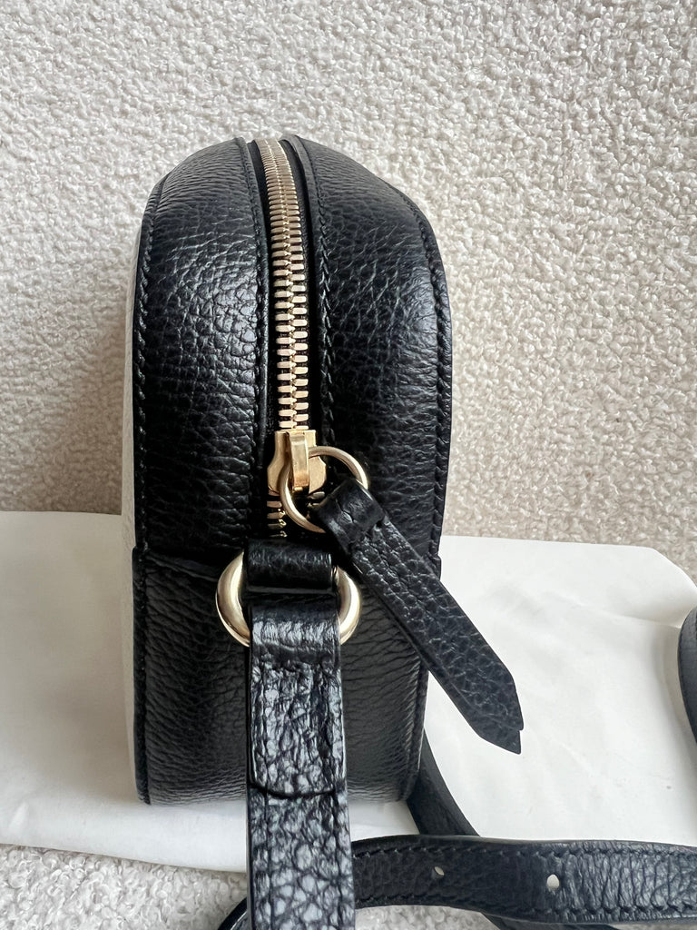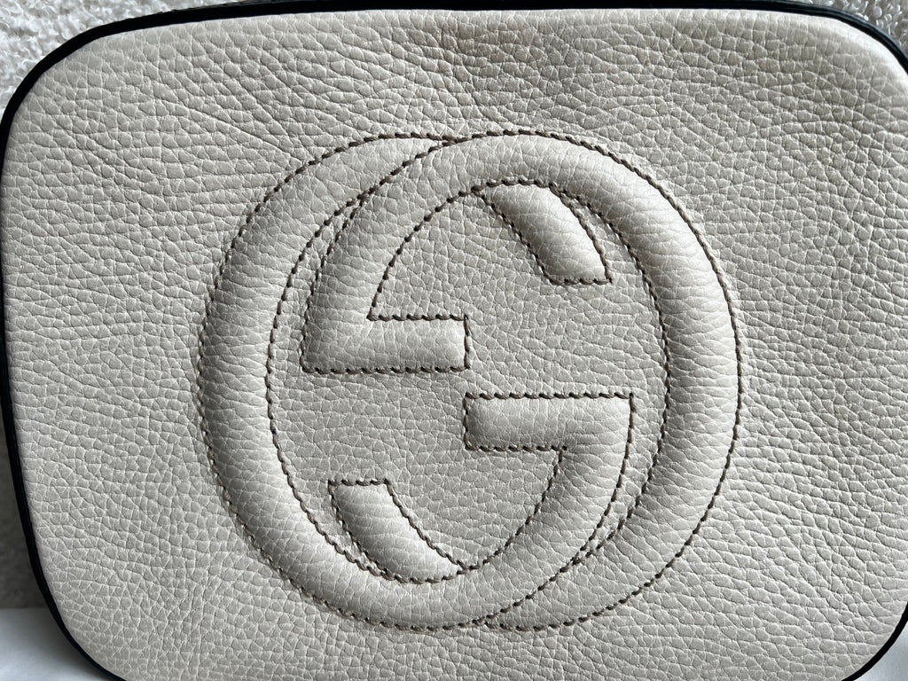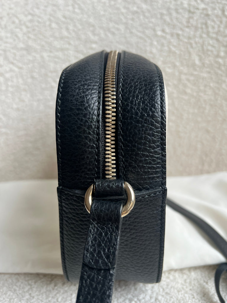 Gucci Bicolour Soho Disco in Black and White Leather with pale gold hardware. Note it is more of a pale cream shade than pure white. This practical, cross body, camera style bag is compact in size but still fits a reasonable amount. Can be worn over shoulder or cross body. Gucci's most popular style and goes with any outfit, dressed up or down. Now discontinued, the bi colour version does not come up preloved often. Note the bicolour version does not come with leather tassel.